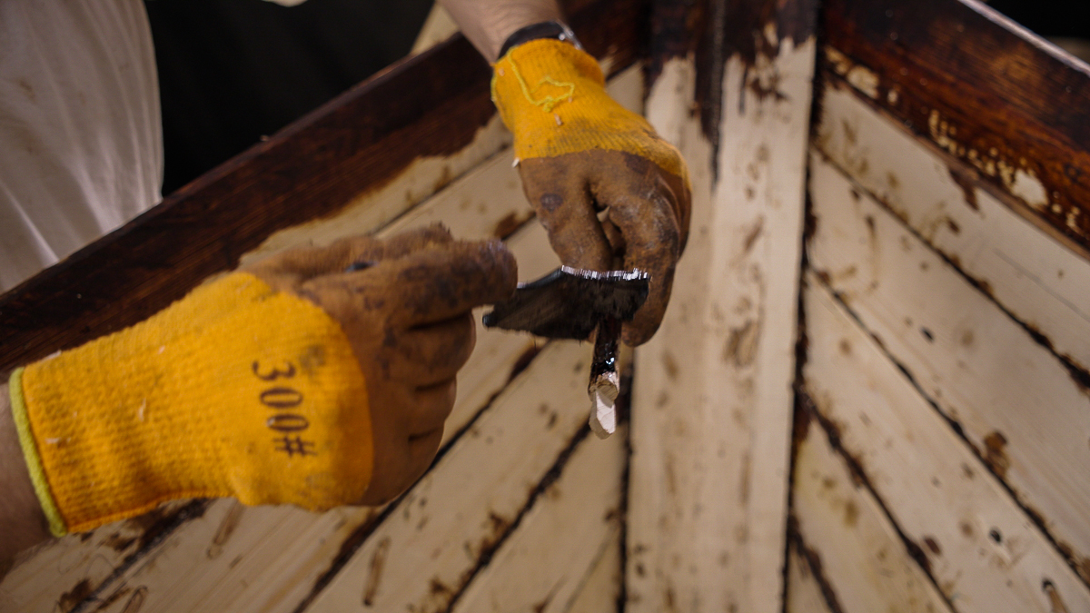 Перед установкой детали Иван обрабатывает места соединения и сам брештук смолой, отчего и ангар, и оператор, и в особенности сам Иван пахнут печной копотью.