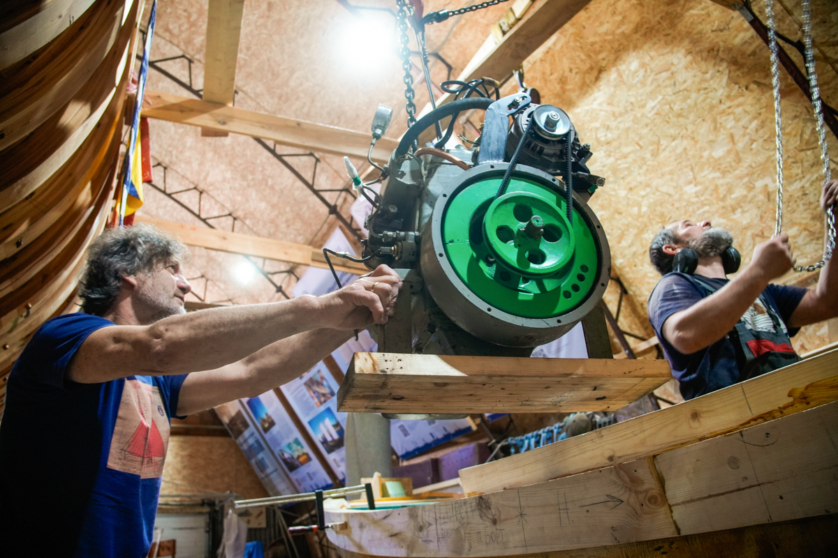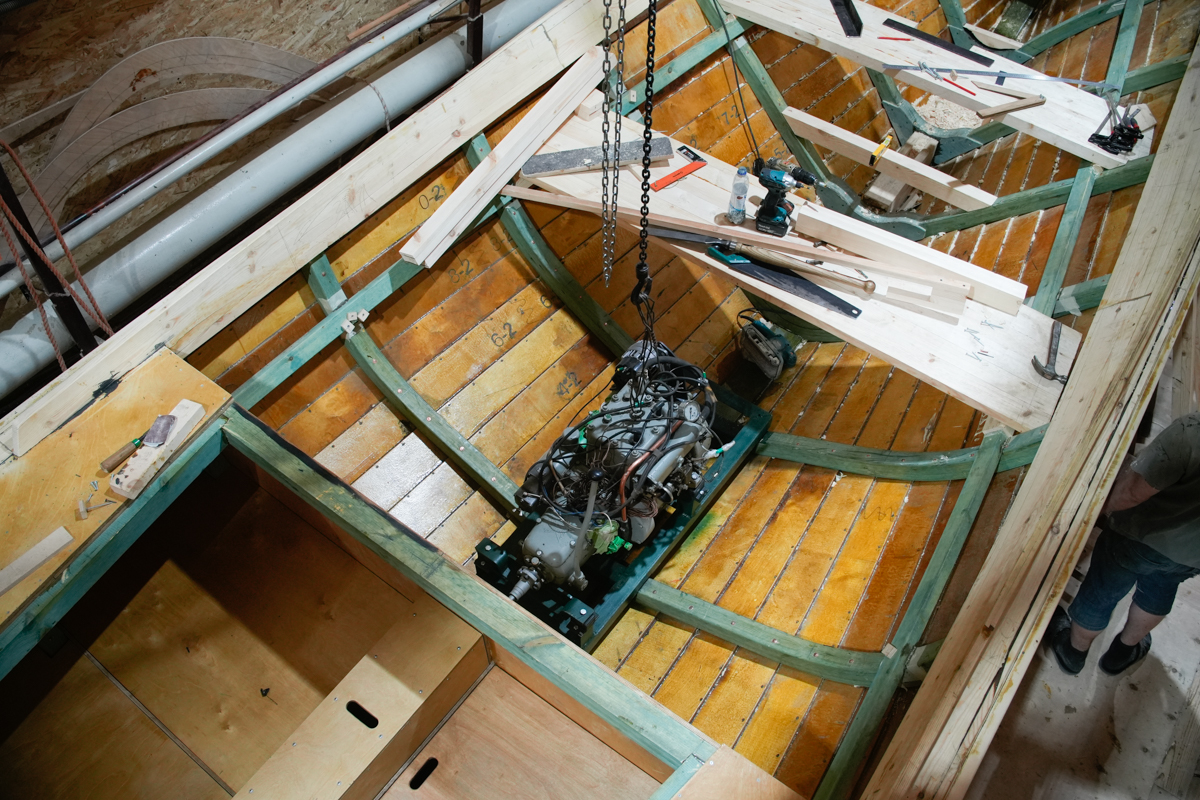 Чудный морской двигатель «Вольво пента» достался Жене вместе с участком под карбас-музей в Кальчино. Александр-механик долго приводил его в порядок: то выписывал из Москвы конденсаторы, потому что не работало магнето, то ставил рычаг газа, то дополнял конструкцию ВАЗовским генератором для зарядки аккумулятора, чтобы заводить мотор можно было со стартера, а не ручкой…