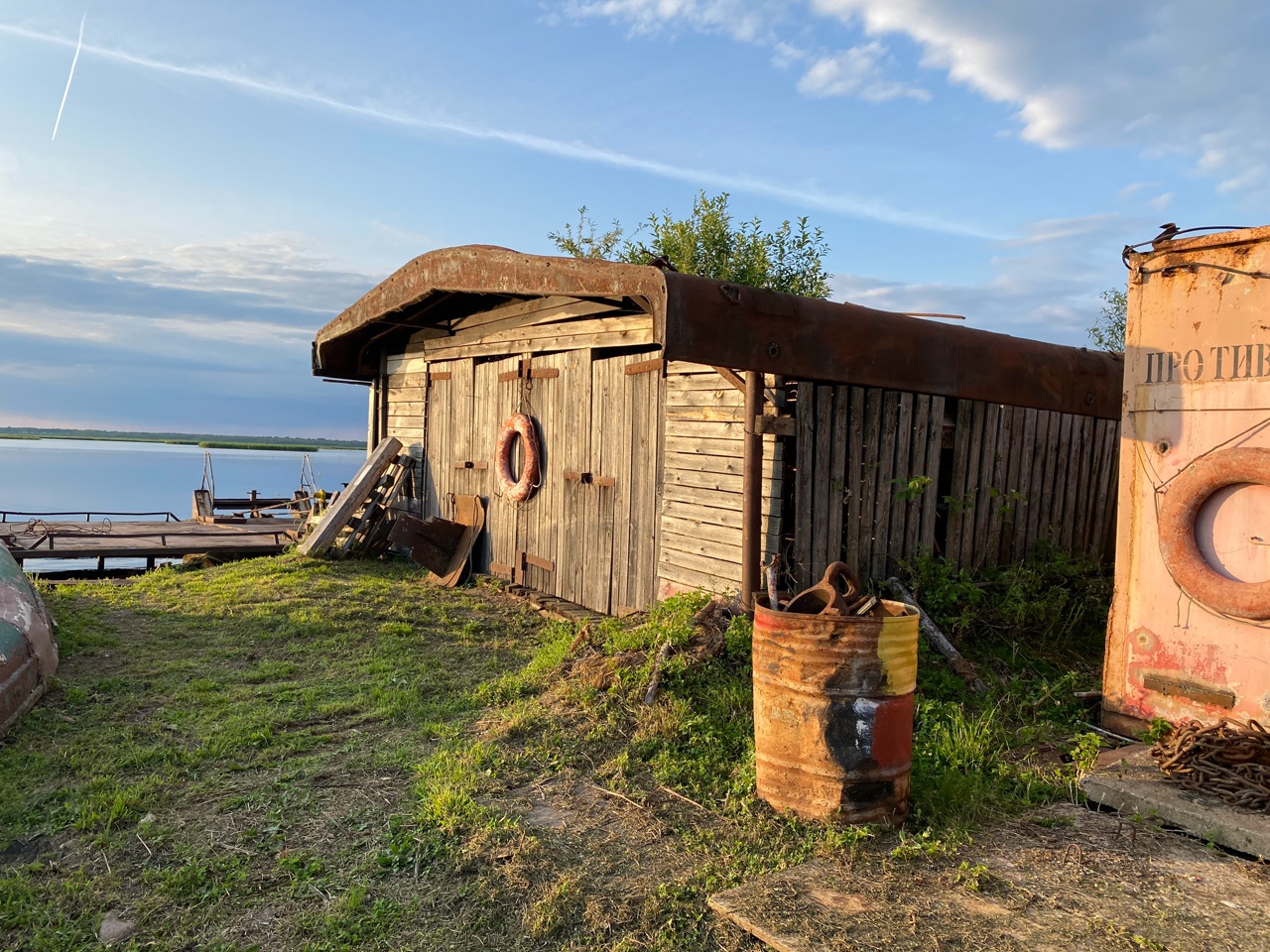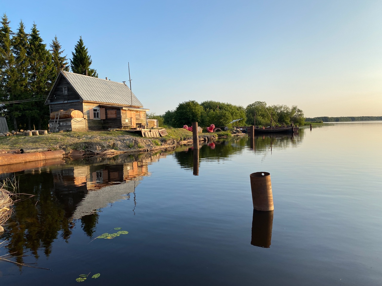 1930, вернулись на остров Юголовский. Здесь баржа-причал и небольшая лоцманская база. Жилая, но никого нет. Только комары и наглый заяц скачет по кустам. Есть разрушенный храм, но мы не знаем, как к нему пройти. Причалили и разбили первый лагерь. Нет сил искать что-то еще. Завели кухню и ужинаем на барже. Шикарный вид.