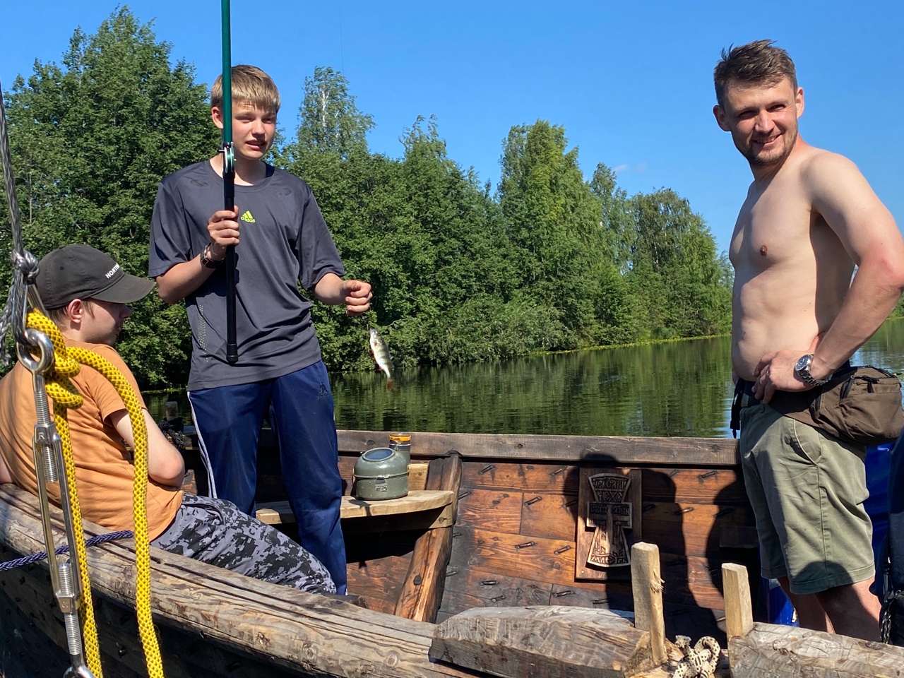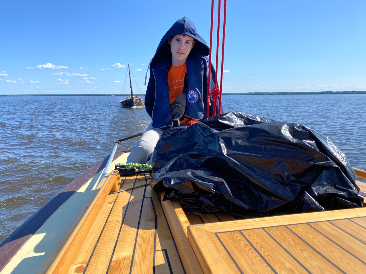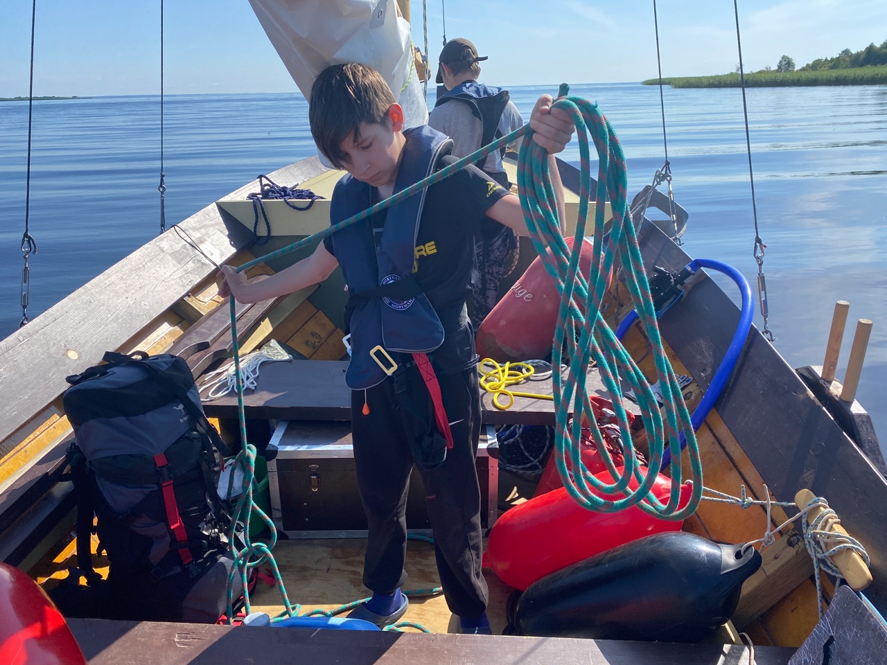 1615, снялись с якоря. Делегировал все якорные, швартовые и буксирные дела детям. Норм. Выбрать якорь, разложить якорную веревку правильно, развесить кранцы – со всем этим в спокойной обстановке они нормально справляются.