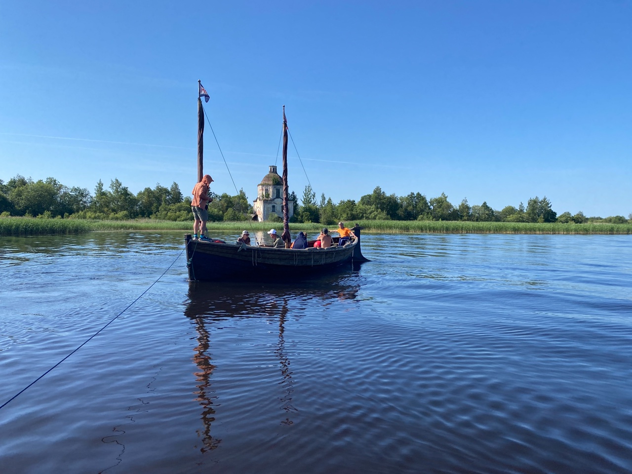 0940, для первого раза довольно быстро собрали лагерь. Отошли от приютившей нас ржавой баржи. Сунули нос за угол острова Югаловский, чтобы посмотреть на разрушенный храм, и двинули дальше.
