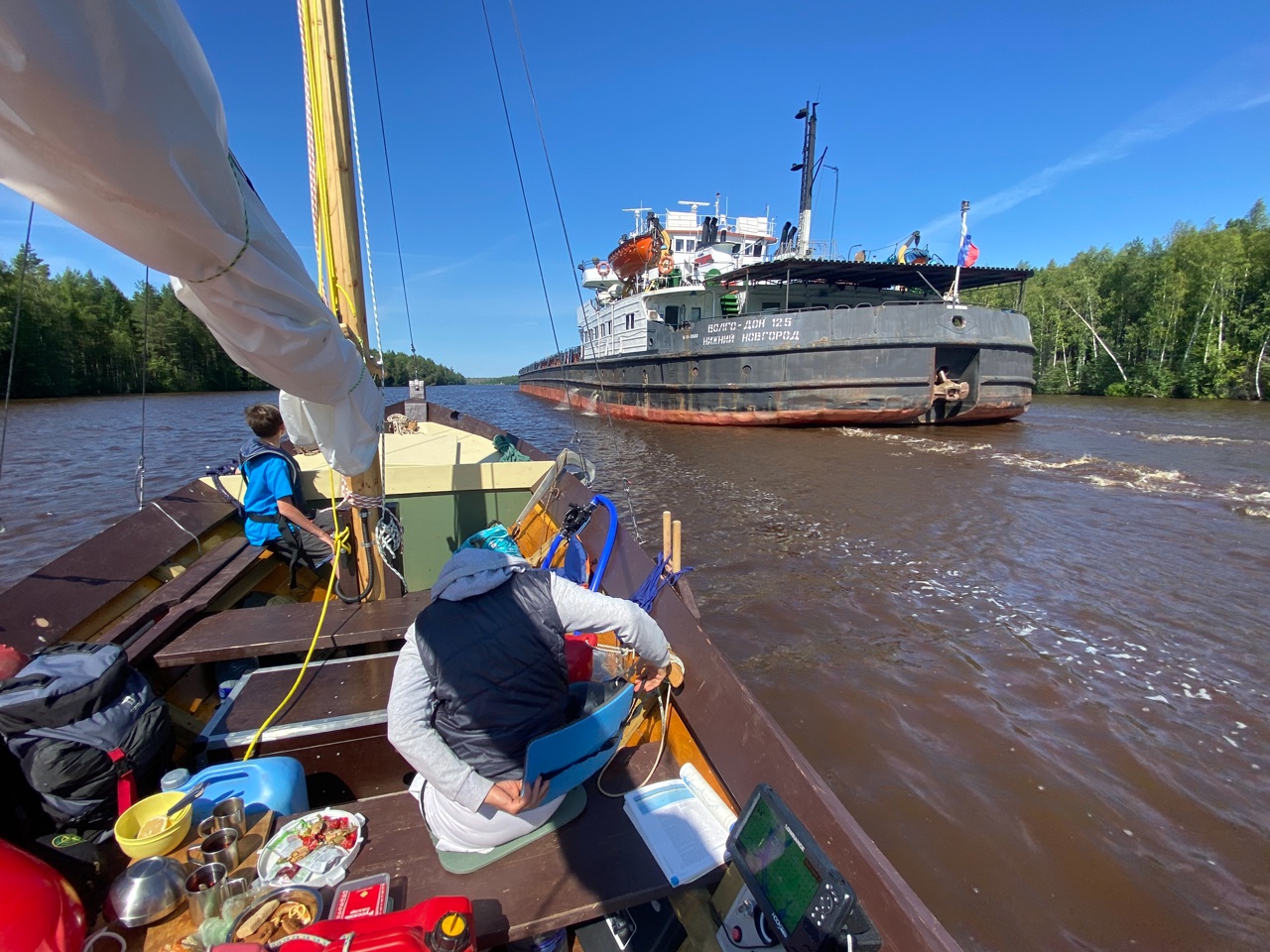 Судно «Капитан Клочко» вышло из-за поворота, представилось на пятом канале. Предложили сбавить ход, проходя мимо нас. Замечательно культурные люди эти профессионалы!