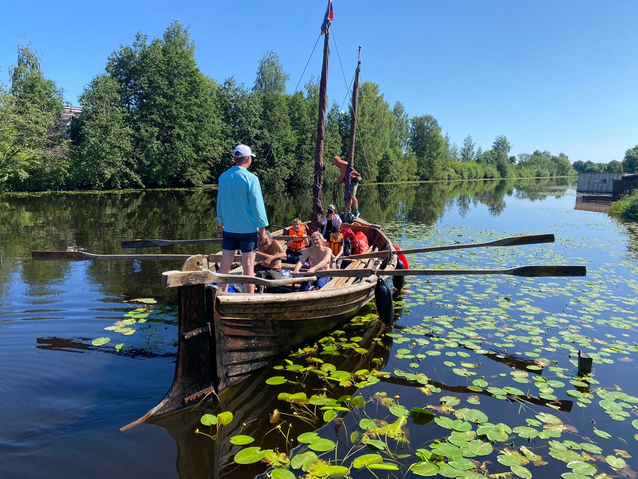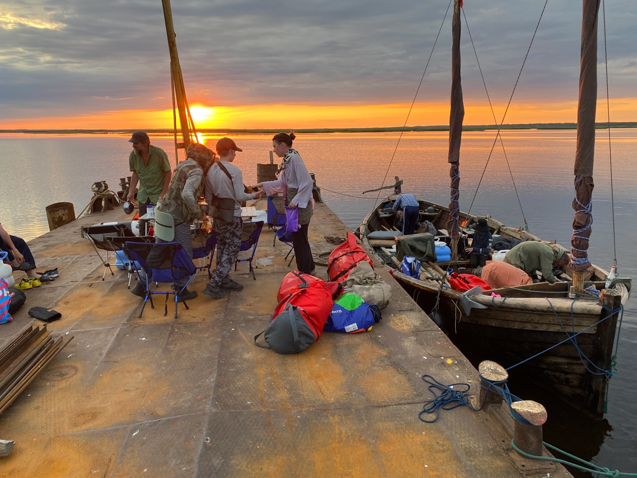 Лодки «Ёла» и «Матера» благополучно отдохнули среди кувшинок старого обводного канала рядом с ржавыми корпусами местных моторных посудин. Когда мы приехали из Архангельска, на лодках уже вовсю хозяйничали Чифан, Макс и Туся. Чифан с Максом — ветераны Мангазейской эпопеи прошлого года, поэтому хозяйство наше им прекрасно знакомо, вот и обед даже готов.