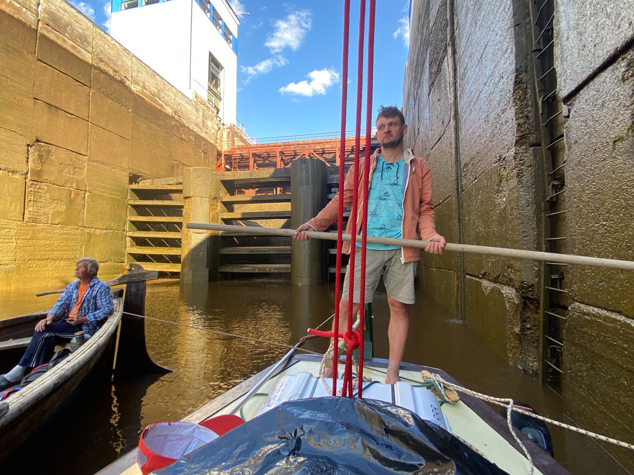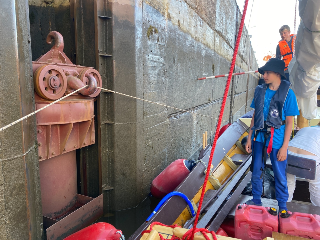 1030, зашли в шлюз 1. Нас подождали. Одни в камере. По-барски встаем в центр. Оказывается, зря. Если у рыма 1 при сбросе воды практически не чувствуется течение, то в середине камеры образуется сильное течение к выходу. Приходится упираться, чтобы не покарябать борта.