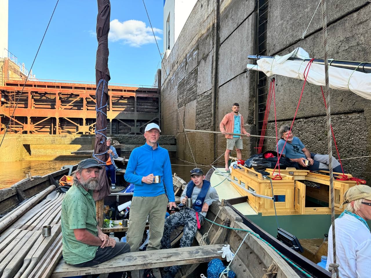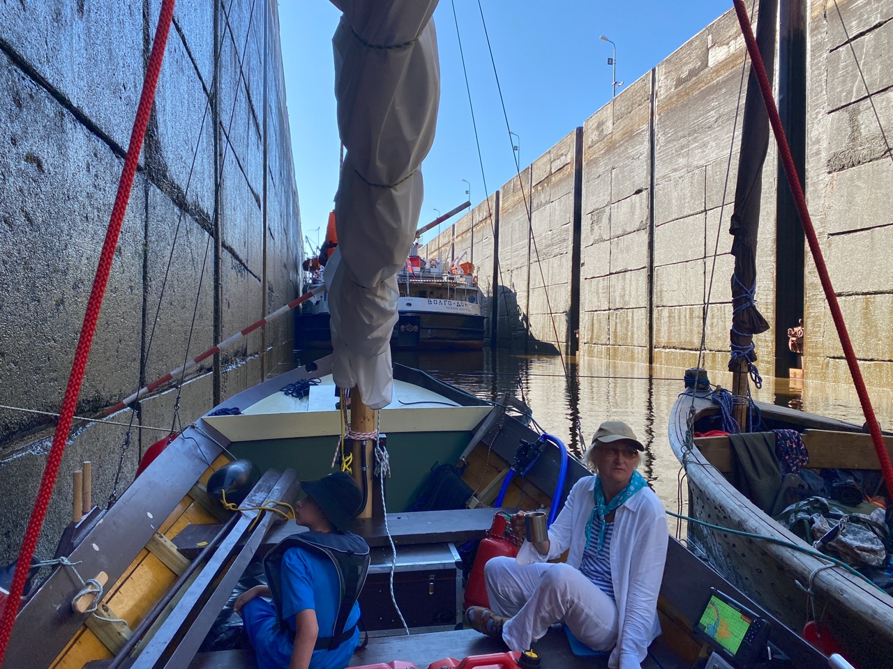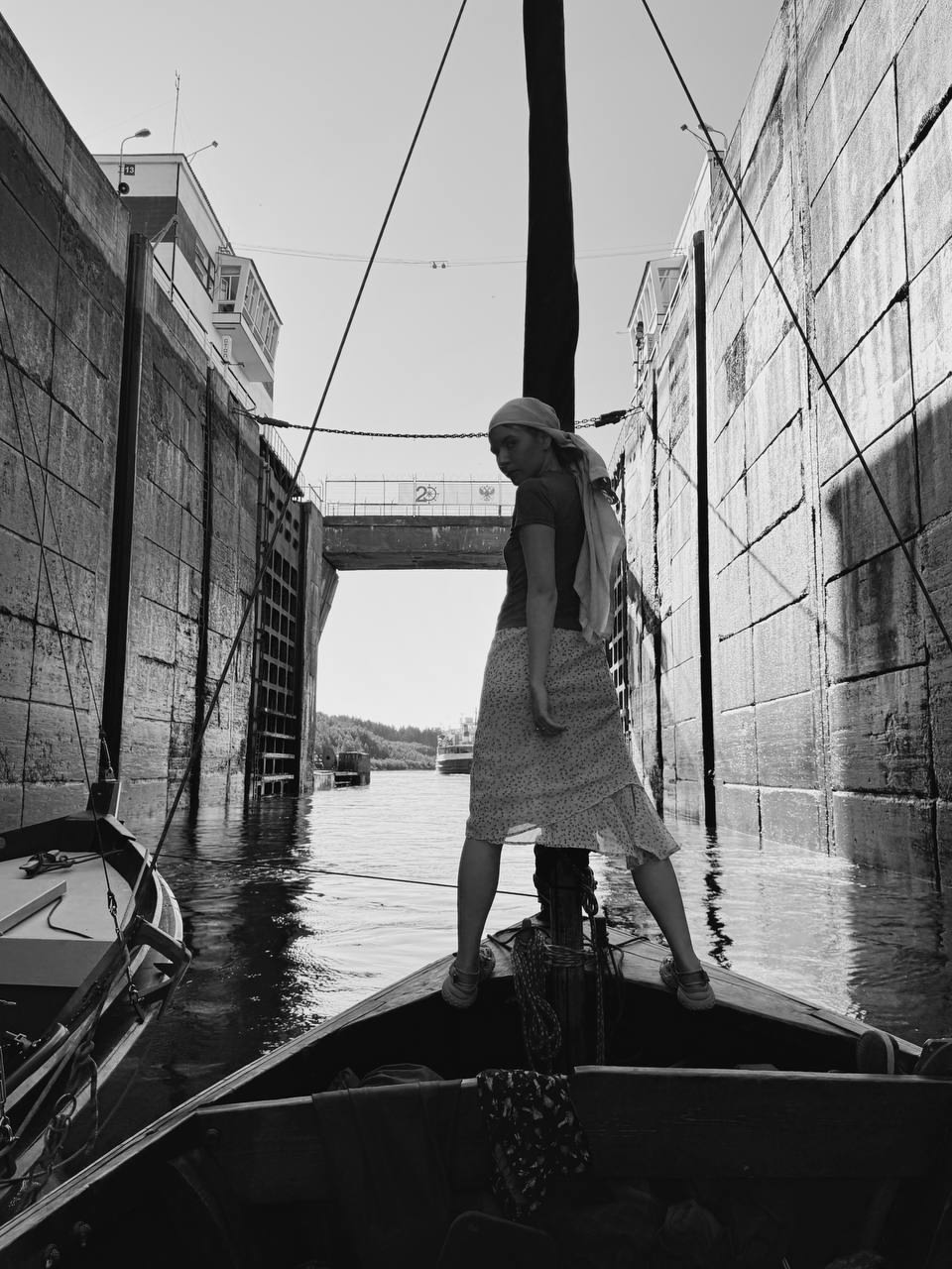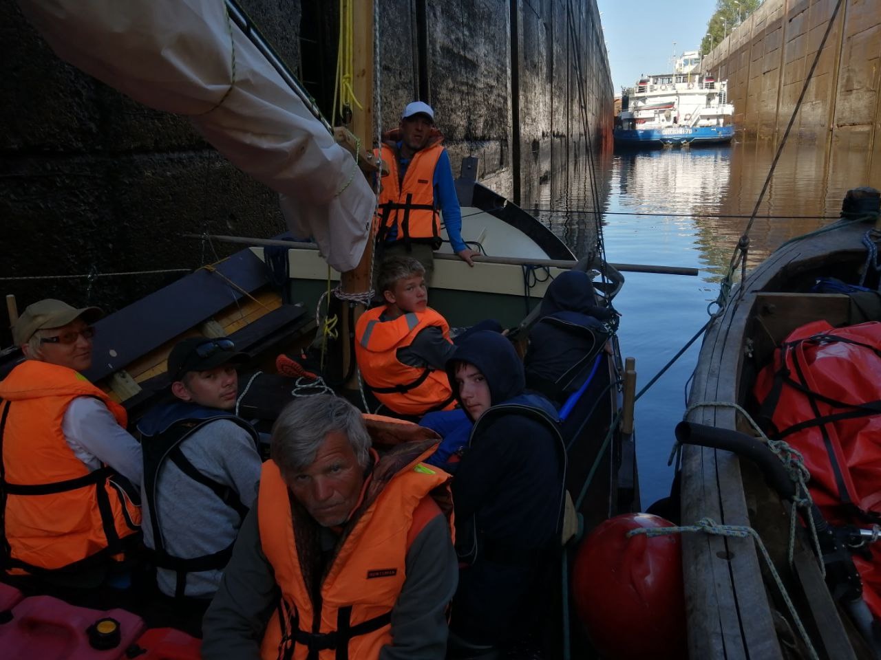 0635, зашли в шлюзовую камеру. Накинули швартов на рым 1 по левому борту. Двое с отпорными крюками стоят на изготовке на баке и на юте. Экипаж «Матеры» наряжен в спасжилеты, сидят у нас на борту. Сама «Матера» пришвартована к нашему правому борту.