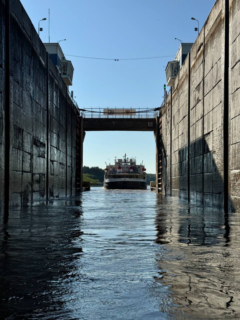 0715, зашли в шлюз. Так спешили, что подошли к самой корме «Окского» и получили в морду солидную струю воды. Нас развернуло на 360 градусов перед шлюзом. Хорошо, что мы были не в туннеле камеры. Решили близко к «Окскому» теперь не подходить.