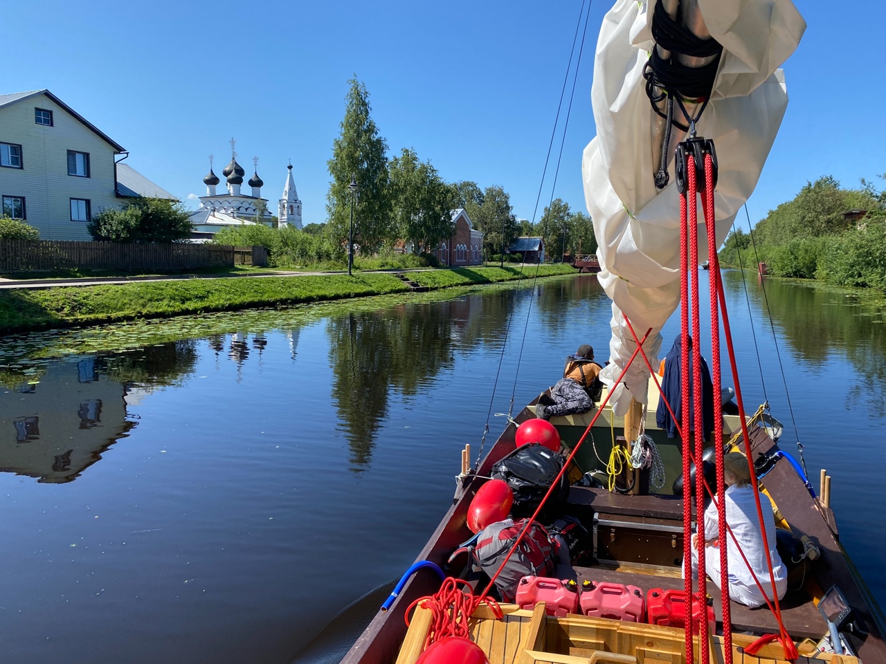 1049, отходим от гостеприимного причала гостиницы «Панорама». Жара. Солнце палит. Идем по каналу вдоль городской набережной.