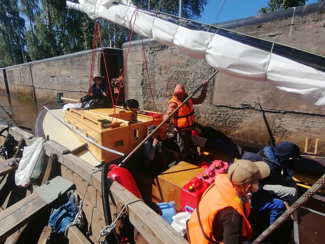 Вчера старшый диспетчер Мариинской системы очень настоятельно посоветовал нам встать пораньше и уже в шесть утра быть рядом с рейдом 5 шлюза. Начитавшись лоции о зверствах шлюзовых диспетчеров, о том, как яхты неделями не могут пройти эти гидротехнические сооружения, мы встали в пять и очень быстро собрали лагерь. Все возбуждены предстоящим приключением.
