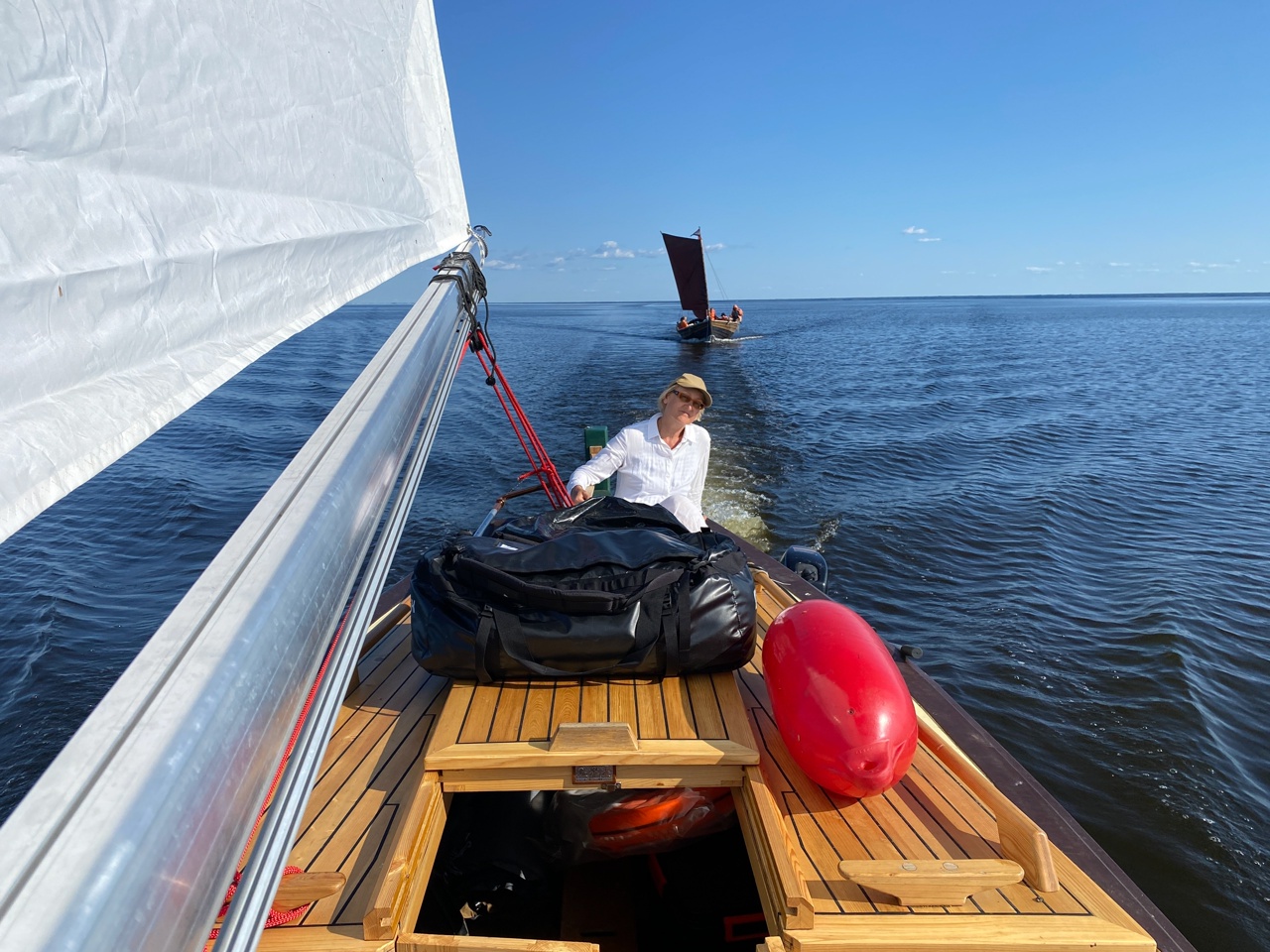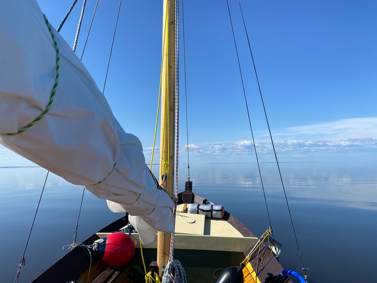 1815, мотор и буксир. Ветер разгонял нас до 2 узлов, поработал и, видимо, весь вышел. Белое солнце, белое небо и Белое озеро вокруг.