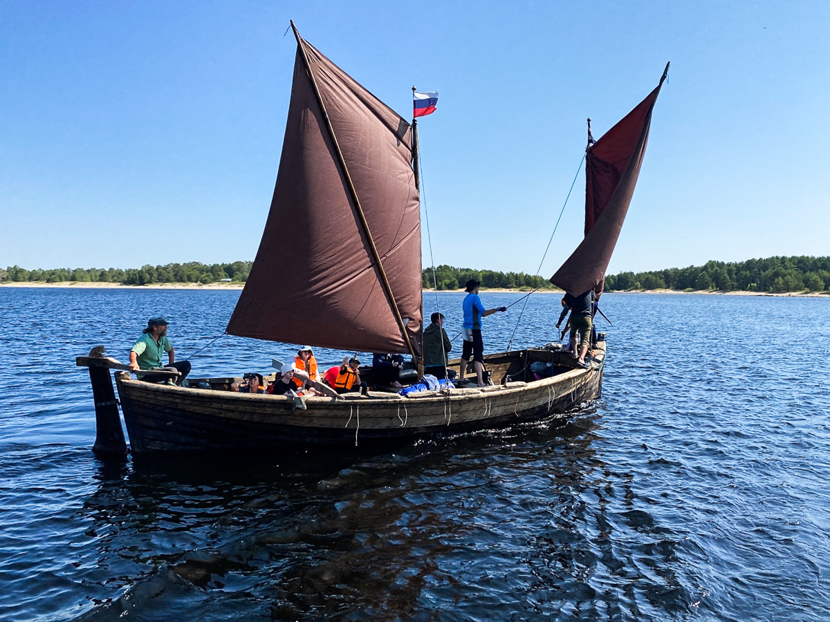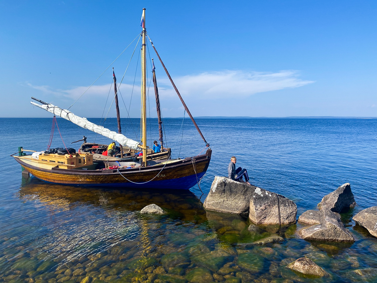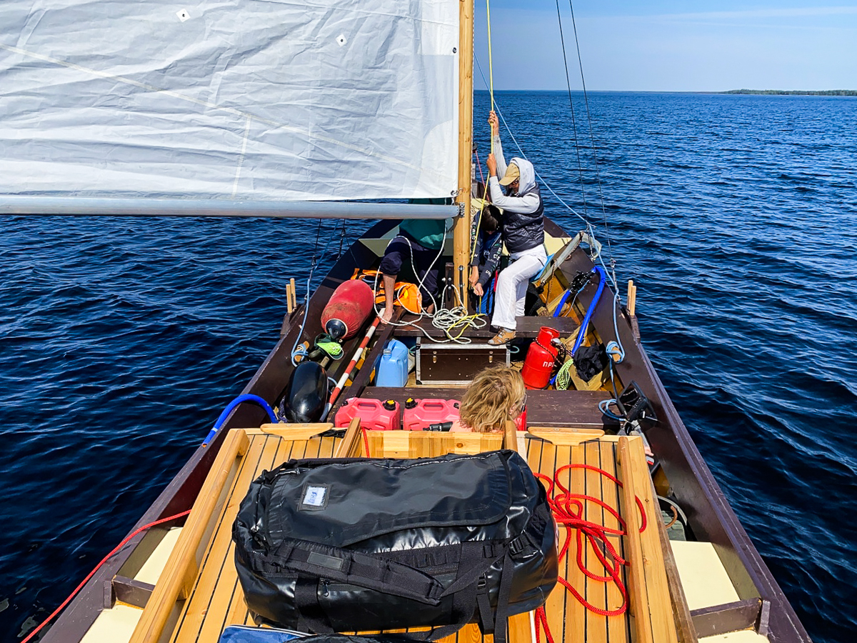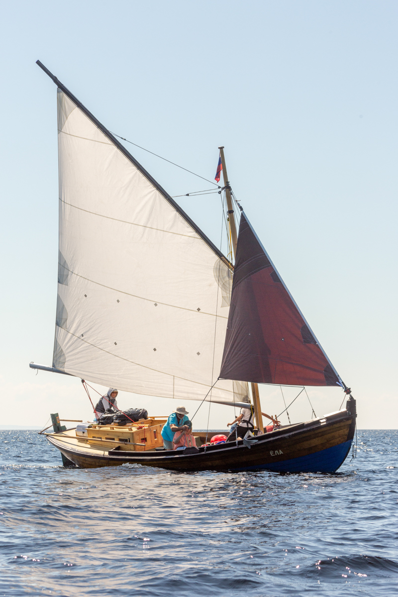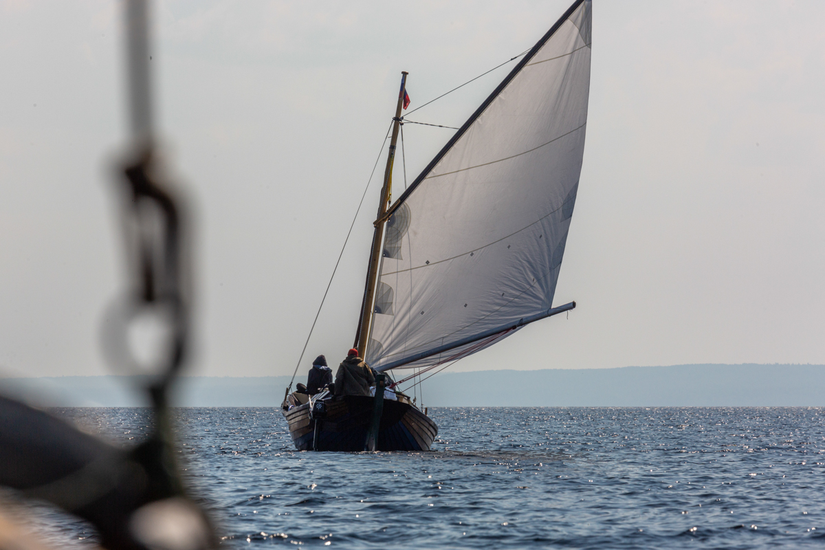 1200, поставили паруса на карбасе и на «Ёле». Разогнались на «Ёле» до 4 узлов. Впервые под парусом. Отлично идем. Лодка управляется. Скрутили оверштаг. У меня были сомнения по поводу поворотов, потому что судно полнокилевое. Неповоротливое. Но нет. Повороты под парусами крутит как положено.
