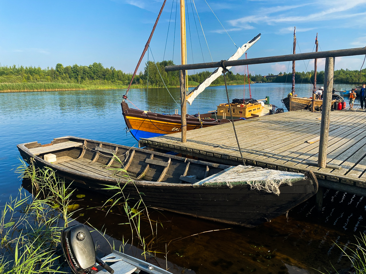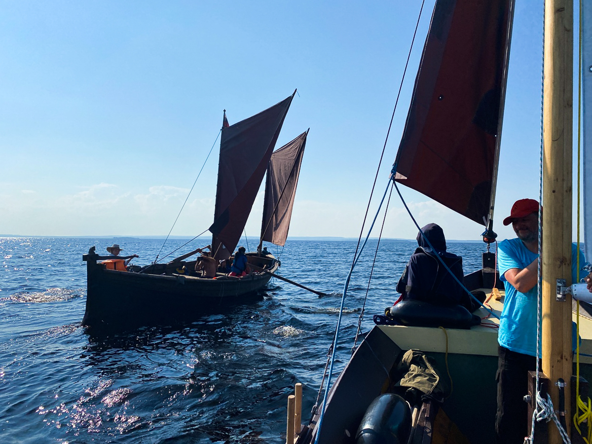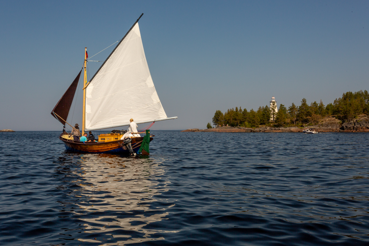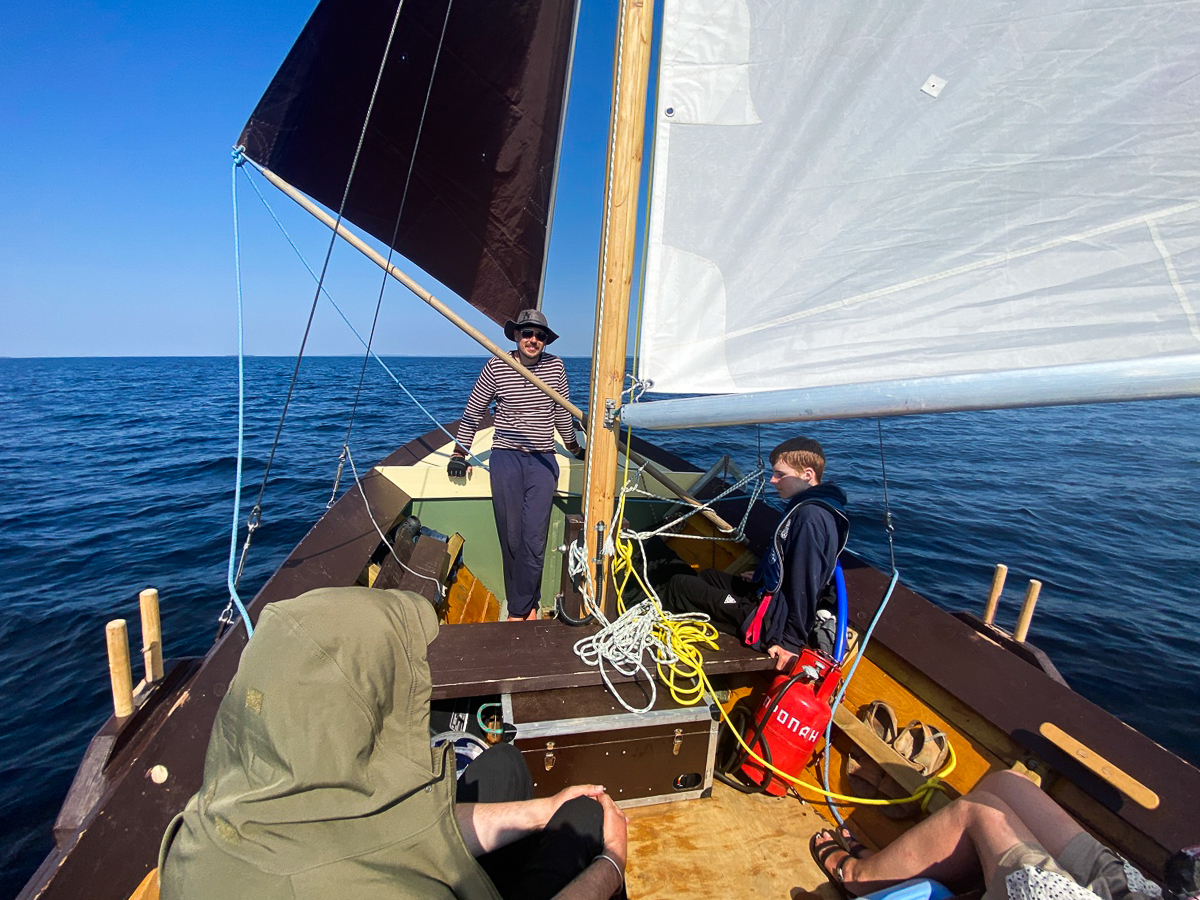 1200, поставили паруса на карбасе и на «Ёле». Разогнались на «Ёле» до 4 узлов. Впервые под парусом. Отлично идем. Лодка управляется. Скрутили оверштаг. У меня были сомнения по поводу поворотов, потому что судно полнокилевое. Неповоротливое. Но нет. Повороты под парусами крутит как положено.