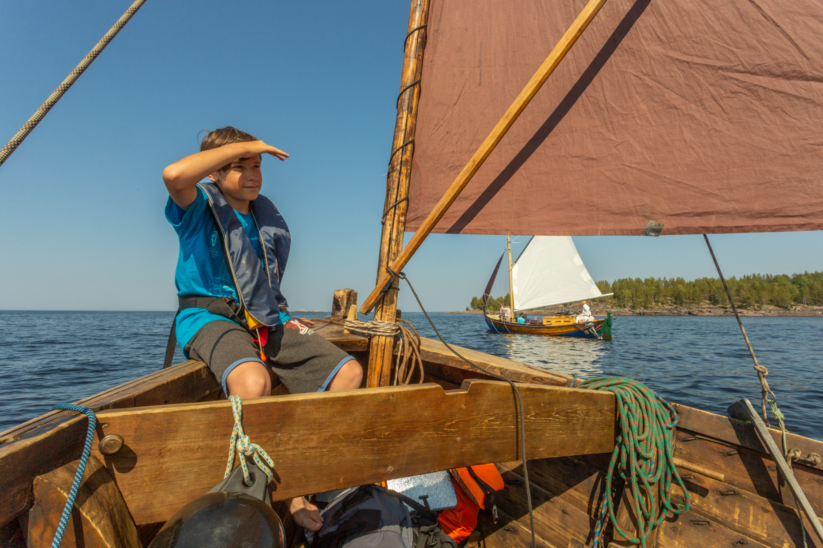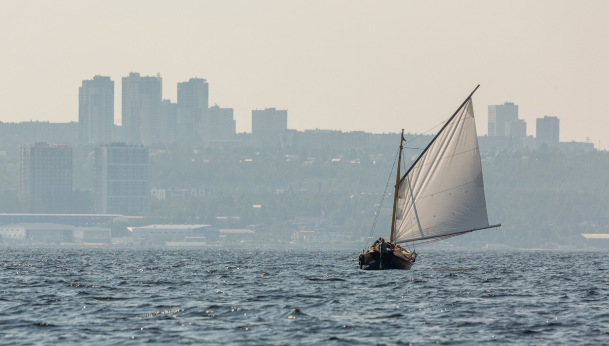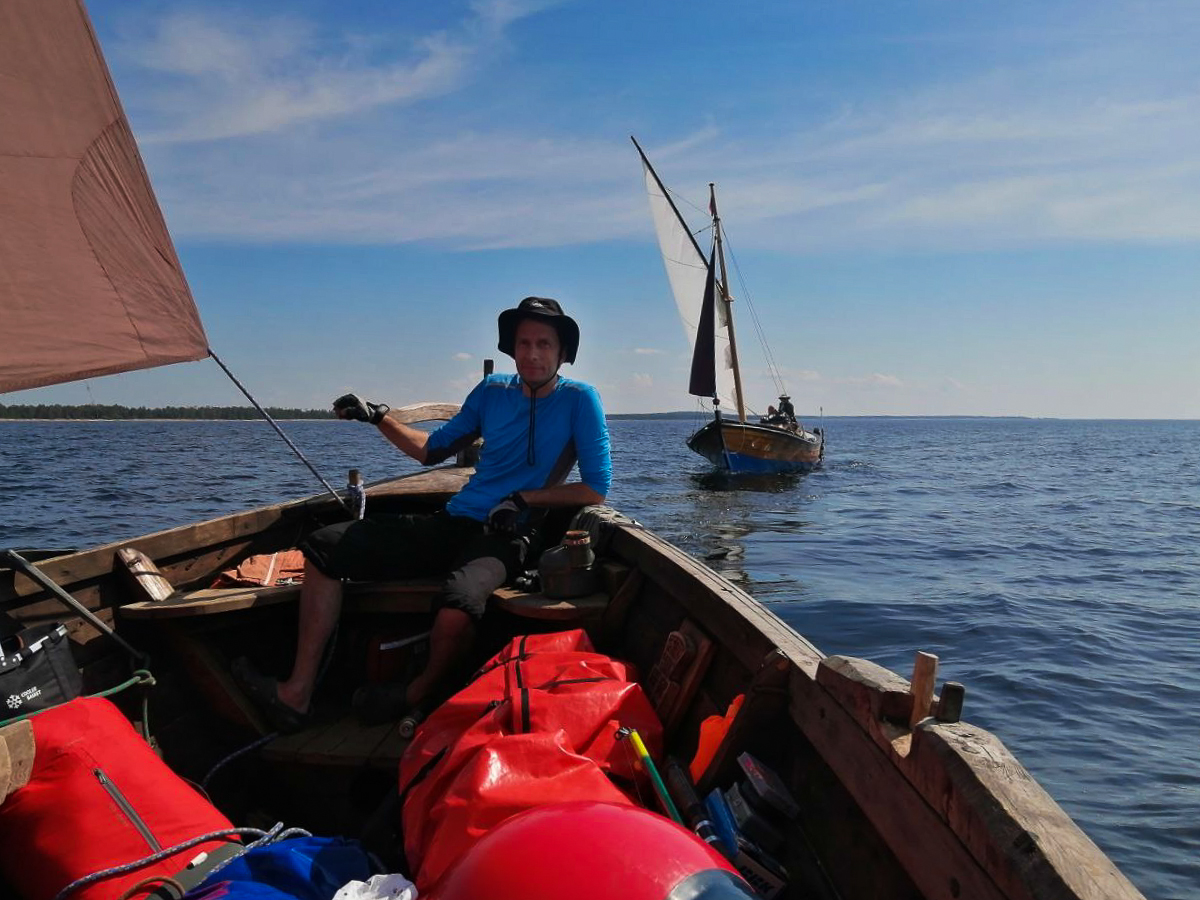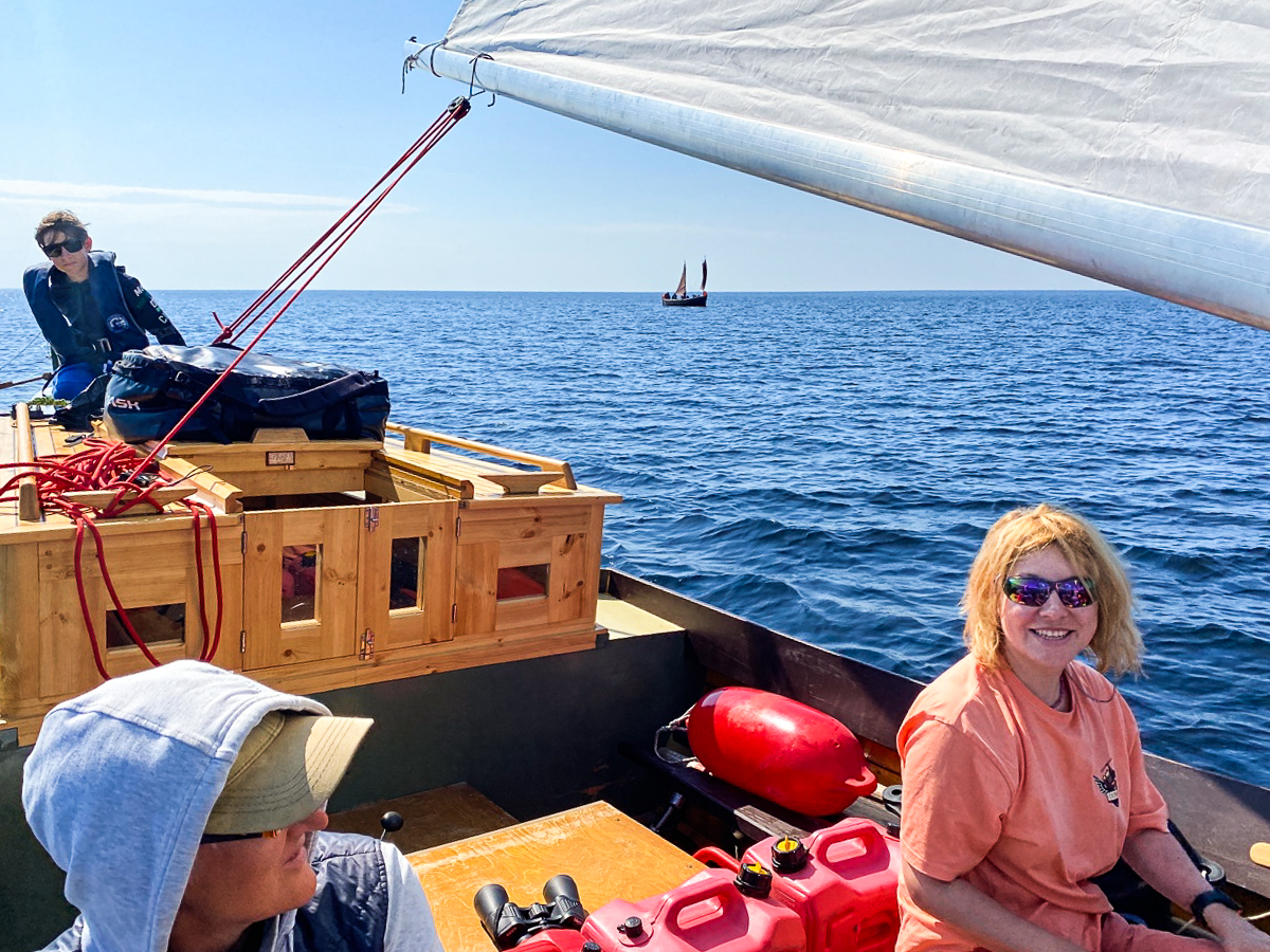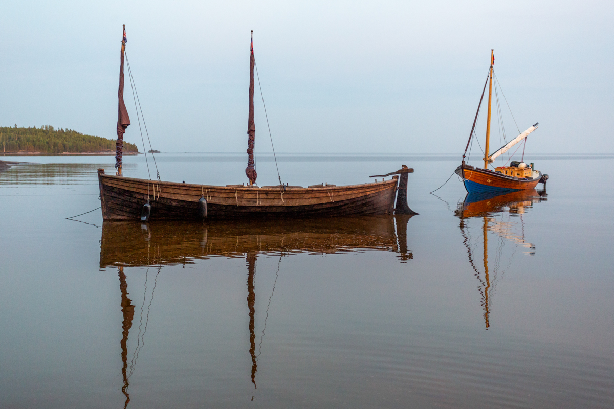 1200, поставили паруса на карбасе и на «Ёле». Разогнались на «Ёле» до 4 узлов. Впервые под парусом. Отлично идем. Лодка управляется. Скрутили оверштаг. У меня были сомнения по поводу поворотов, потому что судно полнокилевое. Неповоротливое. Но нет. Повороты под парусами крутит как положено.