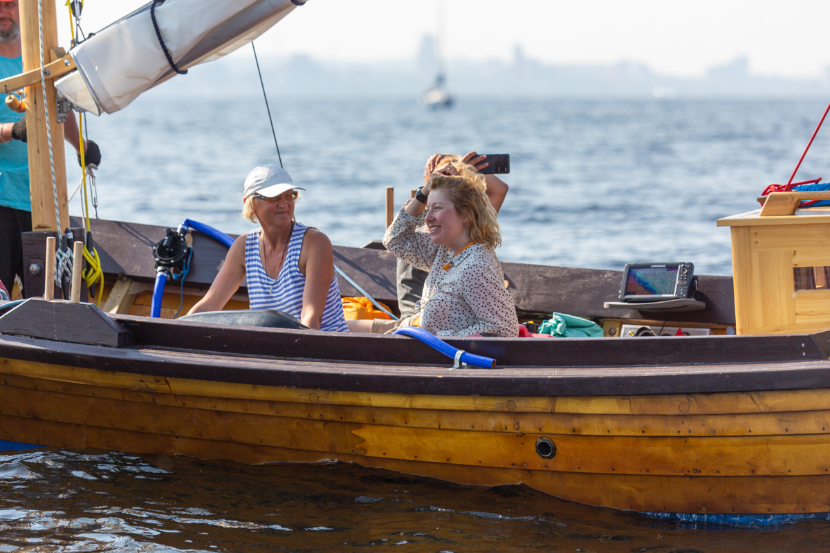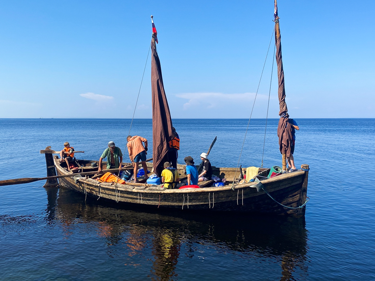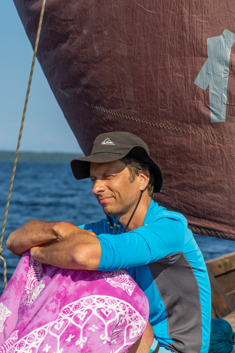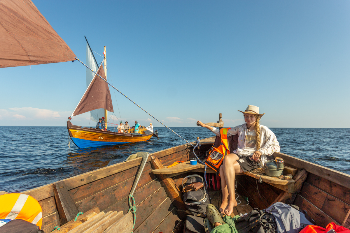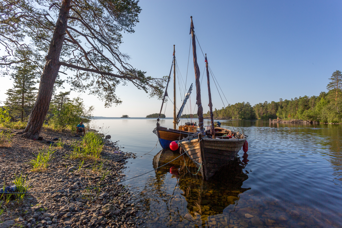 1200, поставили паруса на карбасе и на «Ёле». Разогнались на «Ёле» до 4 узлов. Впервые под парусом. Отлично идем. Лодка управляется. Скрутили оверштаг. У меня были сомнения по поводу поворотов, потому что судно полнокилевое. Неповоротливое. Но нет. Повороты под парусами крутит как положено.