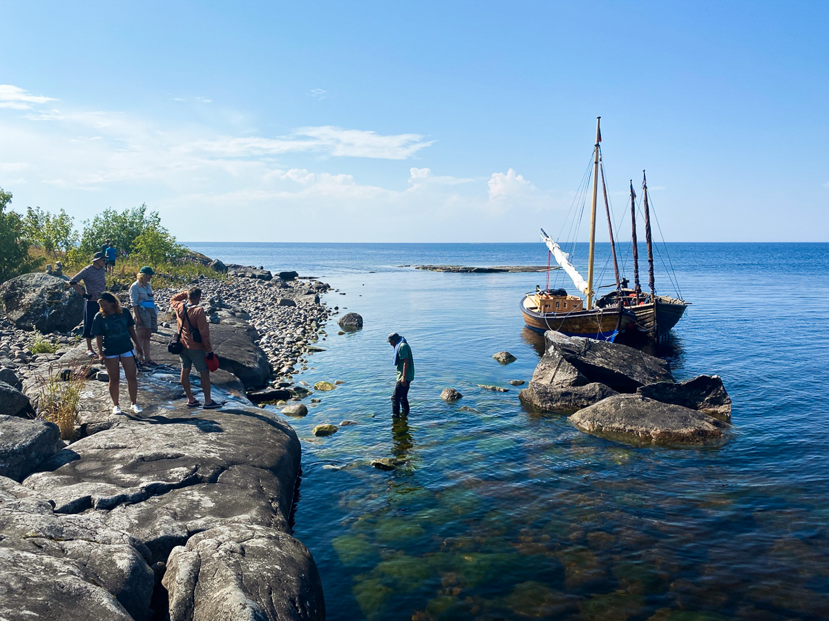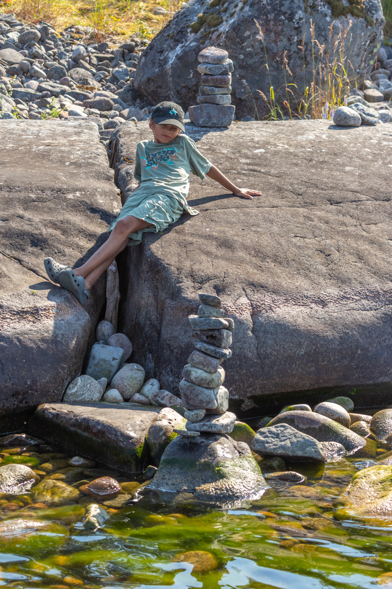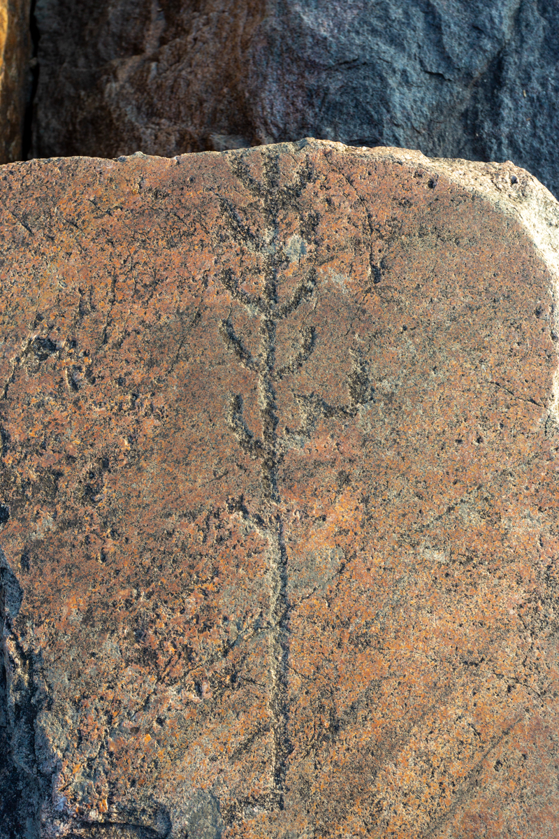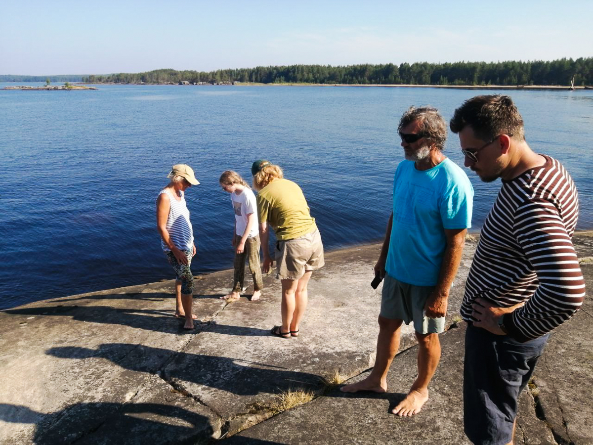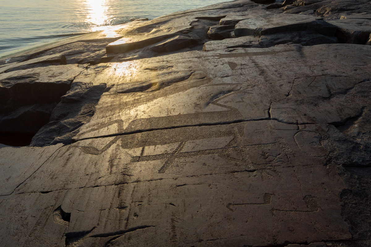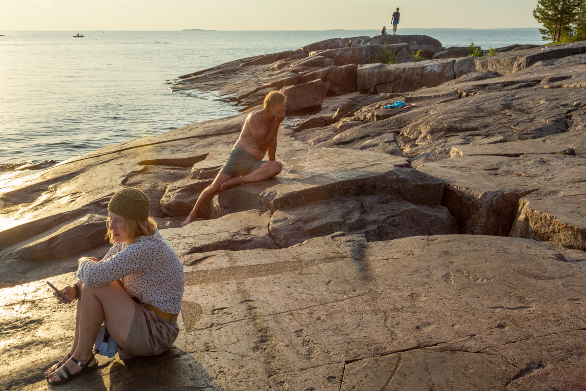 1406, встали с южной оконечности Большого Гольца. Купаемся, бродим по острову в поисках остатков каменоломен. Нашли лагерные петроглефы и очень много земляники.