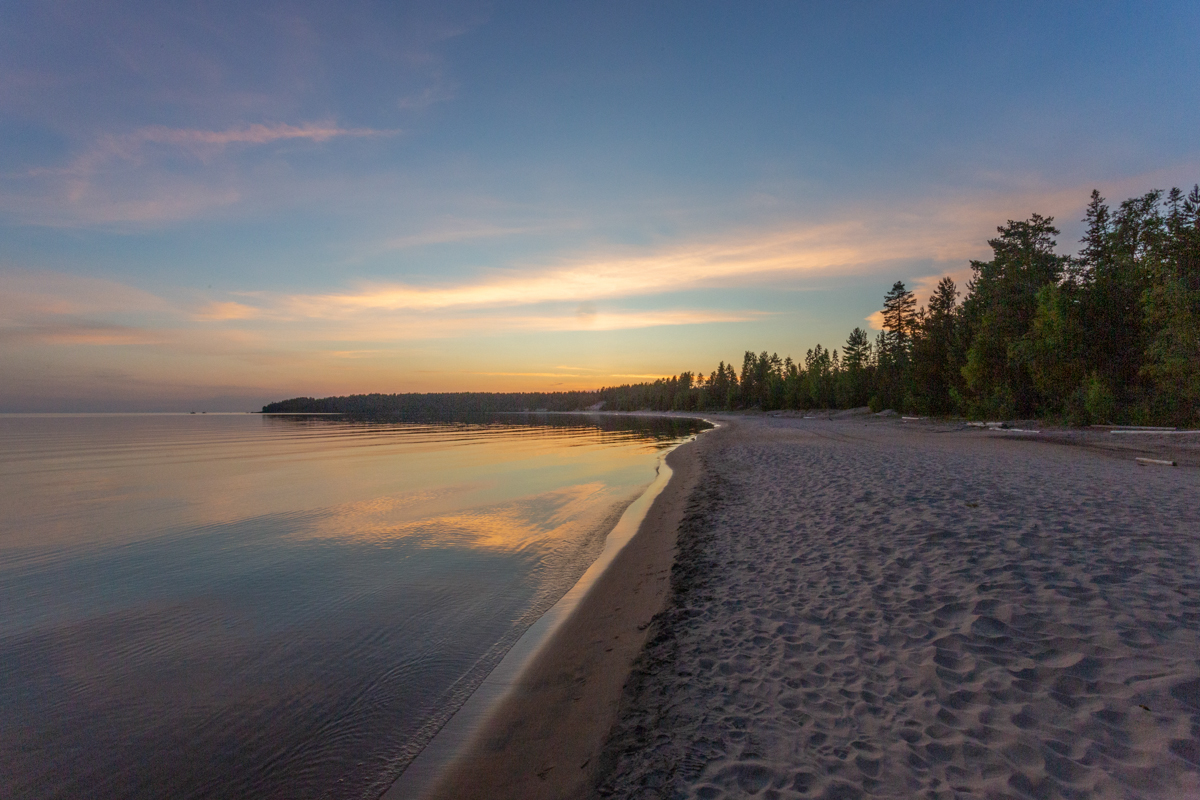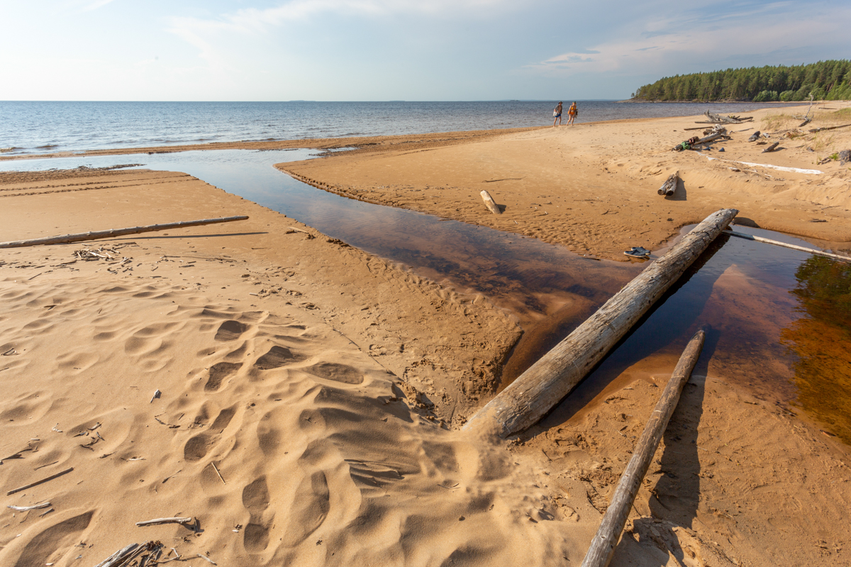 После того, как мы прошли Вытегорские шлюзы и оказались в Онежском озере, походная жизнь экспедиции изменилась. Живем на пляжах, купаемся в чистейшей воде, теплой, как парное молоко. Комаров нет и в помине. Часто забываем ставить палатки, потому что нужды в них нет. Только песком все карманы забиты, и очень жарко.