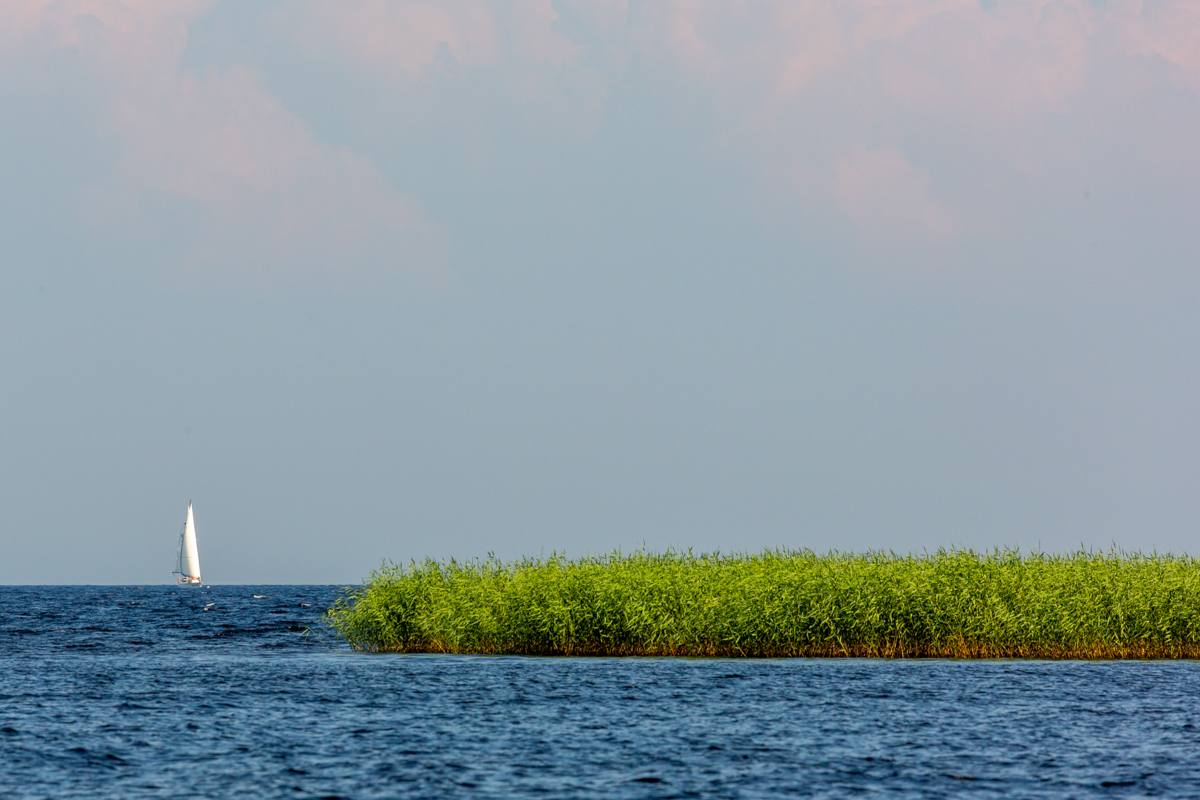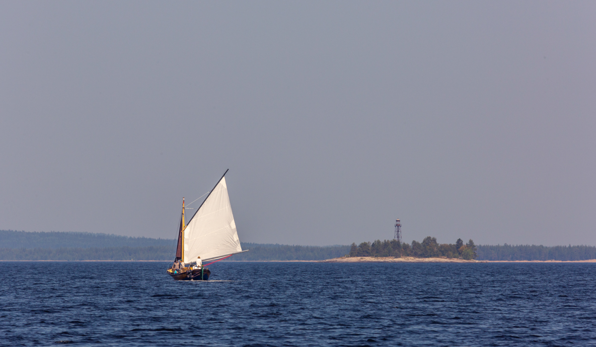 Днем шли по заливу Большое Онего. Жара стала нестерпимой, чернила плавились и не ложились на бумагу. Помню только, что созвонились с Александром Экало, моим старинным товарищем той поры, когда я пришел работать в Московскую Яхтенную Школу в 2006 году. Саша живет в Петрозаводске. У него яхта, он заядлый гонщик, один из лучших инструкторов, которых я знаю, и большой патриот Онего.