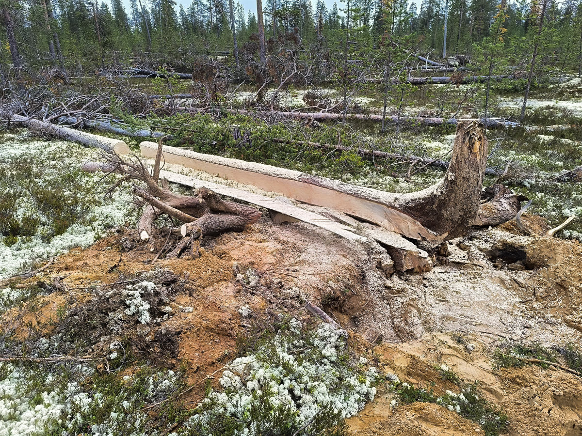 Добыли три кокоры. Все замечательные. Одна ёлочка в пару вчерашней и две сосновые. Понемногу глаз привык видеть правильные дерева, и дело идет все быстрее. Я влюблен в наш ветровал — он огромен!