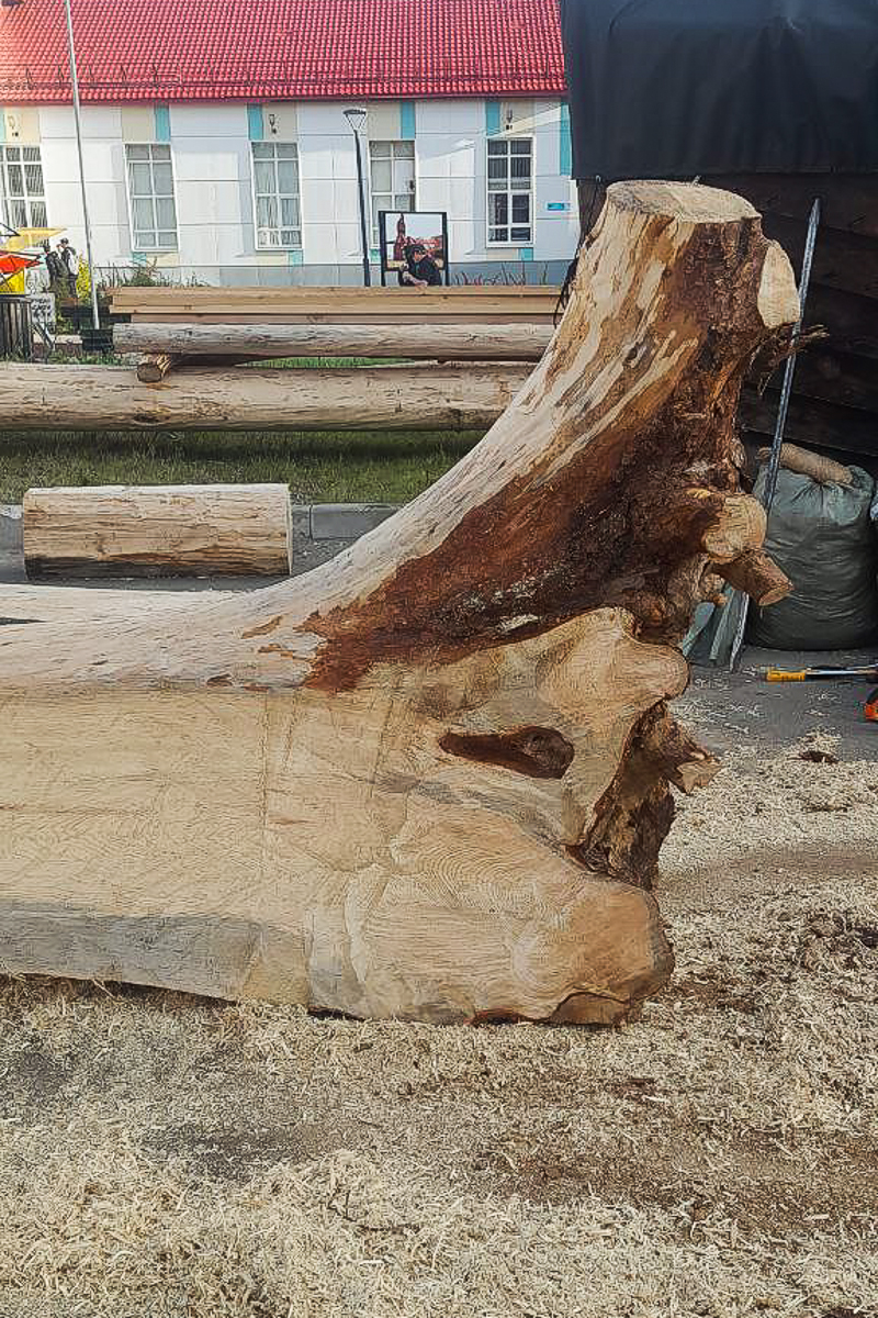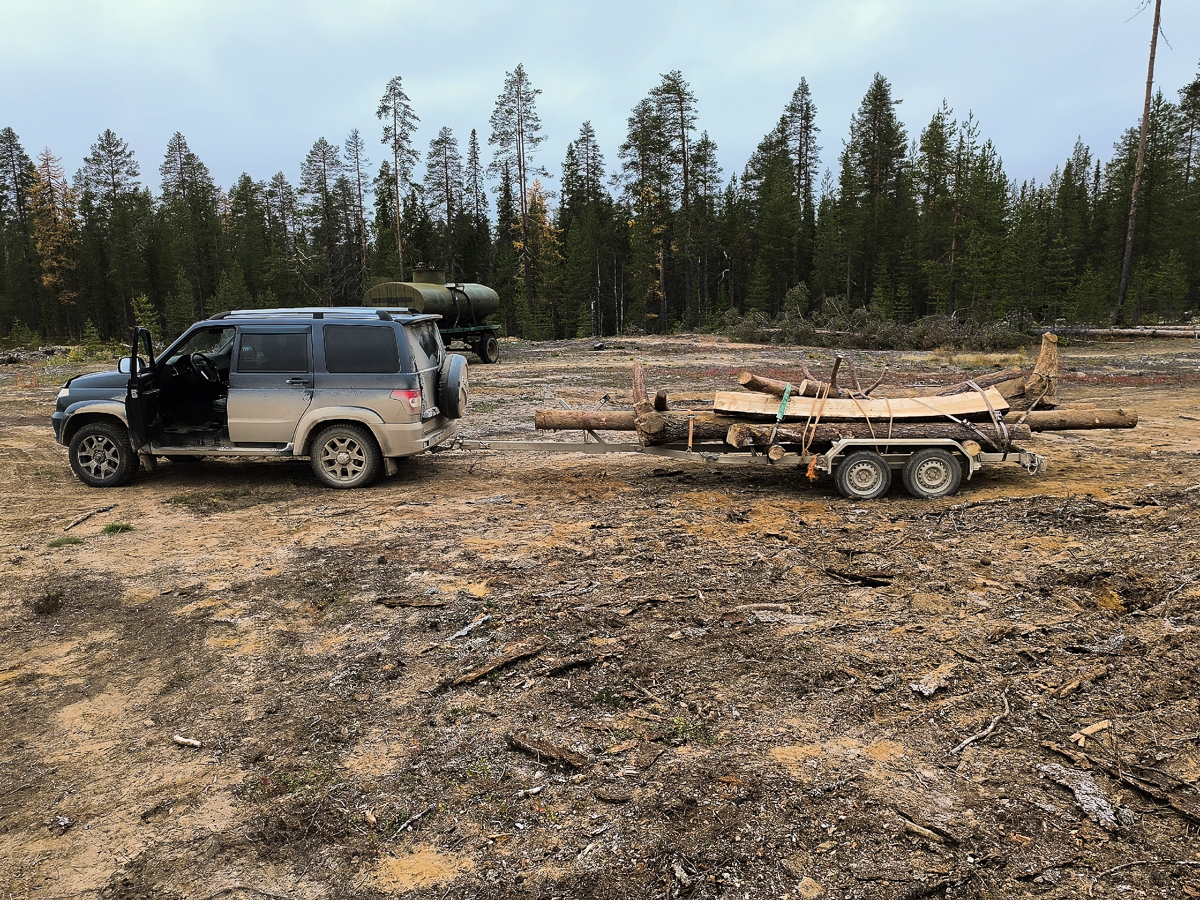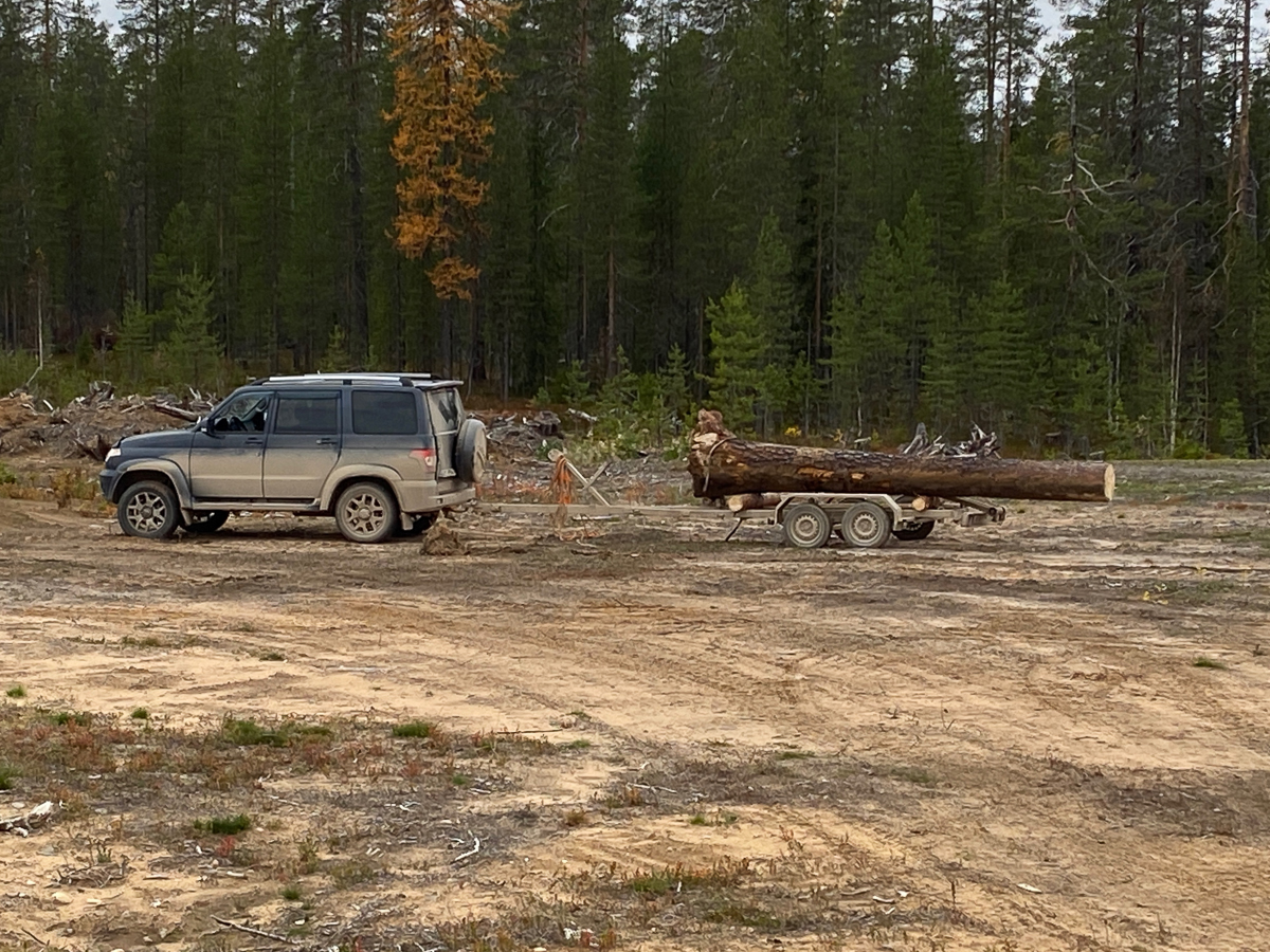 «Патриотом» растащили завал на дороге к огромной вчерашней заготовке ахтерштевня. Саня на камазе помог загрузить эту огромность на наш прицеп. Кажется, что эта гора леса больше нашей машинки. Итак, вывезли две кокоры в Архангельск, и две остались на будущее.