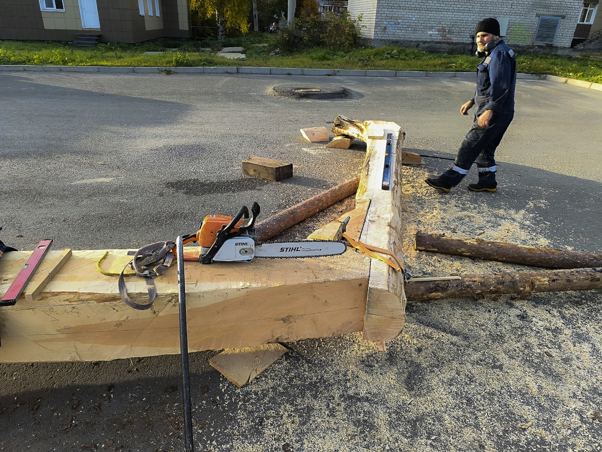 Сегодня обычный понедельник. Из выполненных работ: переставили киль ближе к месту будущей закладки, установили свежие кокоры на газон и добились от Виталия нужной высоты форштевня. Завтра мы поедем в лес, поэтому на стройке снова всё встанет.