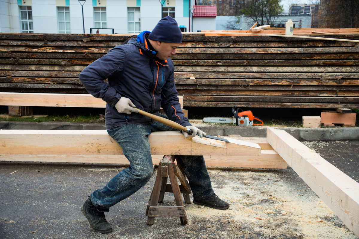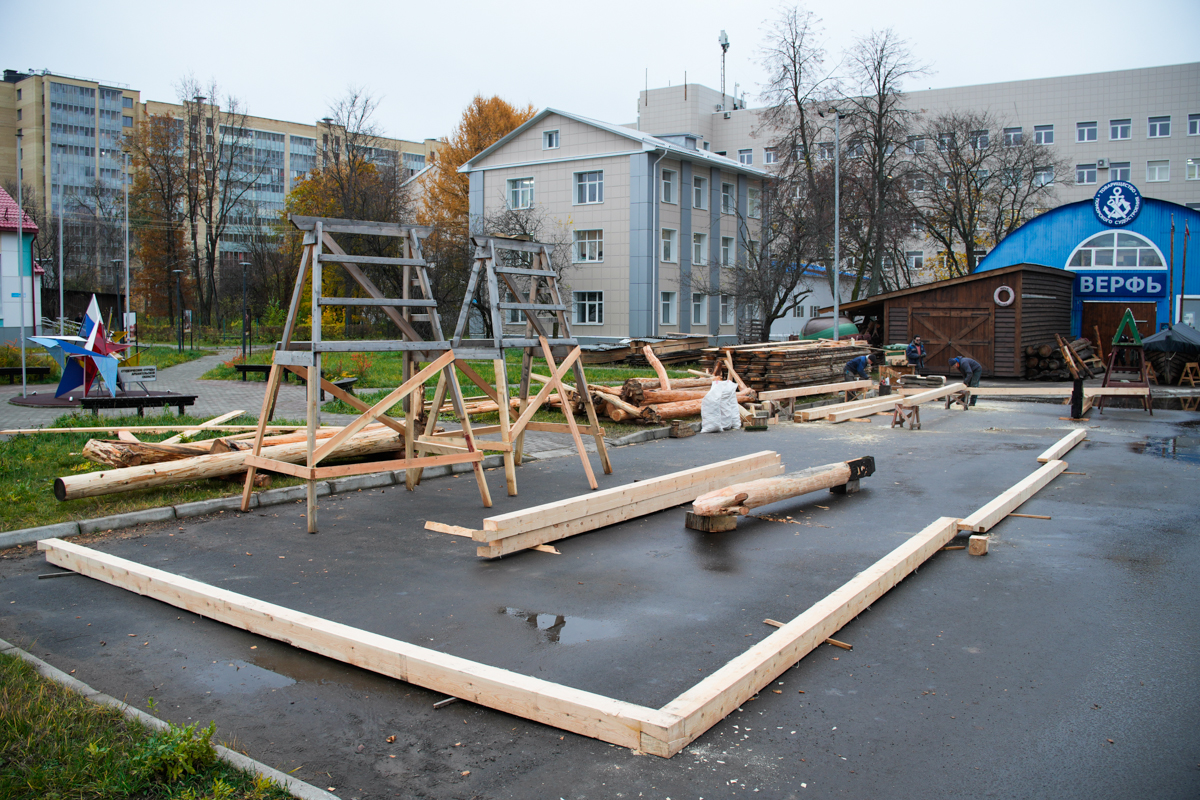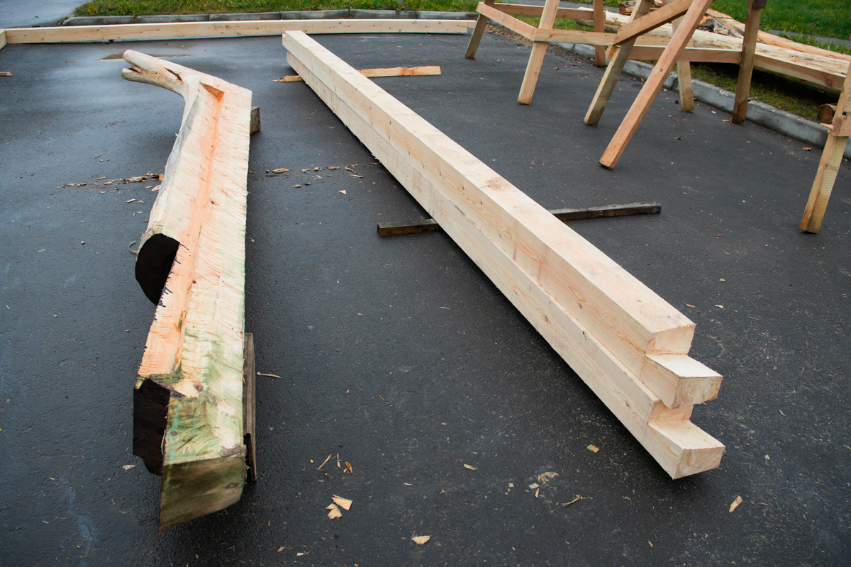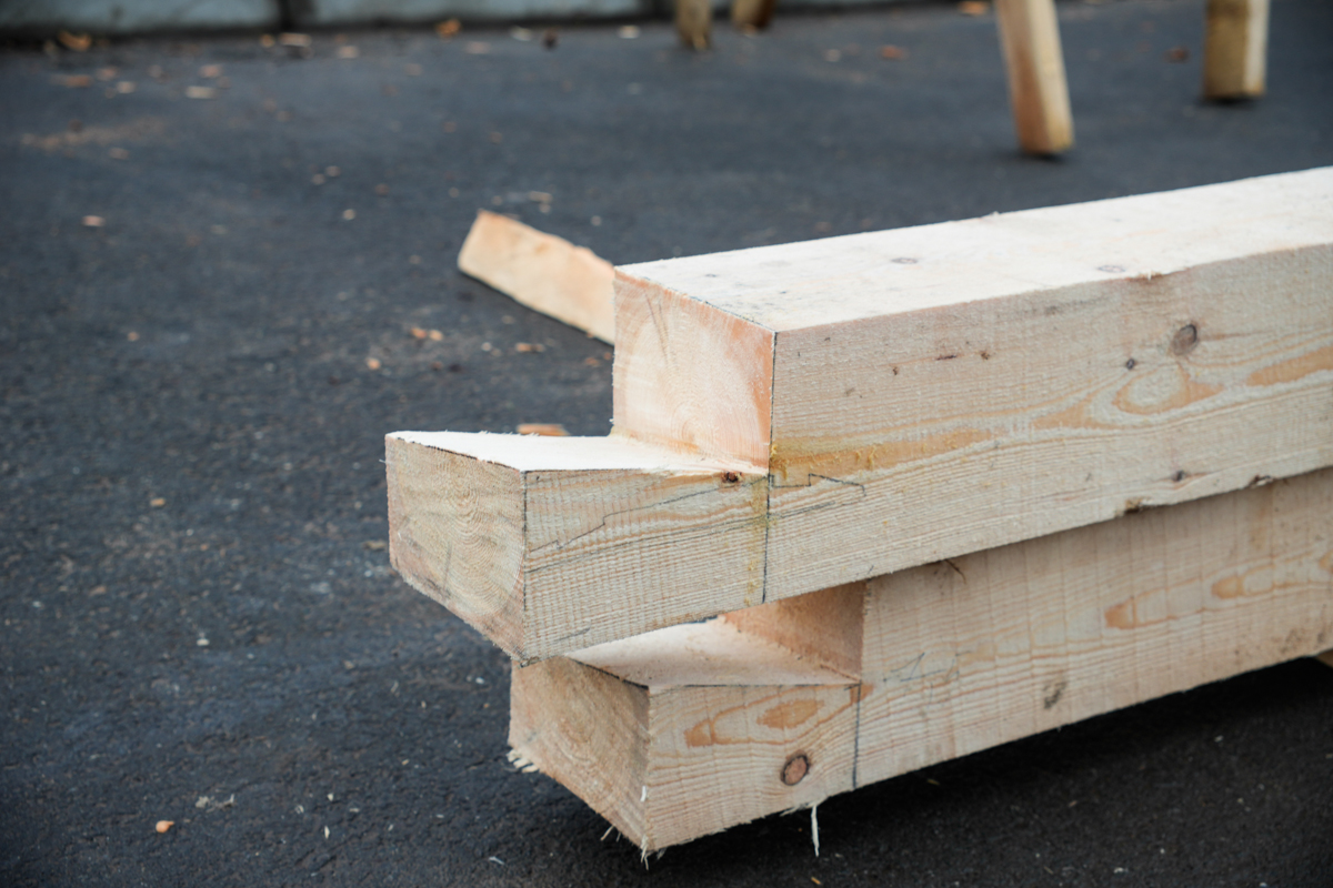 Часть команды брошена на постройку навеса для коча на улице и делает узлы соединения брусьев (строить будем «в лапу»).
