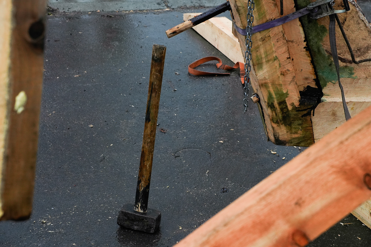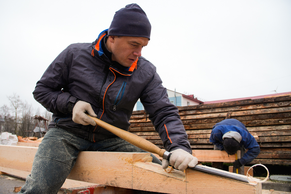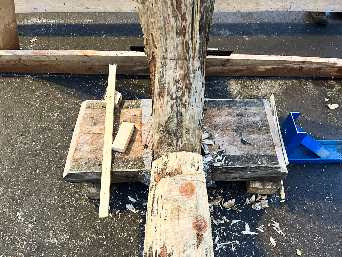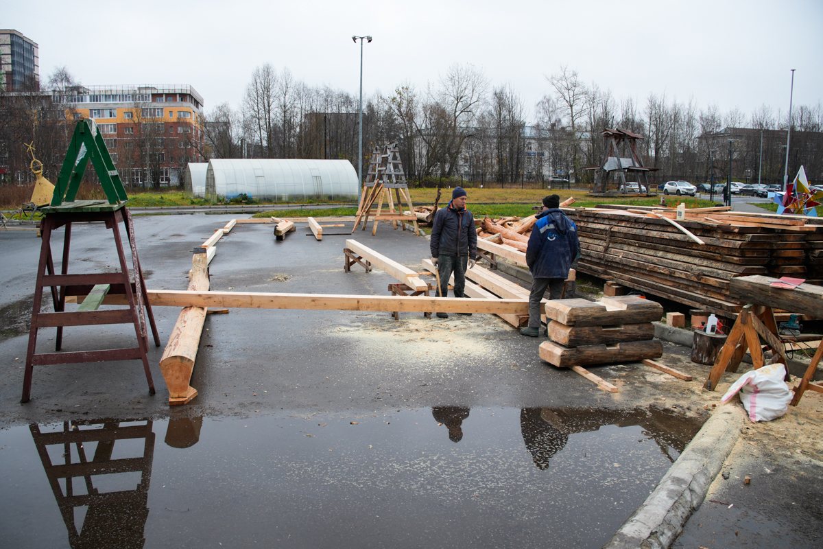 Часть команды брошена на постройку навеса для коча на улице и делает узлы соединения брусьев (строить будем «в лапу»).