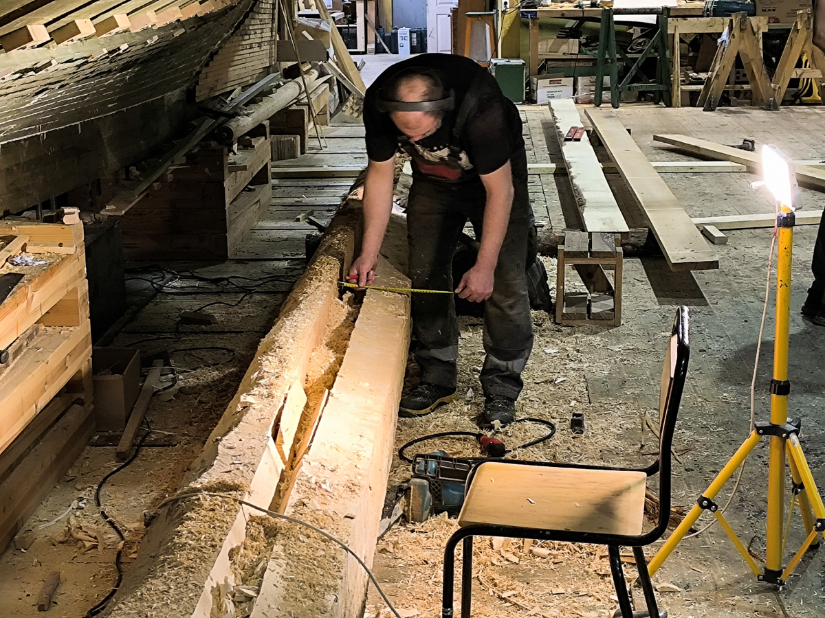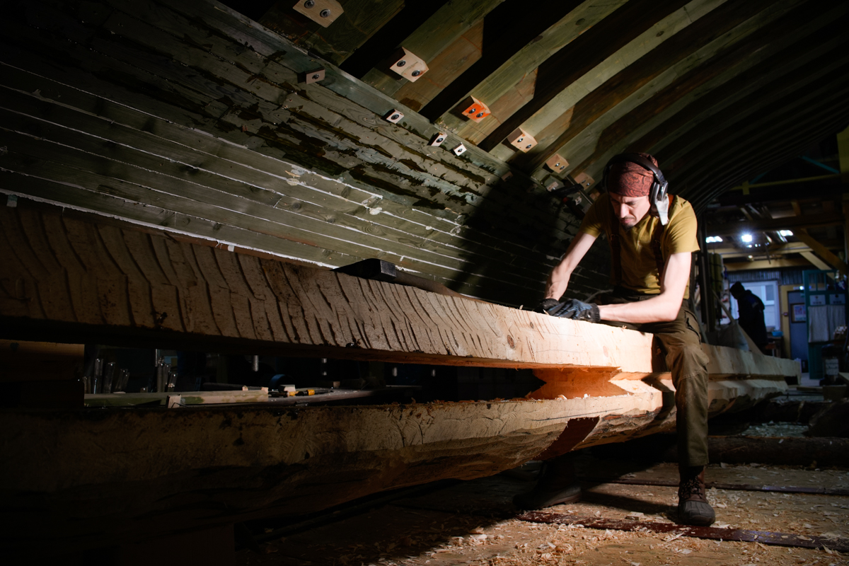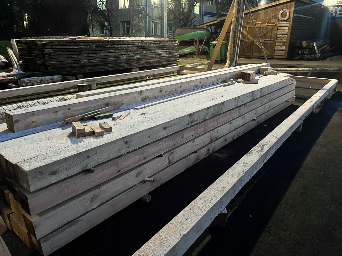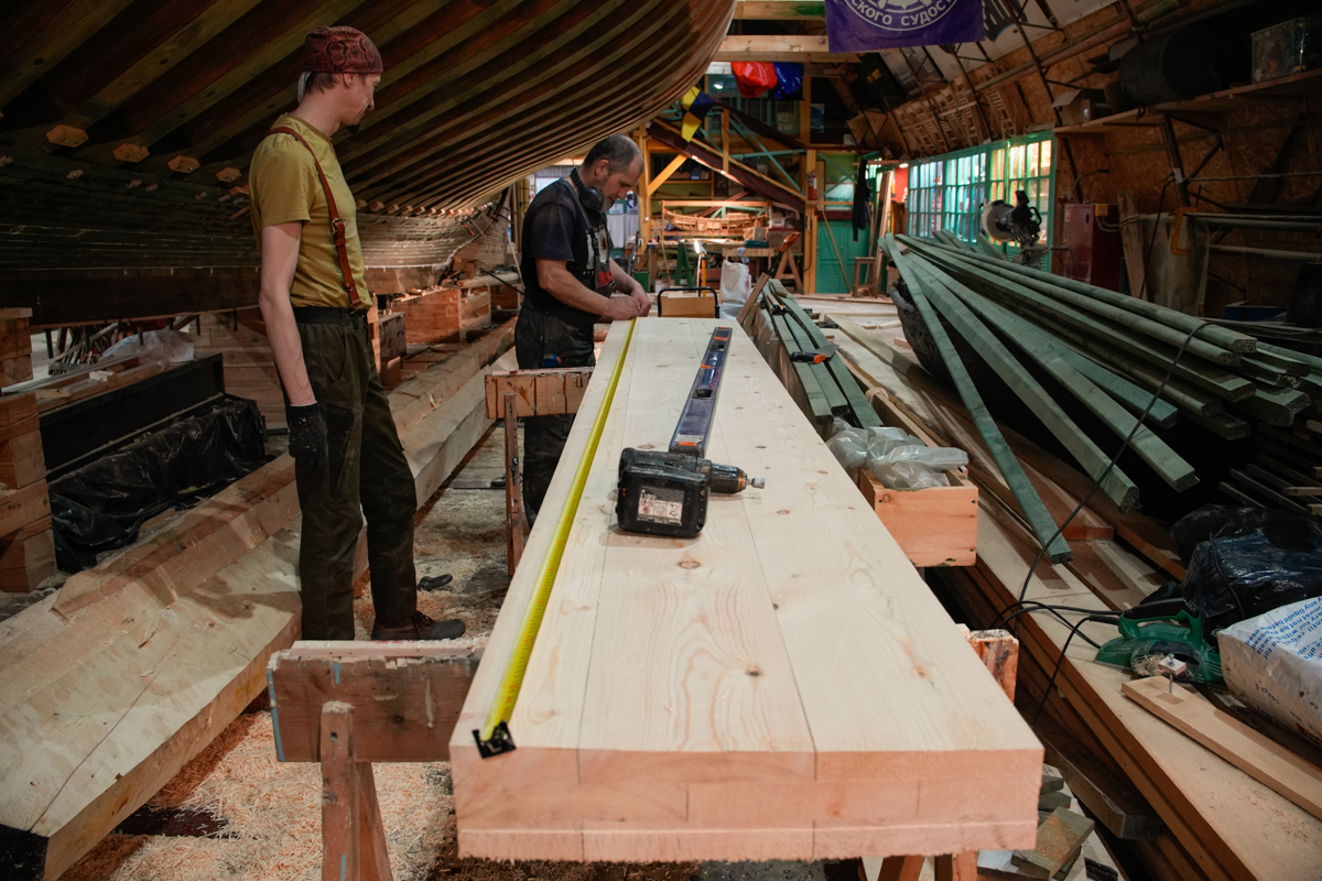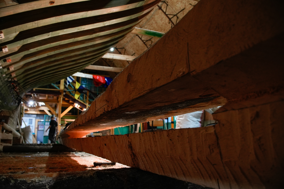 Для начала быстро затащили киль внутрь верфи, чтобы работать не под дождём и в тепле. Здесь Артём, вооружившись пилой, в течение всего дня, похожий на брутального стоматолога, вырезал эту гниль. Оценив масштаб бедствия, создали бригаду по подготовке деревянной вставки. Для этого Алексей и Дмитрий, которые занимаются обшивкой шхуны, прекратили свои работы и начали выклеивать брус 450x100x4000 мм. Завтра этот брус вставим на место на смолу, прошьем нагелями и будем считать, что киль стал ещё крепче.