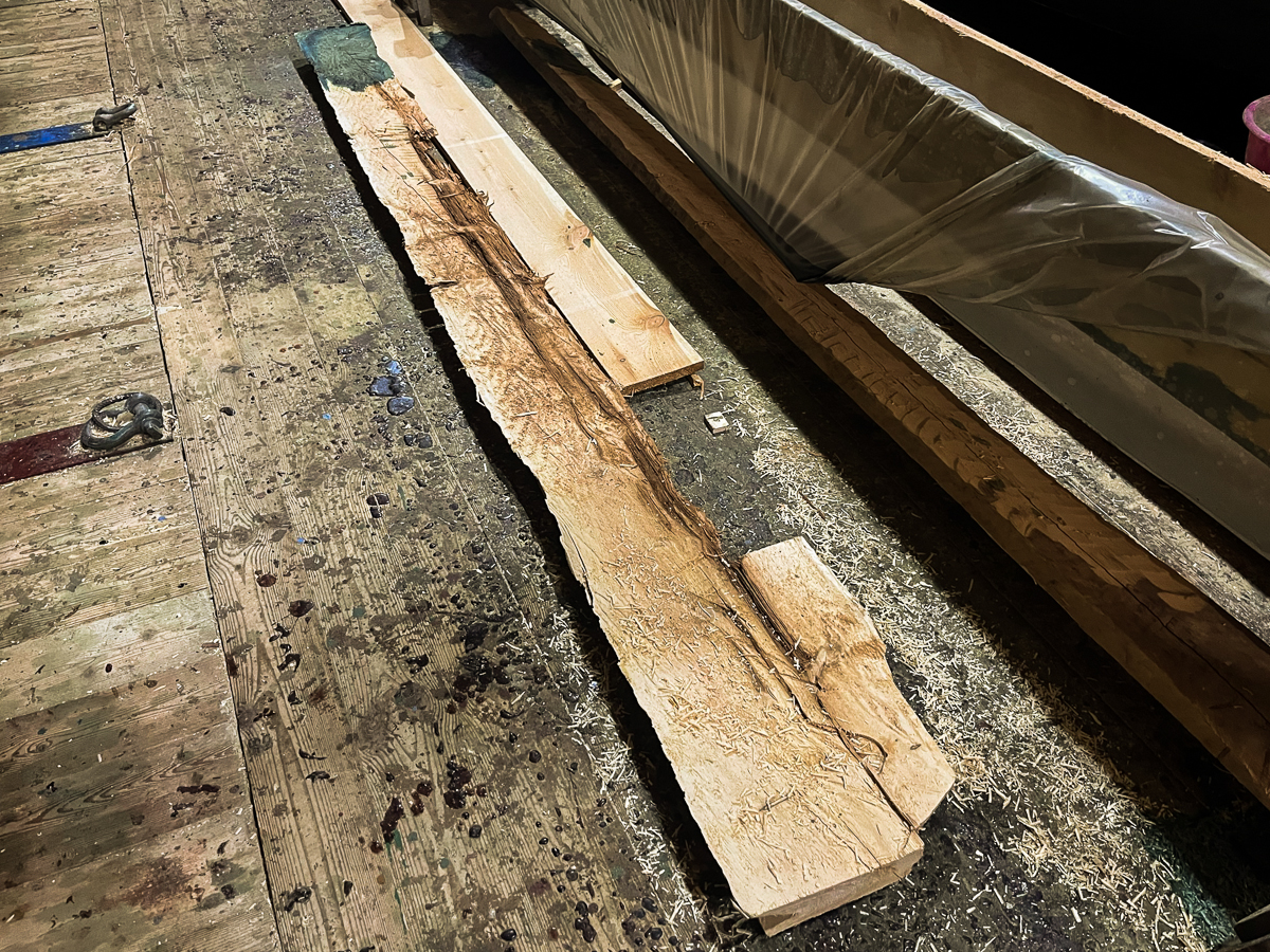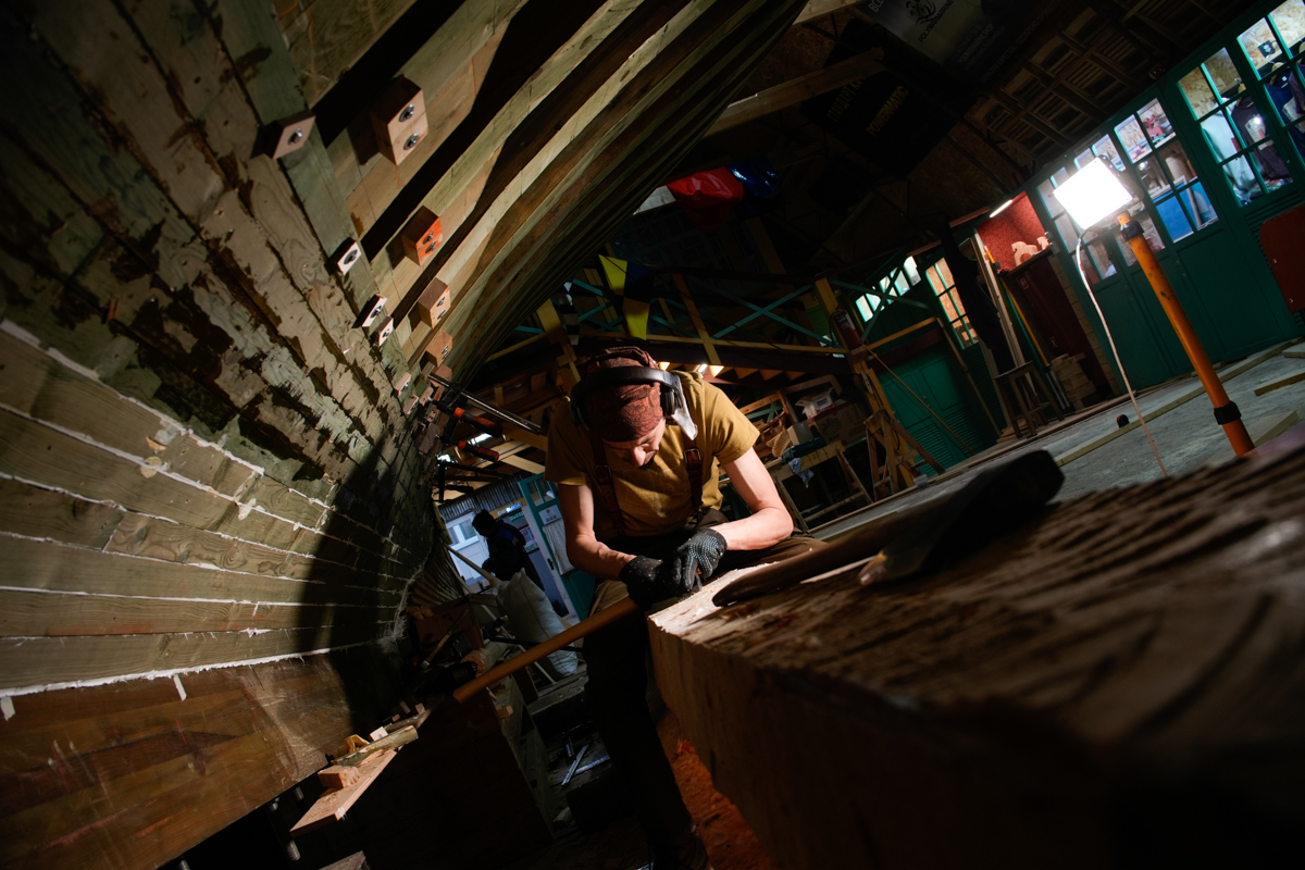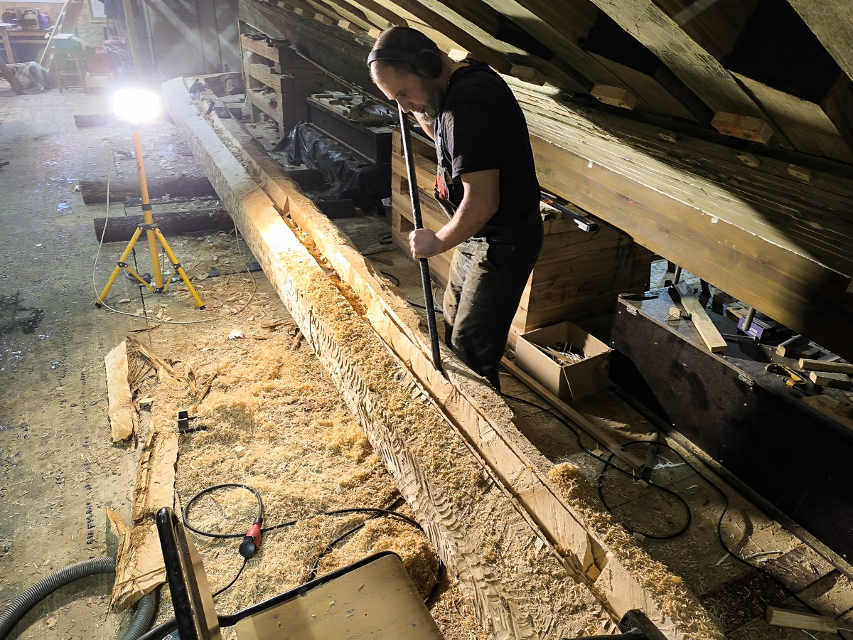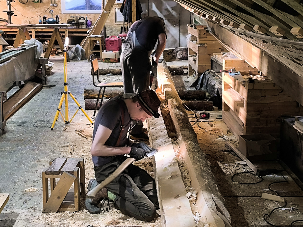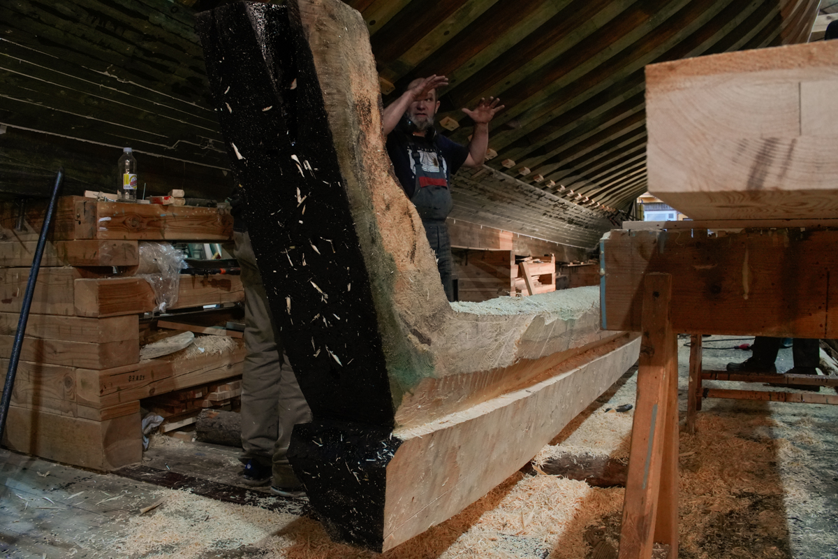 Для начала быстро затащили киль внутрь верфи, чтобы работать не под дождём и в тепле. Здесь Артём, вооружившись пилой, в течение всего дня, похожий на брутального стоматолога, вырезал эту гниль. Оценив масштаб бедствия, создали бригаду по подготовке деревянной вставки. Для этого Алексей и Дмитрий, которые занимаются обшивкой шхуны, прекратили свои работы и начали выклеивать брус 450x100x4000 мм. Завтра этот брус вставим на место на смолу, прошьем нагелями и будем считать, что киль стал ещё крепче.