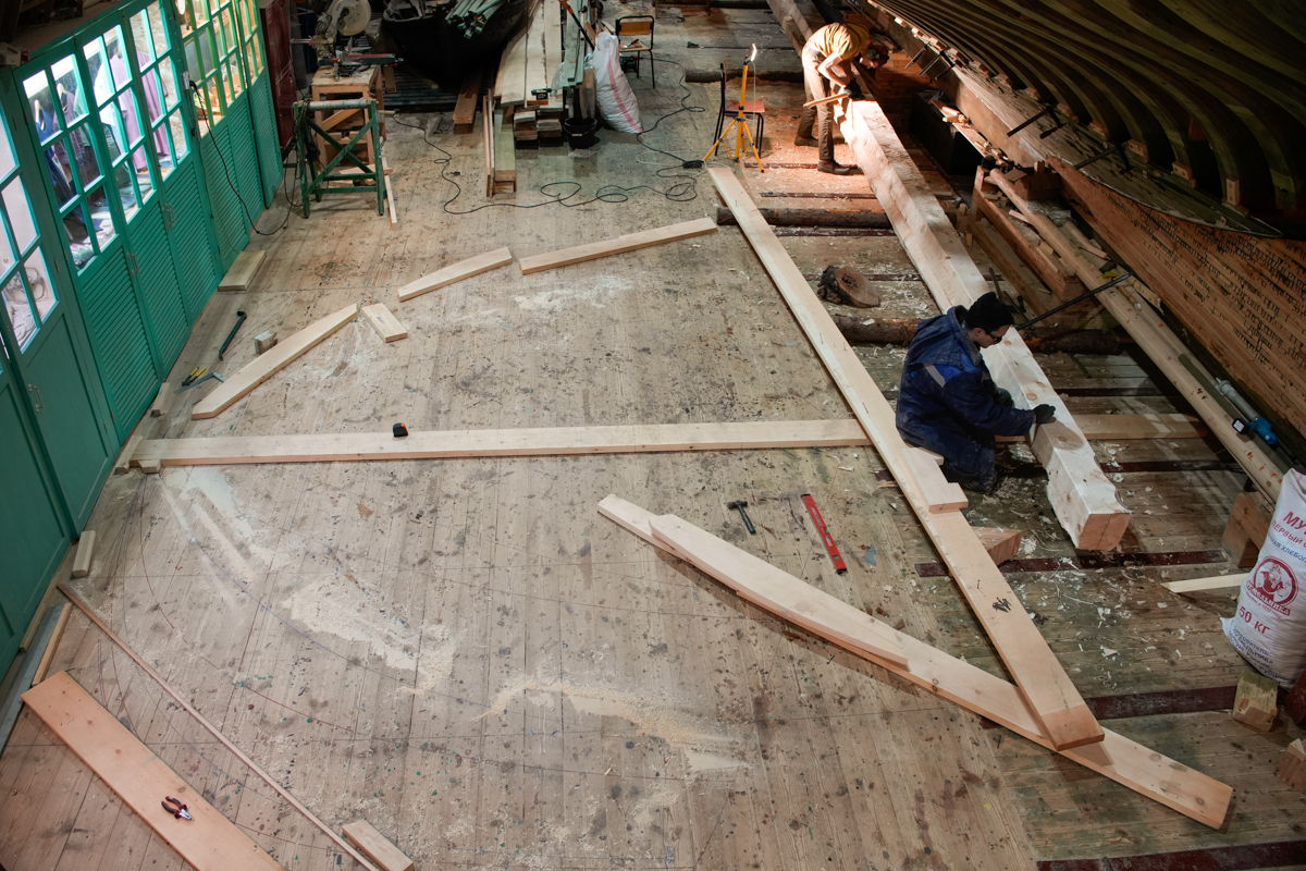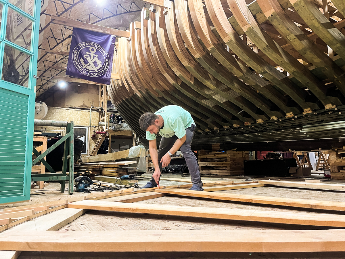 Часть команды выравнивает поверхность закладки и латает дыру в киле. Женя Петров политкорректно поправляет: «Не дыру, а технологическое отверстие». Предположим.