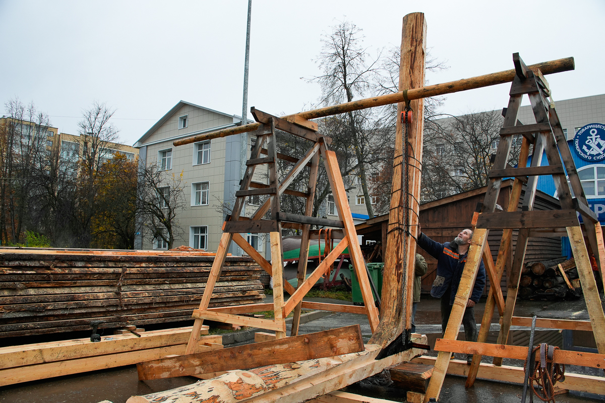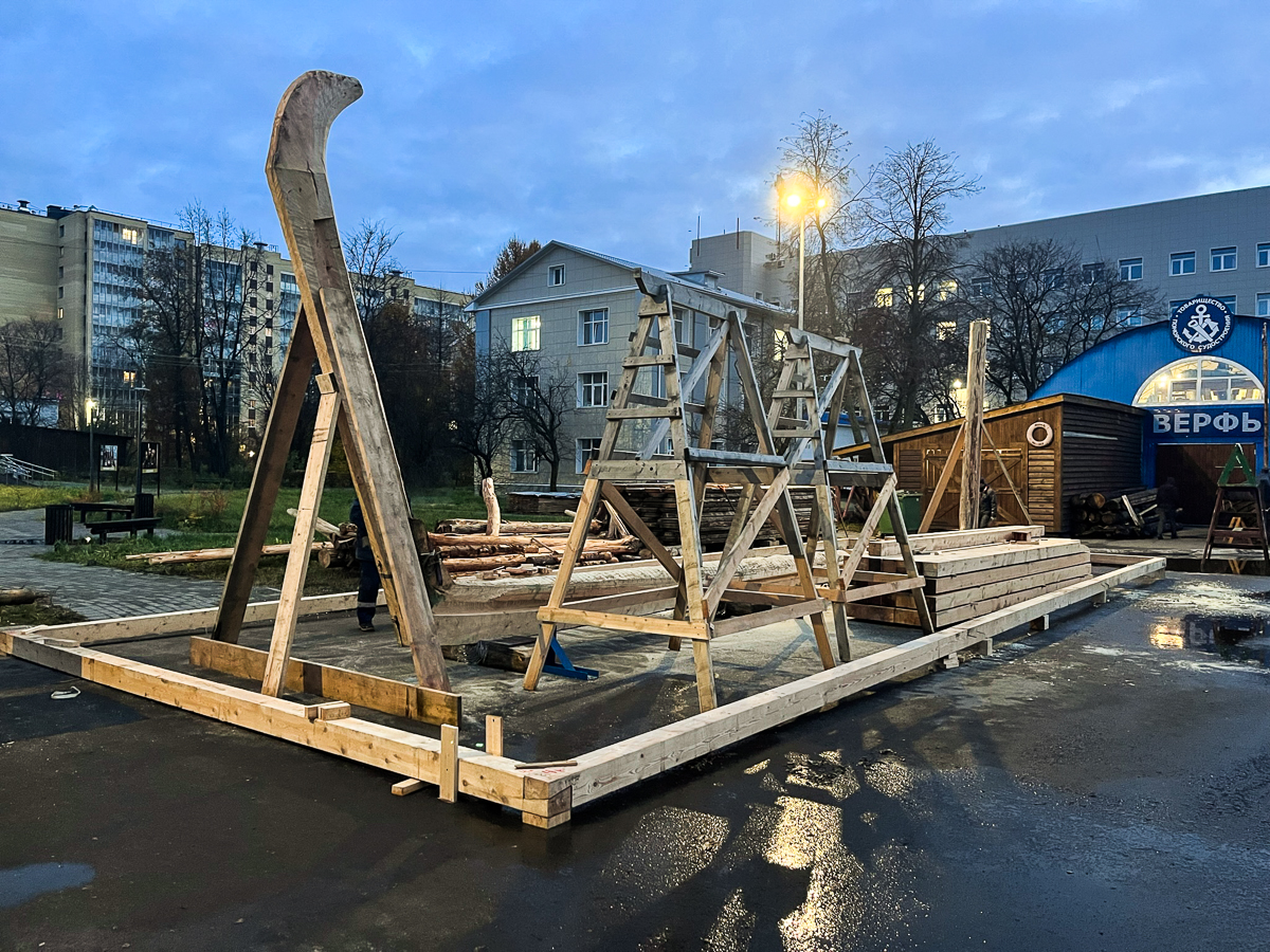 Выпрямляли килевую кокору. Носовой конец у неё слегка уходил вправо — поставили клинья, зажали, и теперь закладка стоит ровно. В таком состоянии она пробудет до момента спуска. Позже её дополнительно свяжет обшивка.