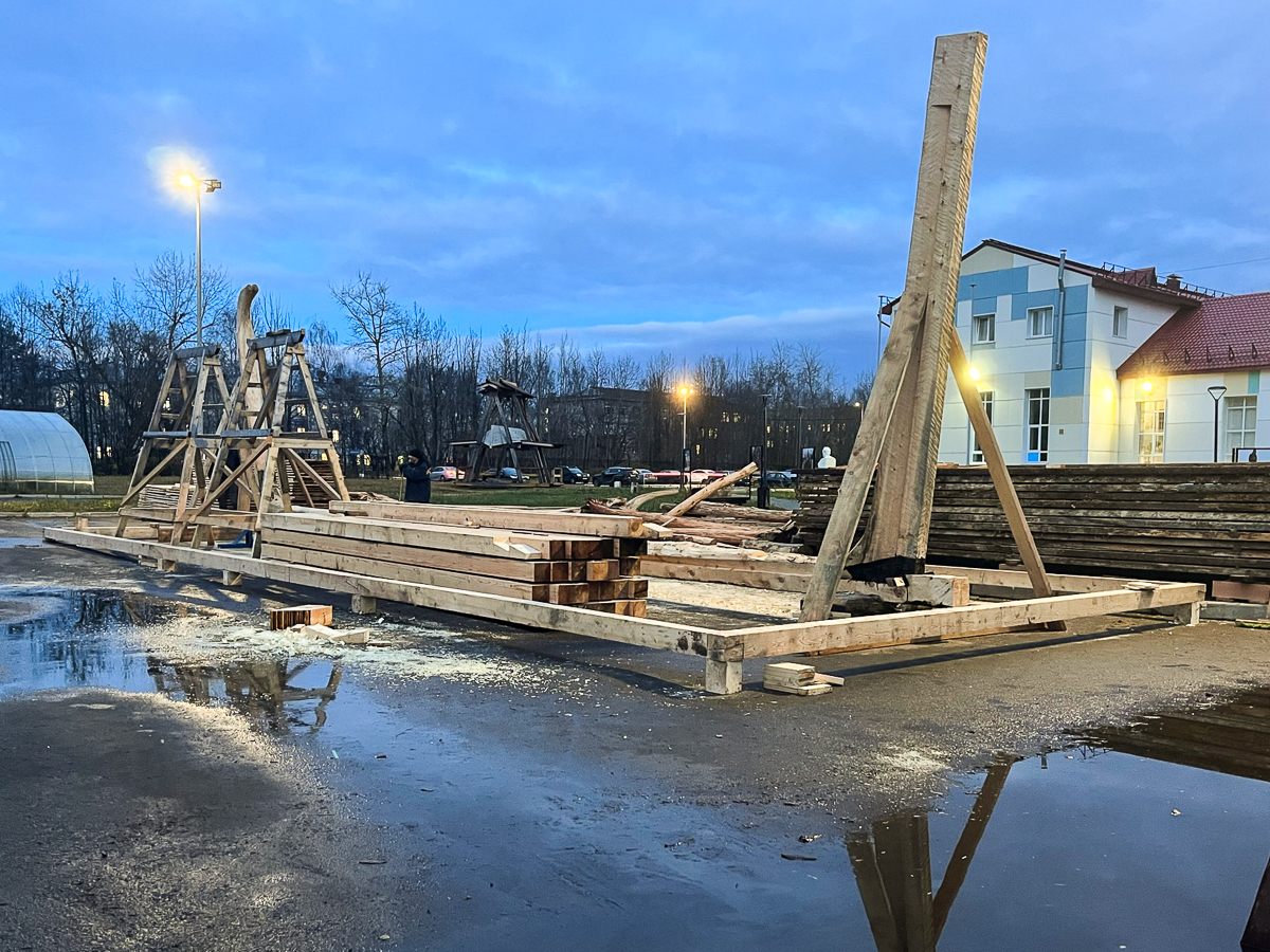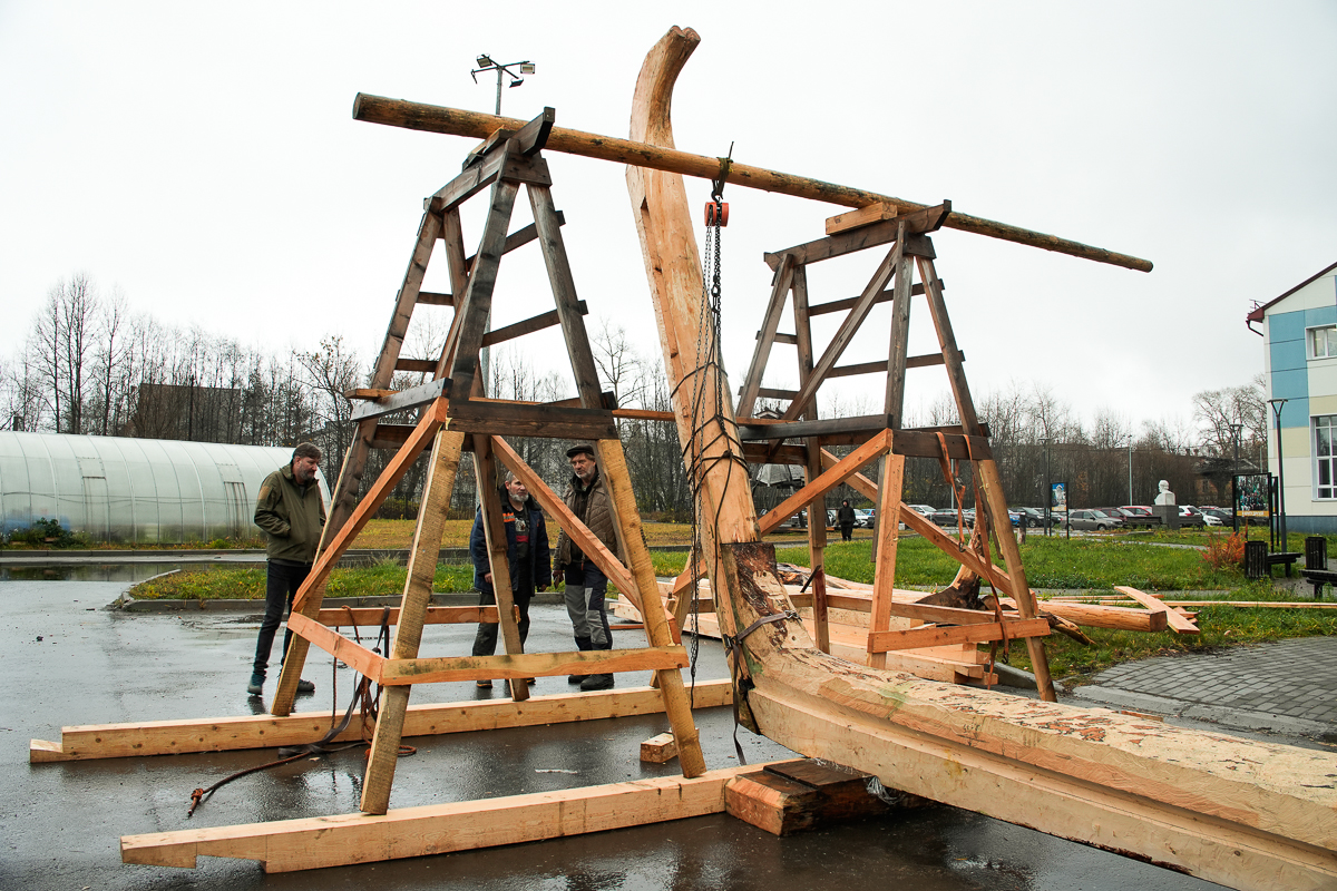 Мы успели. Острогали вставку на киле, установили кильблоки, вытащили киль на площадку… Утром я прикидывал, как буду развлекать гостей верфи в три часа дня, если мы не успеем к этому сроку всё подготовить. Думал, буду водить экскурсию, вместе будем поднимать штевни… Но мы чудом успели. Поставили и закрепили ахтершетвень, поставили форштевень, забили заветные нагеля из лиственницы. Закладка готова и ждет продолжения. Строительство коча началось.