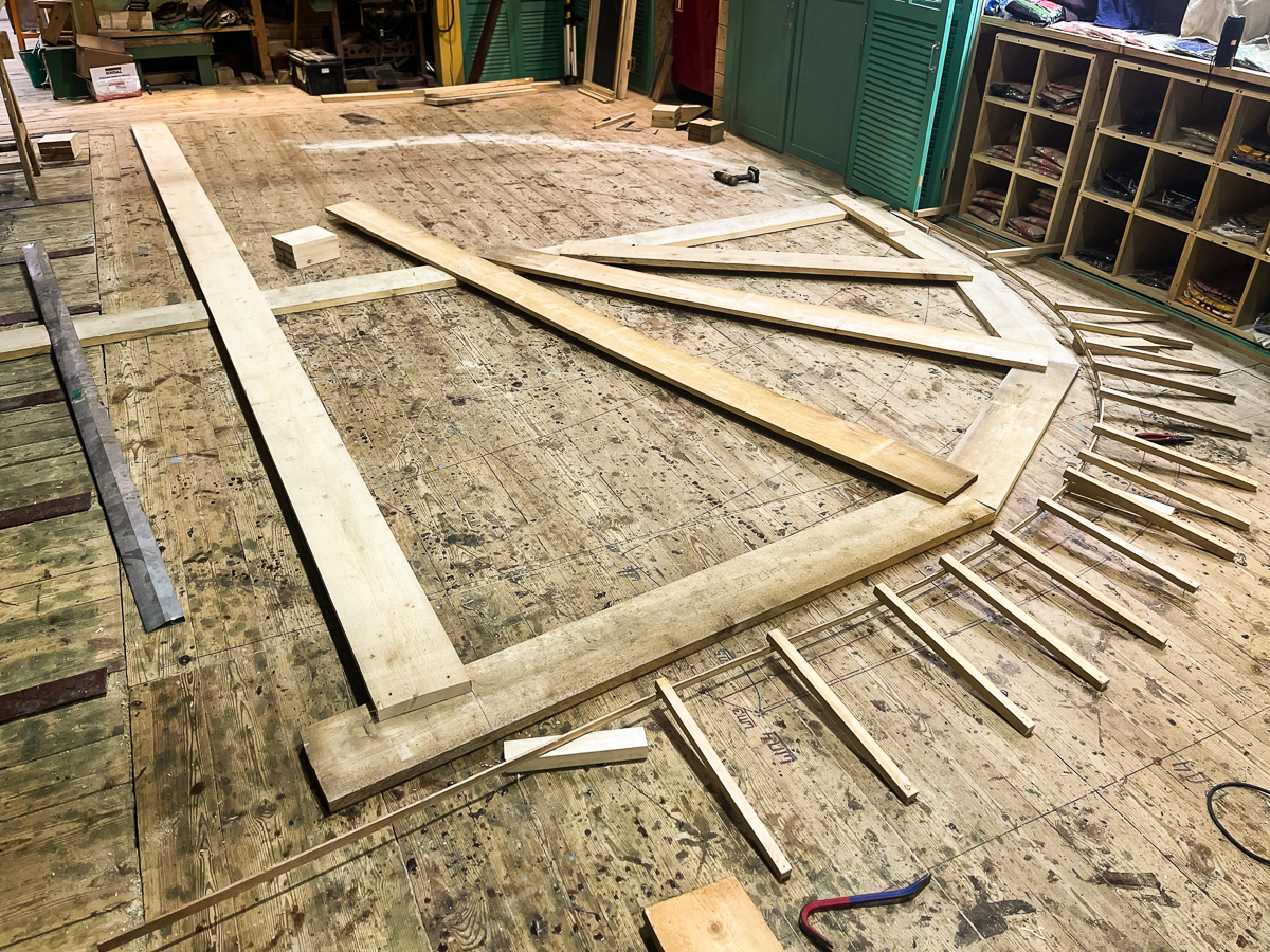 Антон и Женя (Петров — приехал помочь нам на верфи) делают кондуктора.