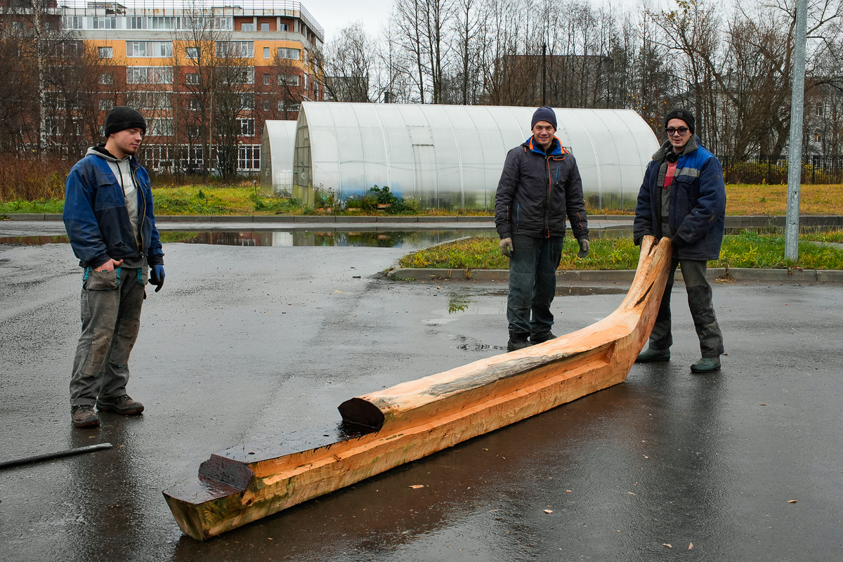 Артём докладывает, что килограмма три смолы уже зашпаклёвано в технологическое отверстие, и килограммов семь туда еще поместится. Вместе с Женей Петровым он примеряет клеёную заплатку киля и небезосновательно подозревает, что до самого момента торжественной закладки коча вкалывать придётся будь здоров.
