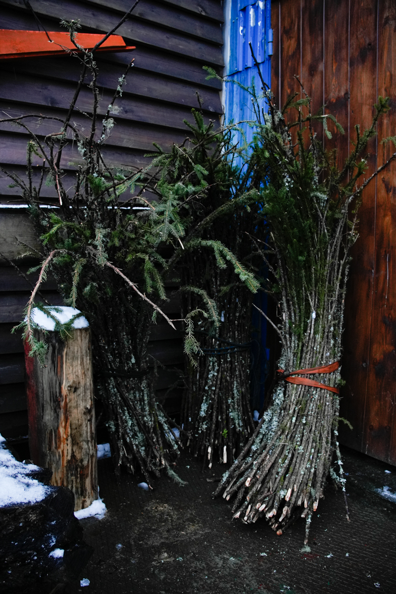 Возле входа на верфь стоят снопы еловых веток, которые ждут, очевидно, Ваню — чтобы он сделал из них вицу.