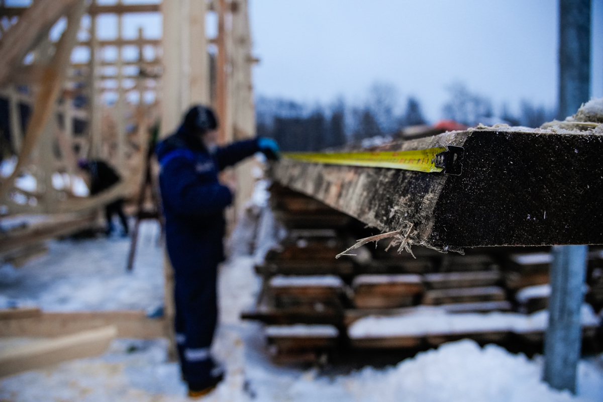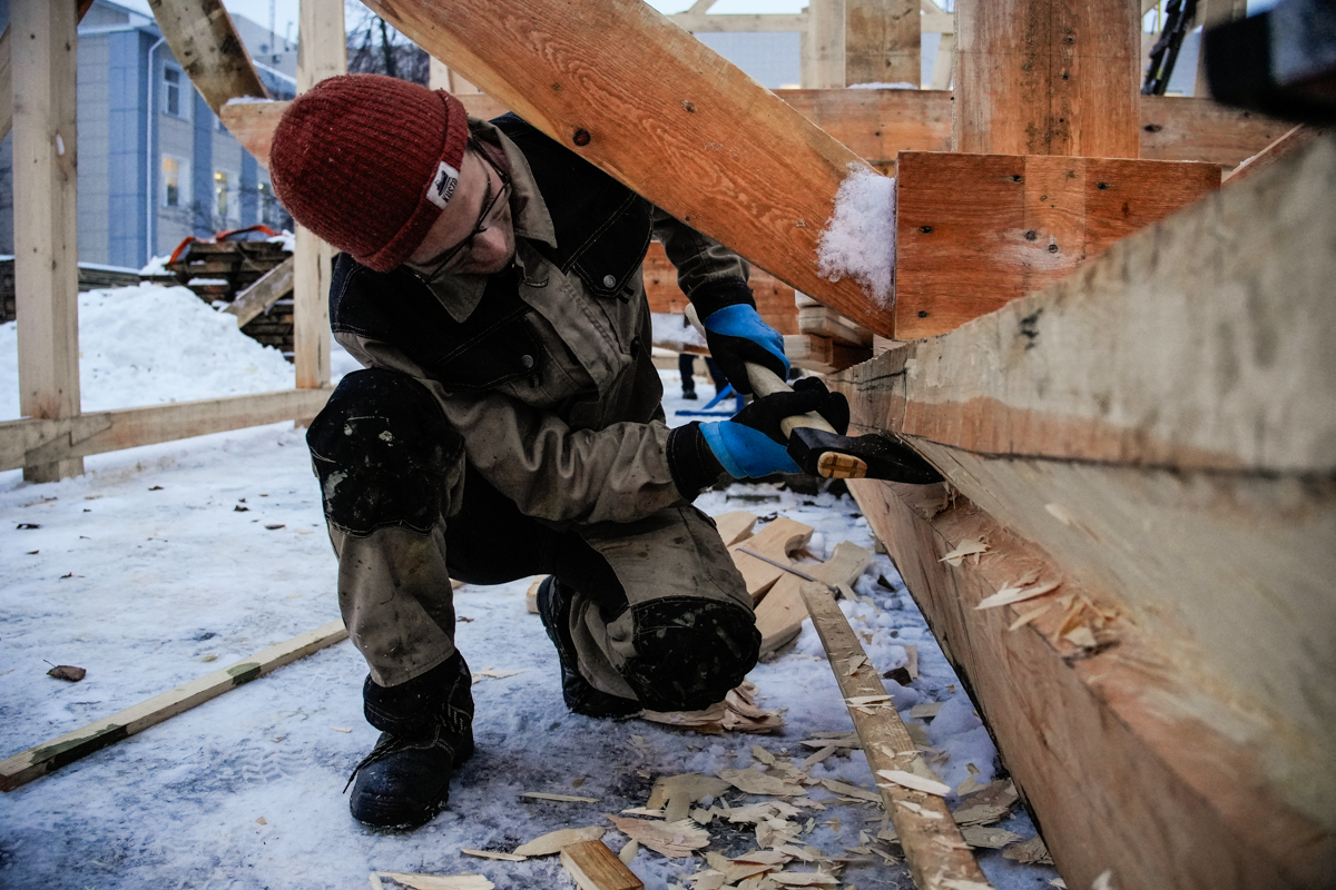 Новые доски для обшивки вытесывает теперь не только Егор, но и альпинист Женя.