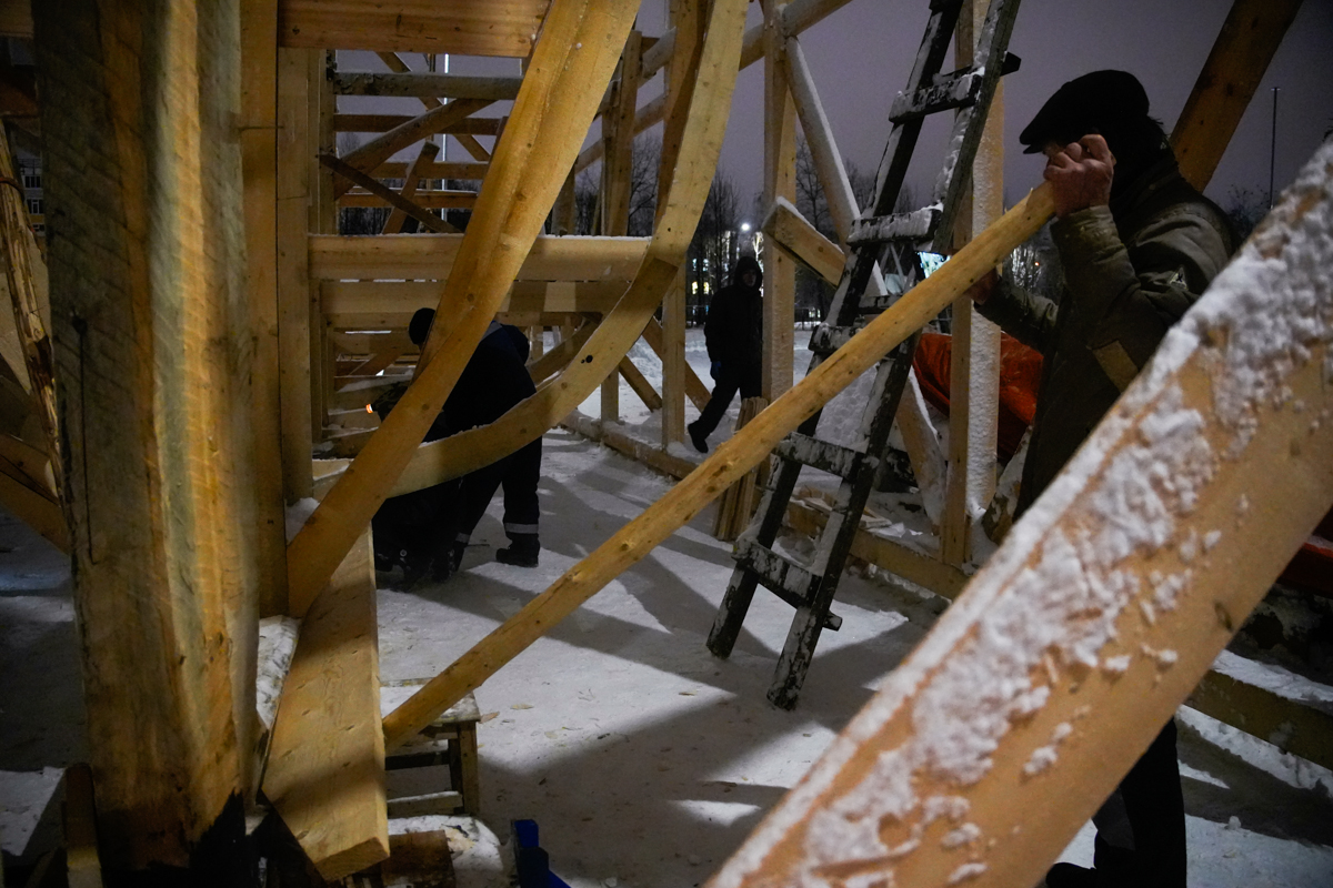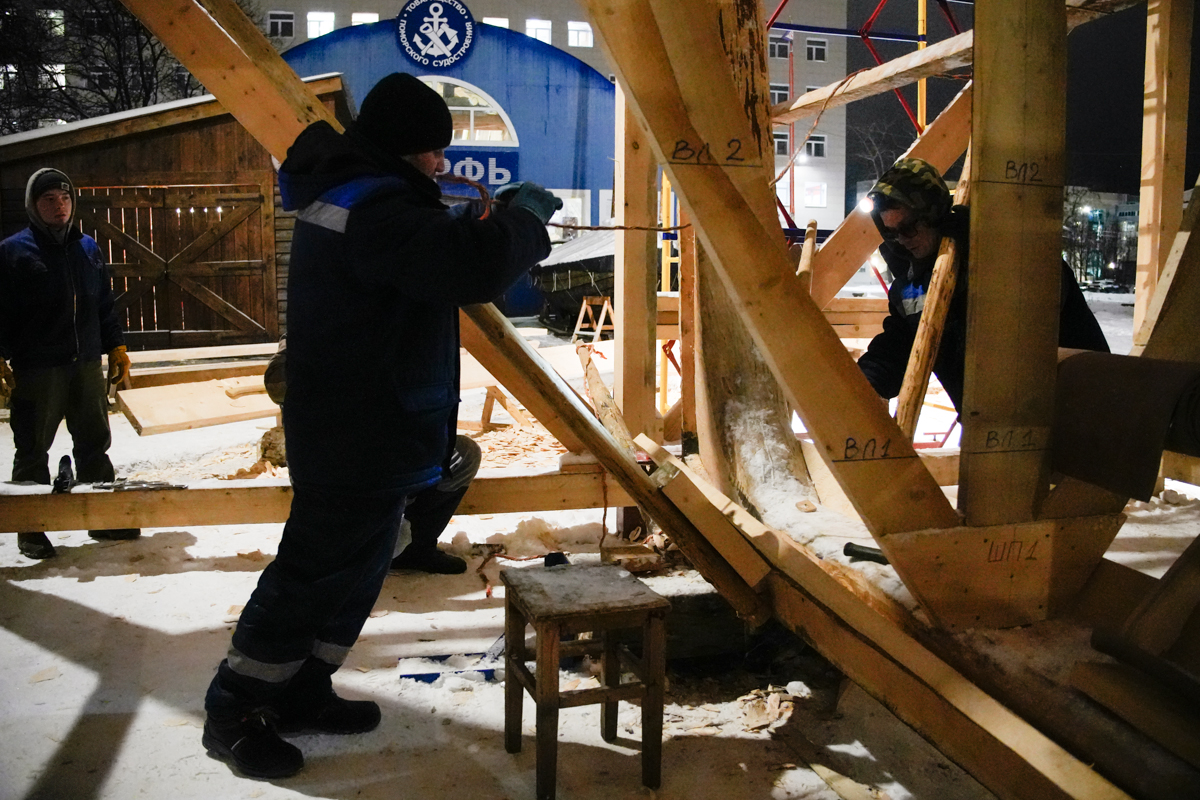 На следующей неделе начнётся электрификация навеса, а пока площадку освещают только один уличный фонарь, одна световая панелька с верфи да налобный фонарик Артёма Калинина.