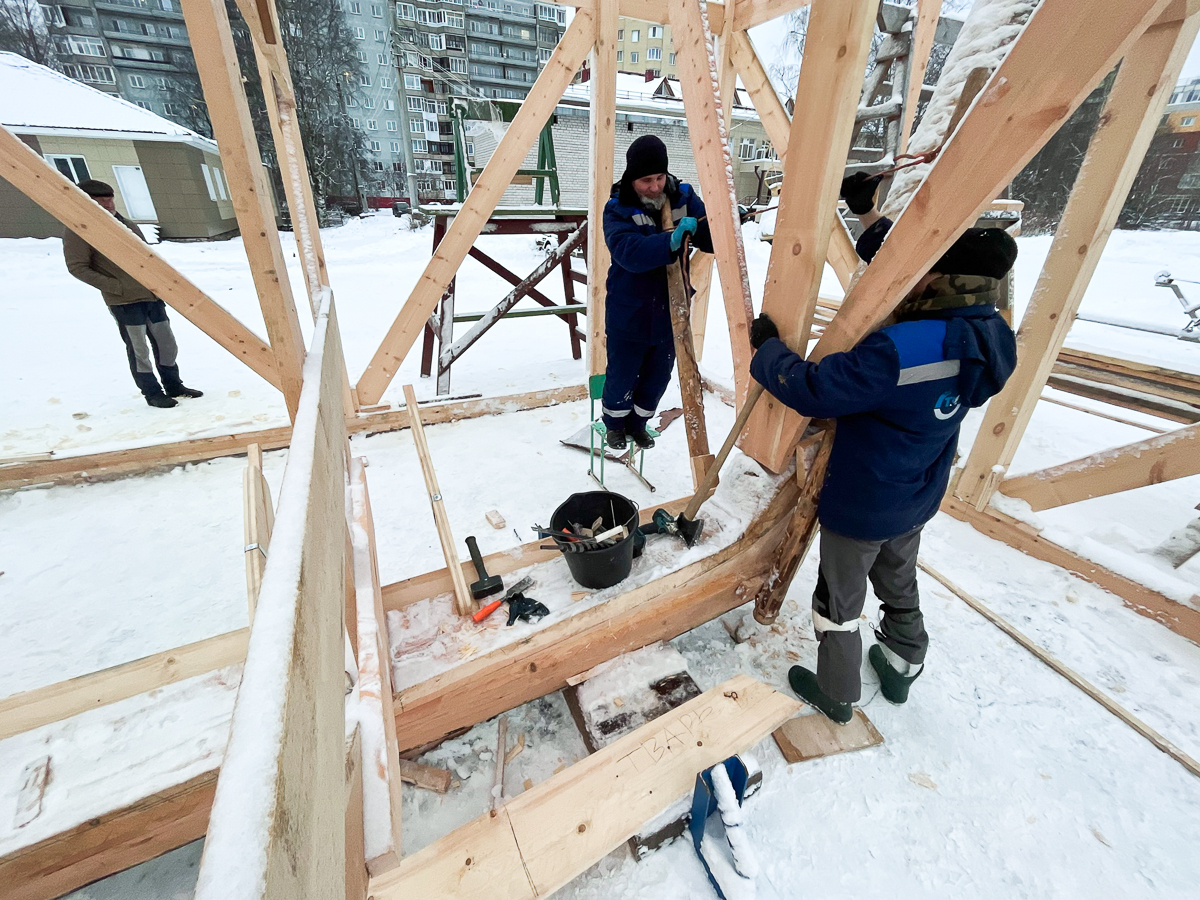 Фёдор Пильников в дни, свободные от музейной работы, пробует себя в судостроении. Вместе Мишей Тельновым они выровняли по вертикали штевни коча и закрепили их шергенями, а потом таскали доски на обшивку.