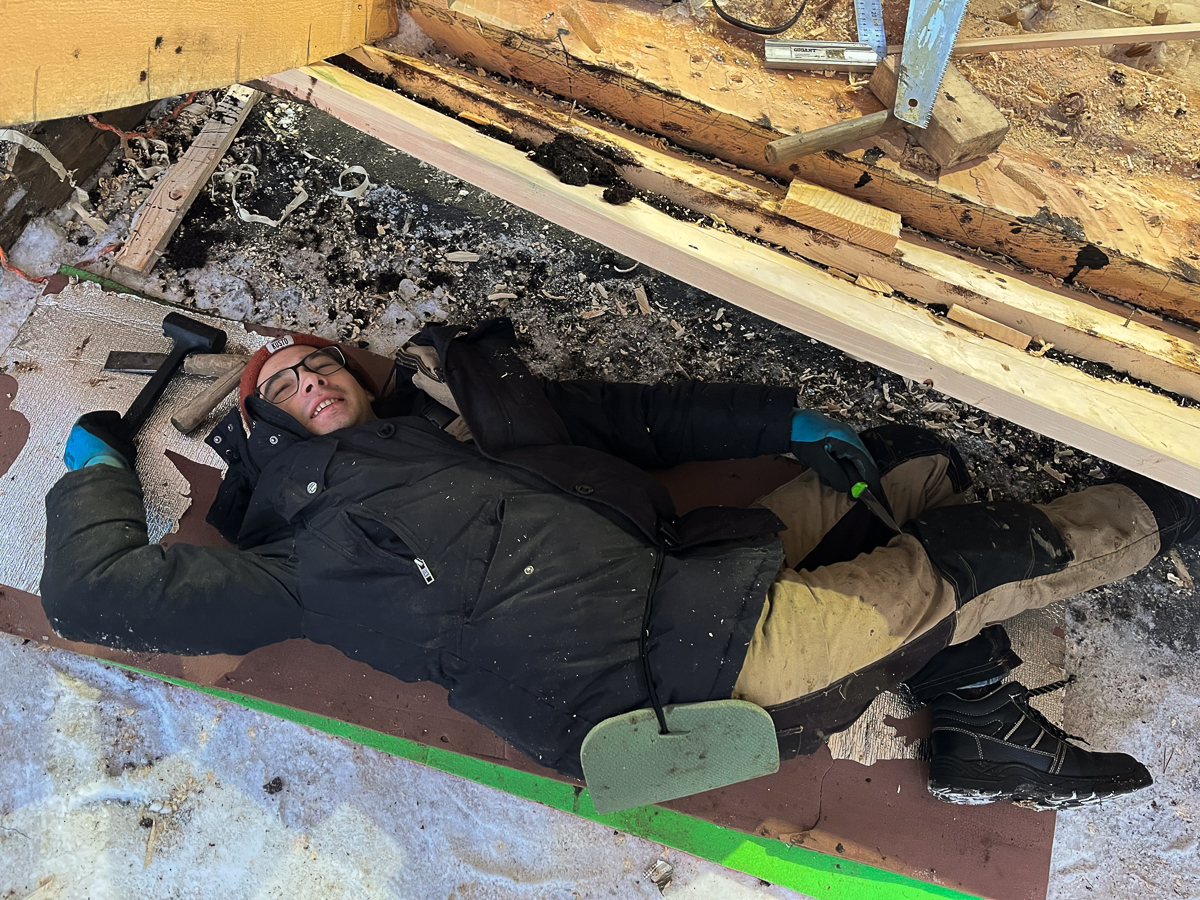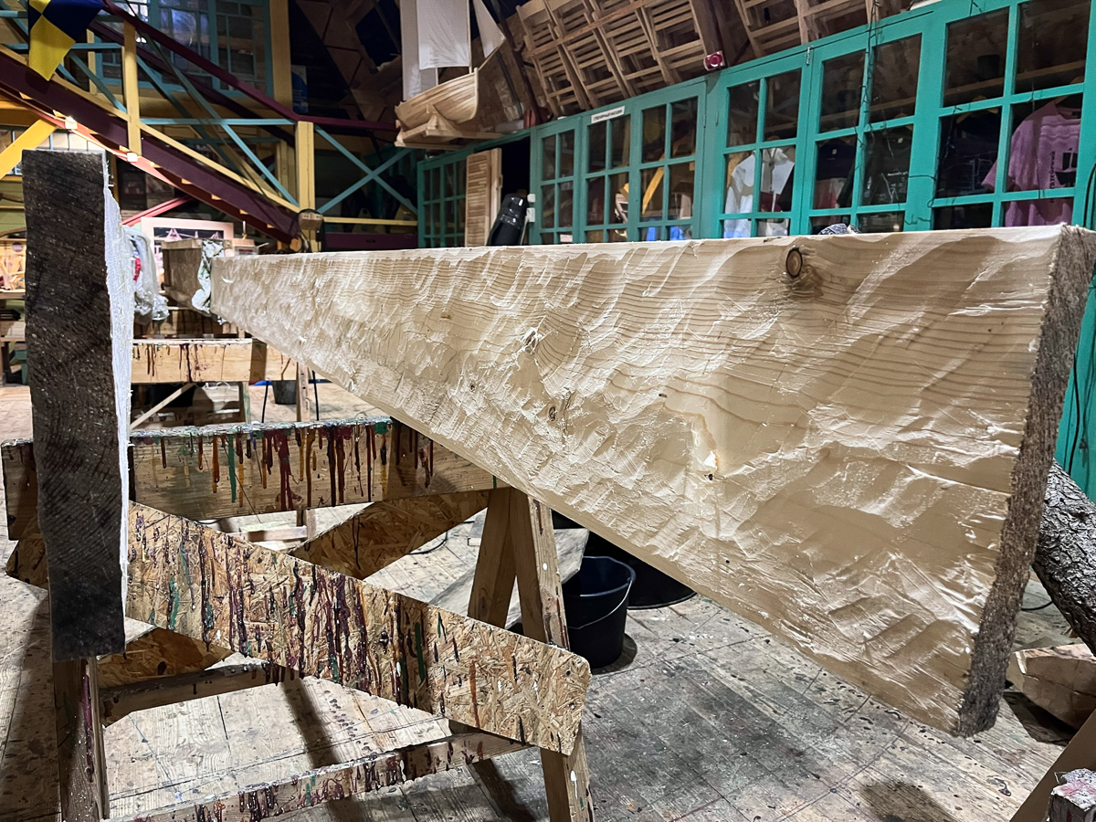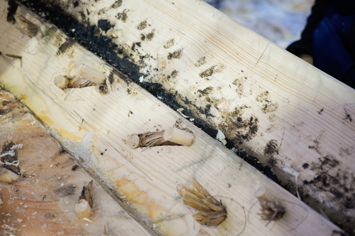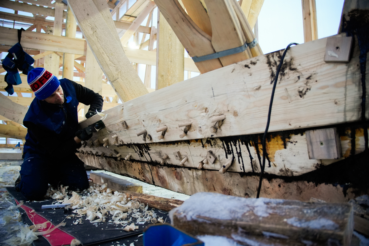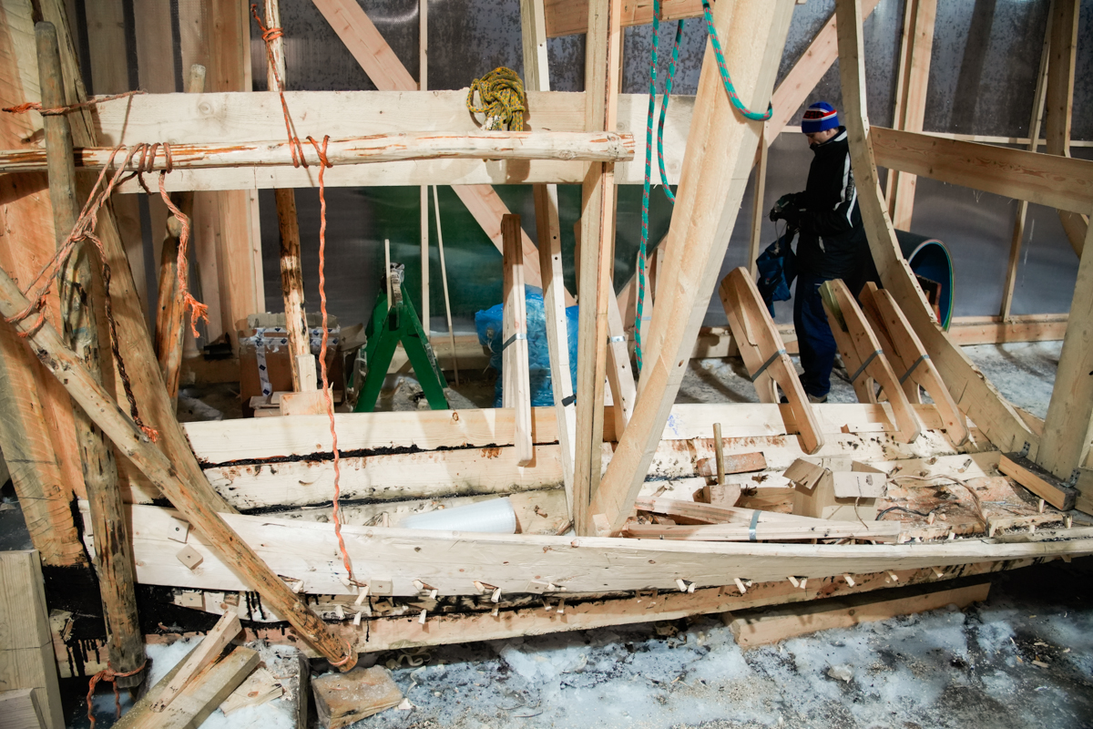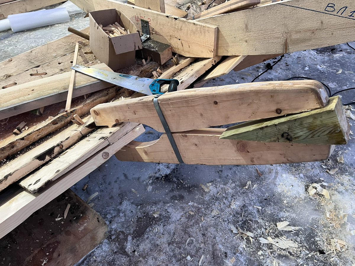 Женя и Антон сняли правую кормовую доску третьего набоя, стоявшую на вытяжке с тридцатого декабря. С края доска немного треснула. Отпилили полметра, завтра распарим и поставим заново.