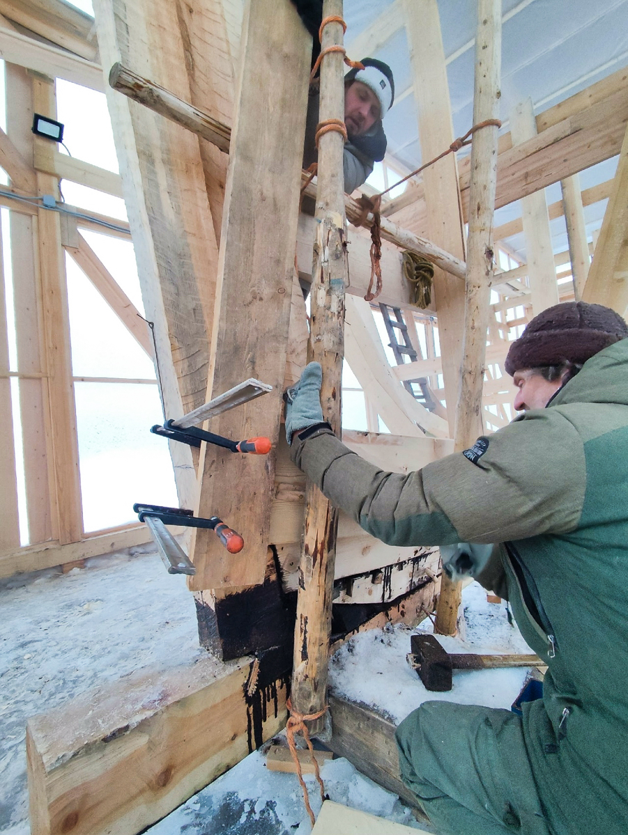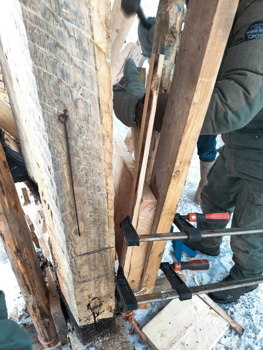 Днём эту теорию проверили, и она работает. На фото видно, что на окончание носового набоя при помощи струбцин установлена доска размером 40 на 200 на 1700 миллиметров — такой рычаг легко скрутил и притянул доску к штевню. Дальше в дело пошли штатные круглые рычаги из жердей, потом поперечная доска-рычаг и струбцины были сняты, а набой прижали вплотную к штевню при помощи клиньев.