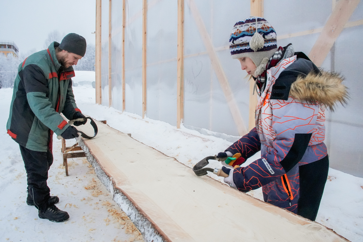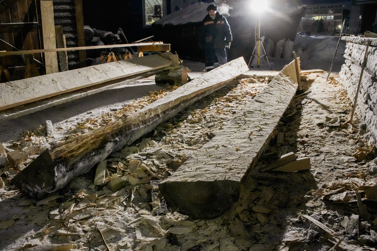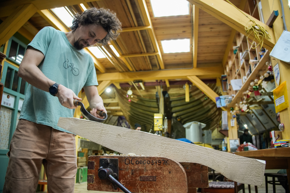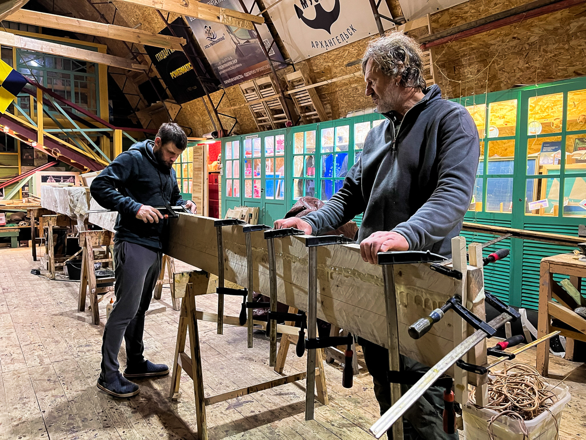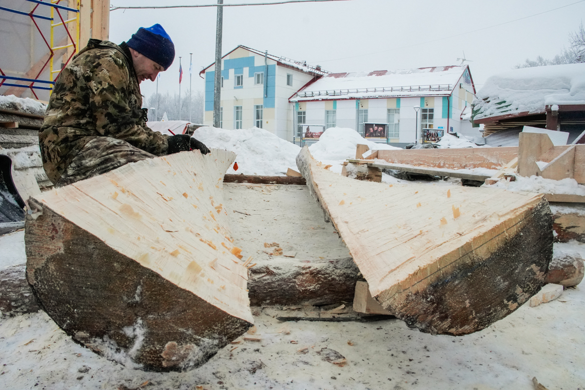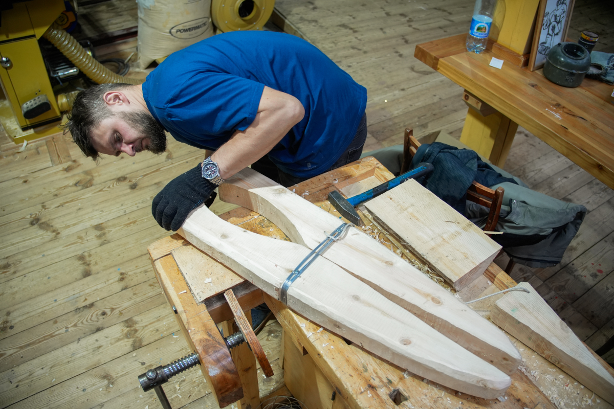 Илья Михайлов продолжает вытесывать «вертолётную» доску для придания кочу большей скорости.
