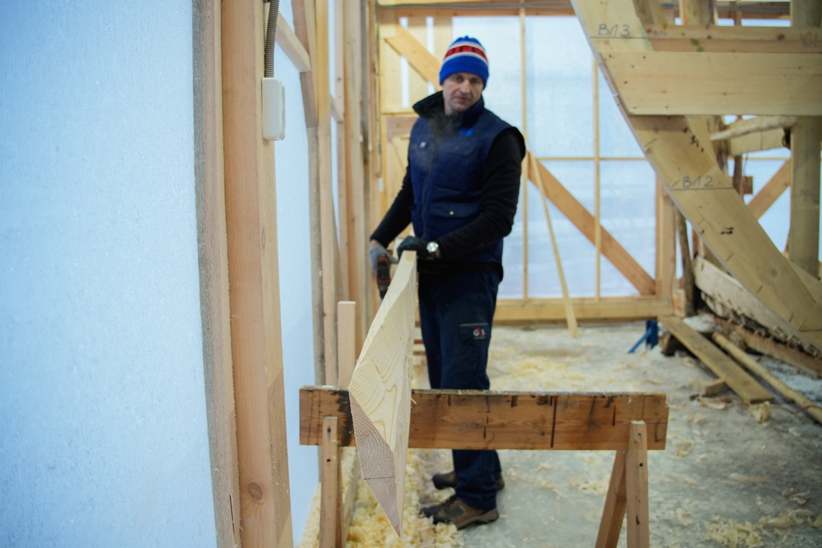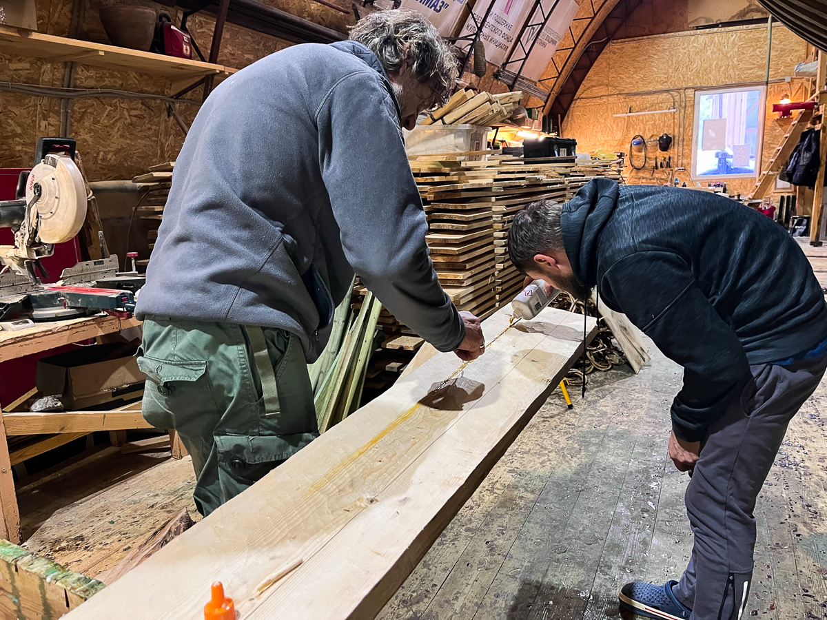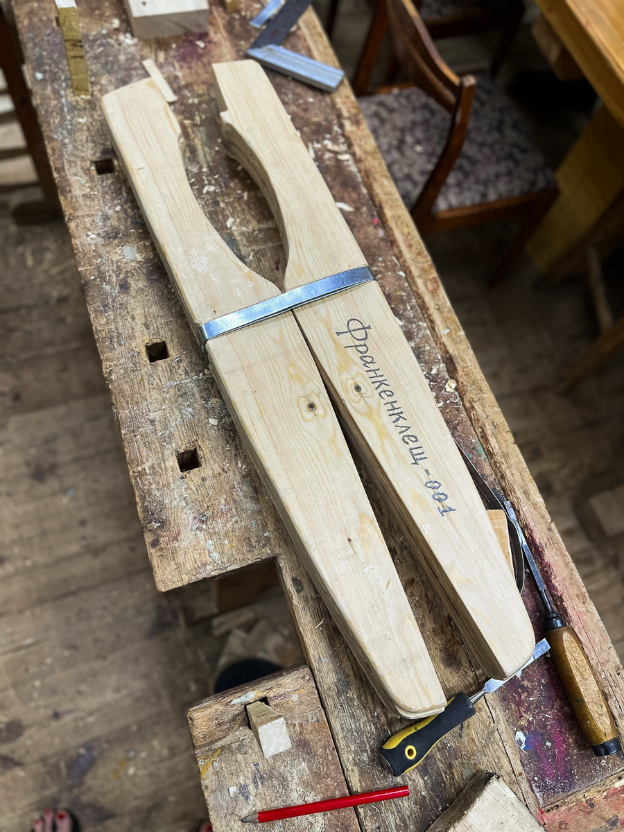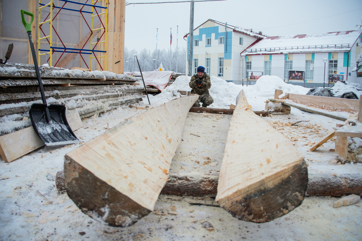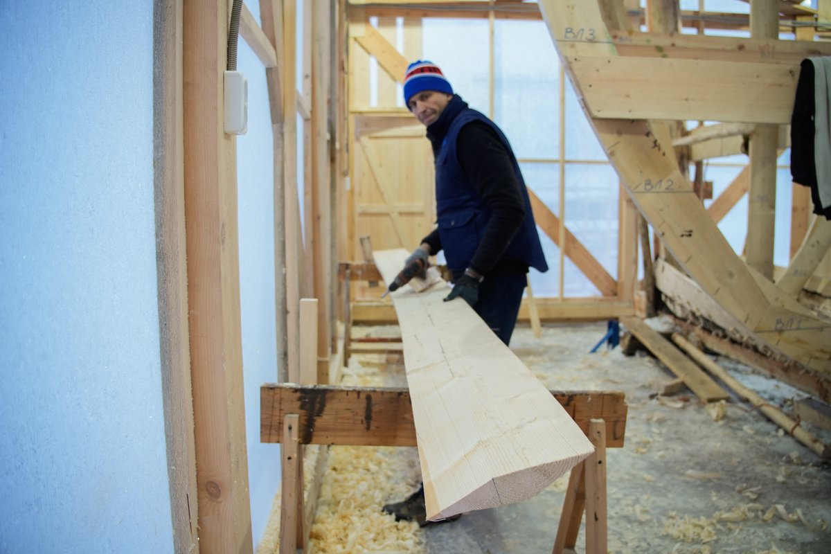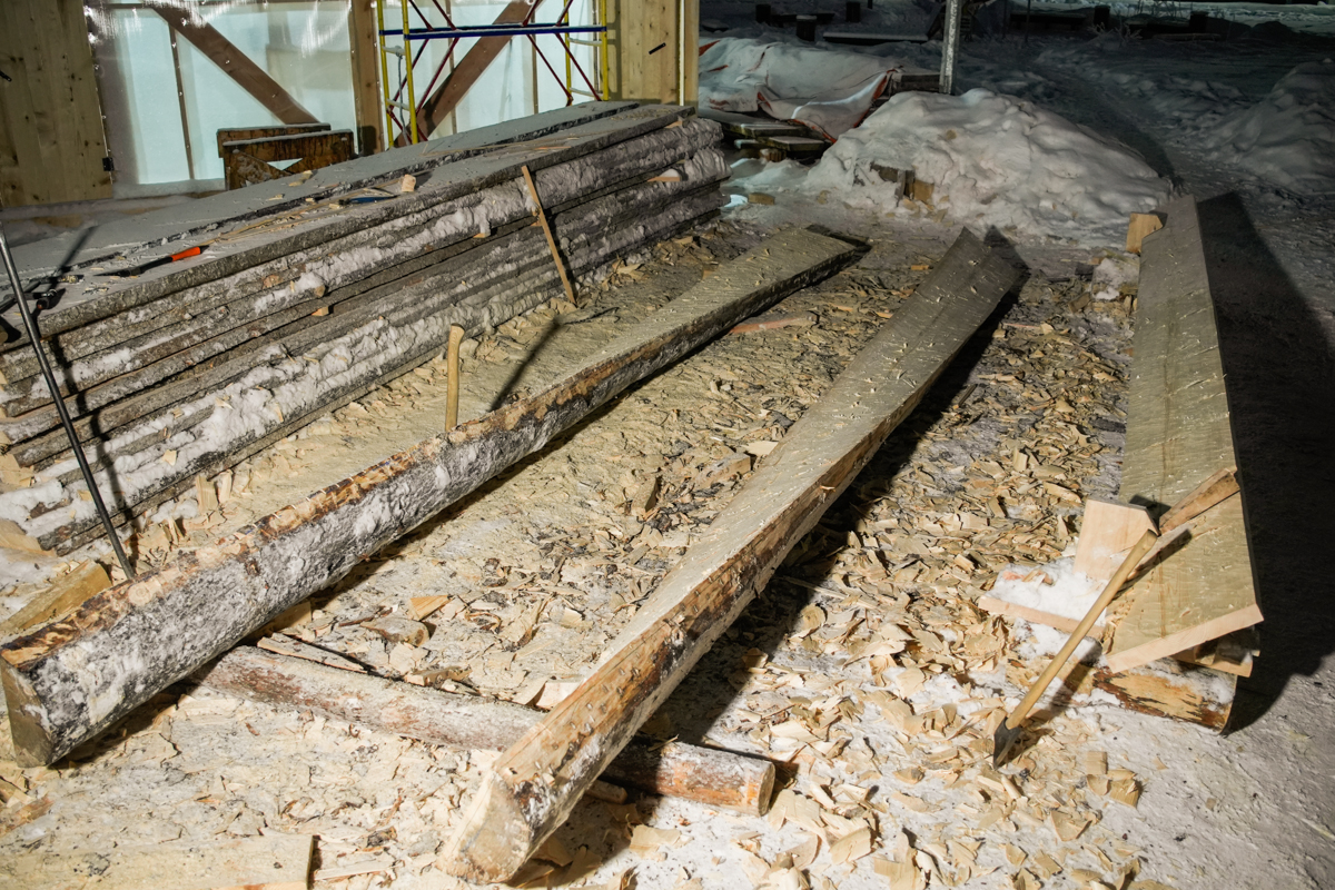 Илья Михайлов продолжает вытесывать «вертолётную» доску для придания кочу большей скорости.