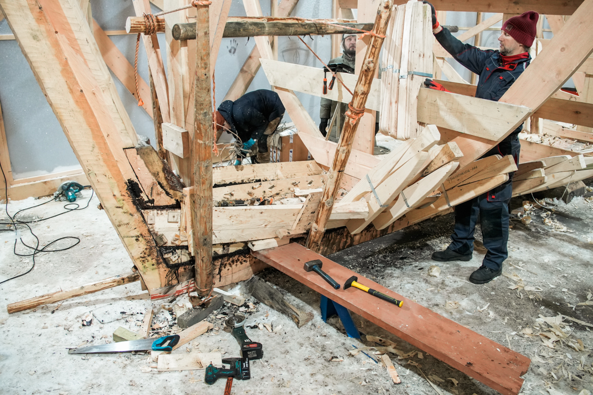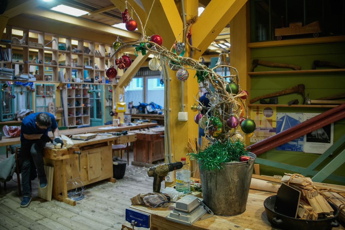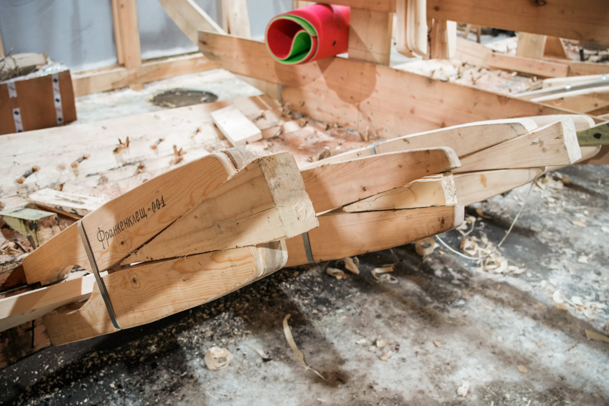 Клещи для установки набоев делаются теперь в четырнадцать рук, а штабель досок с улицы благодаря волонтерам аккуратно переместился на верфь.