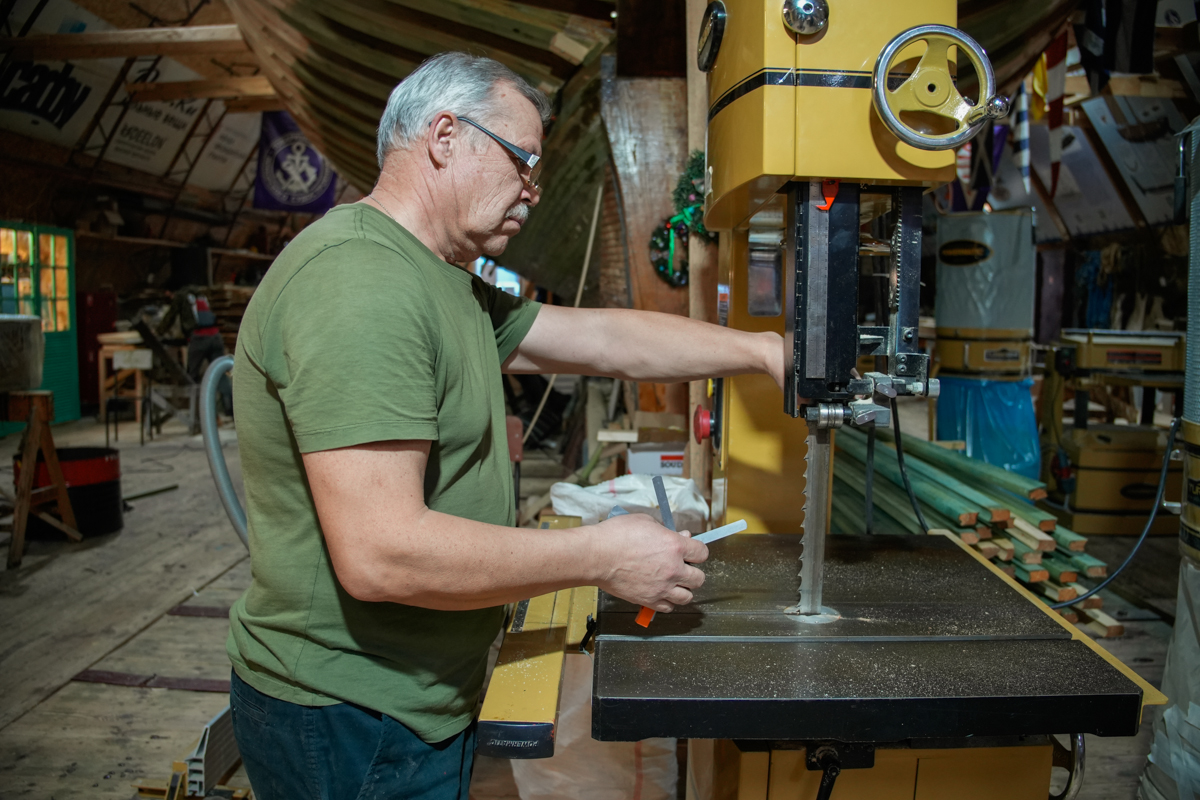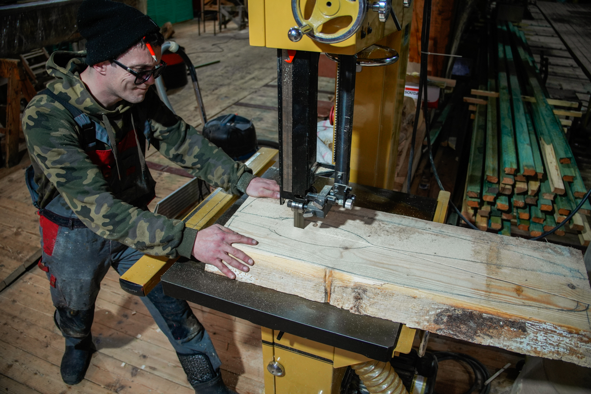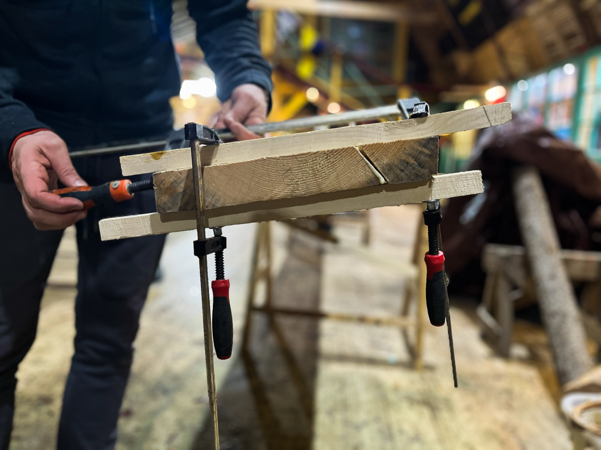 На заднем плане при выпиливании заготовки клещей торцовка, эксплуатируемая Артёмом Калининым, издает характерный визг, от которого вся верфь оборачивается. «Обана! Изломал, изломал!» — нараспев произносит механик. Возможно, у него на очереди новый пациент. Артём Калинин переходит на отрегулированную ленту и продолжает выпиливать заготовки на ней.