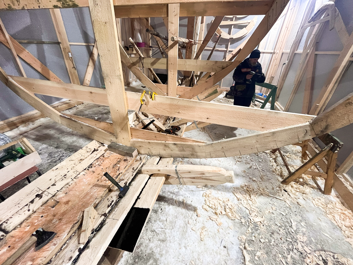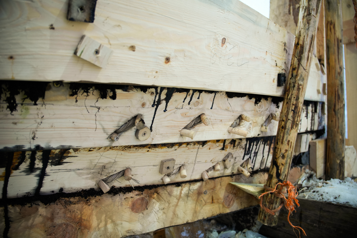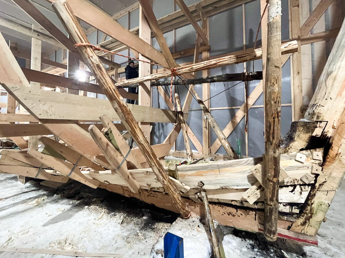 За два подхода вернули на место левую носовую доску второго набоя. Завтра будем ставить третью.