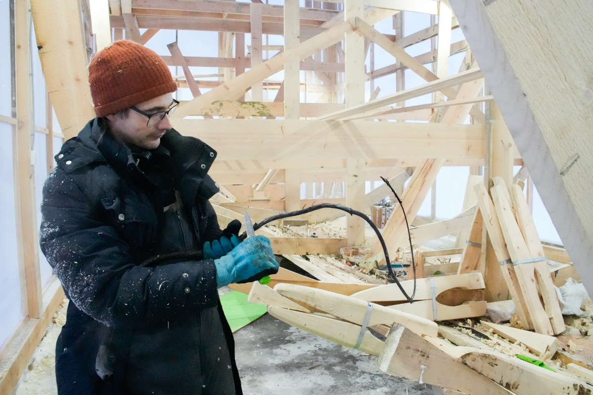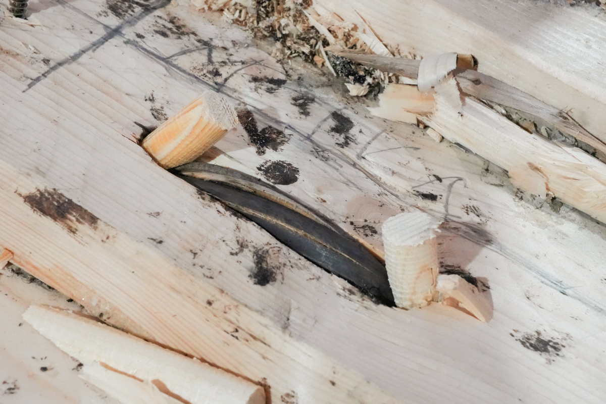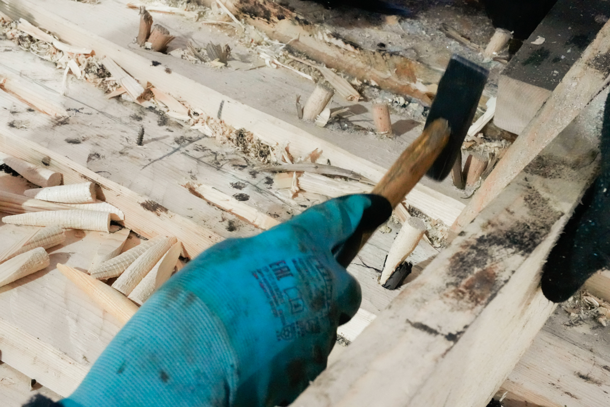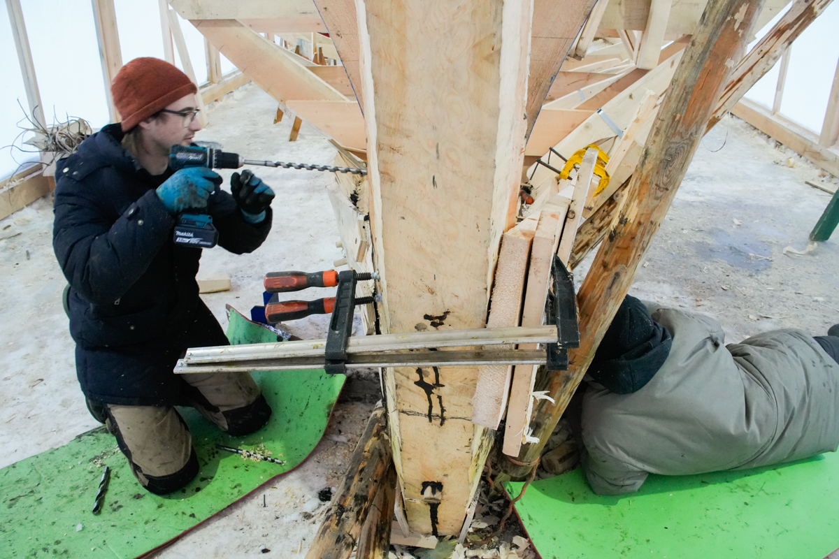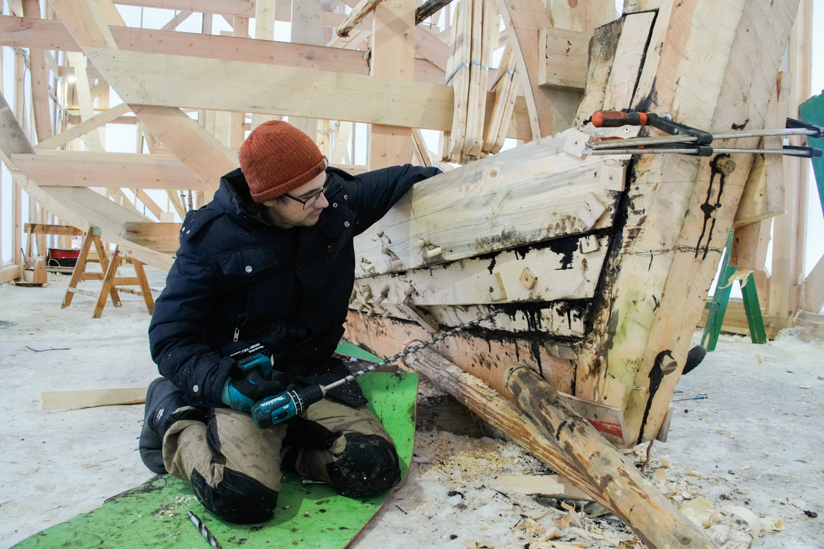 Иван задумчиво прицеливается полуметровым сверлом в набой. С другой стороны лодки ничего не подозревающий Антон Спивак вырезает стамеской выемки под будущие стежки.