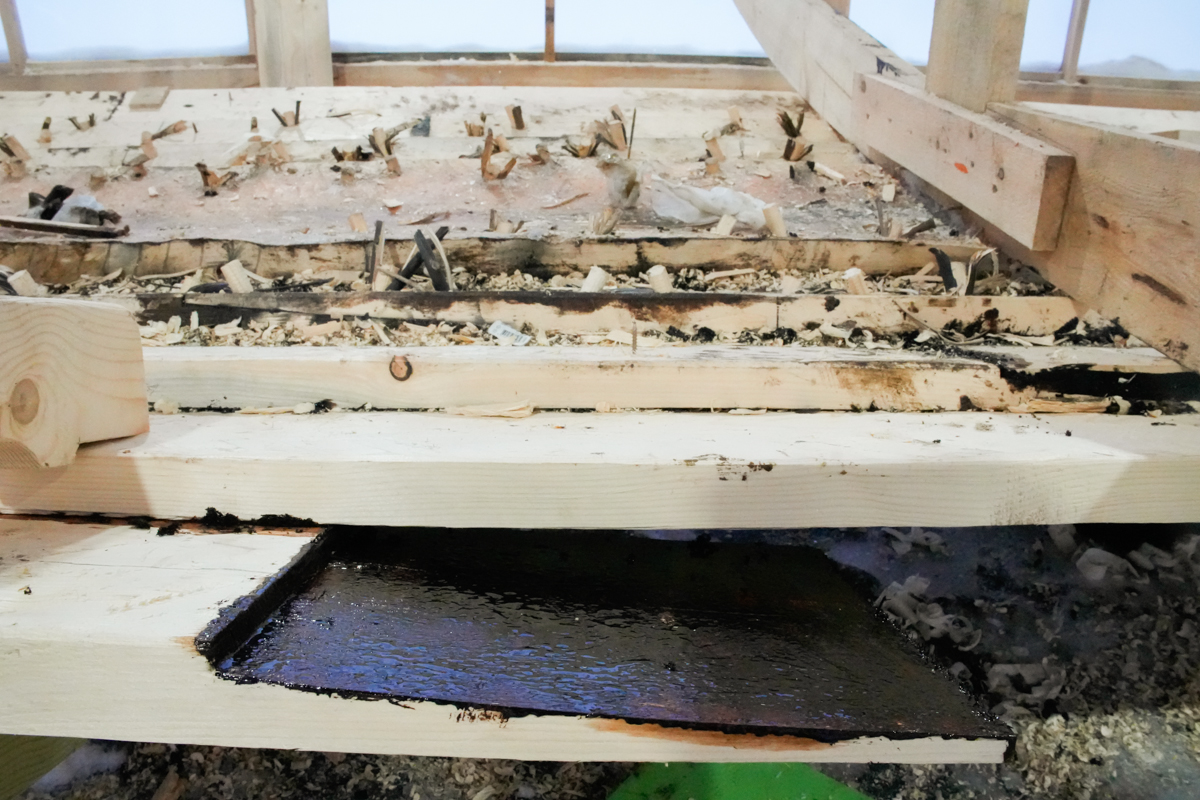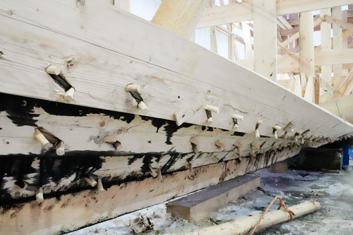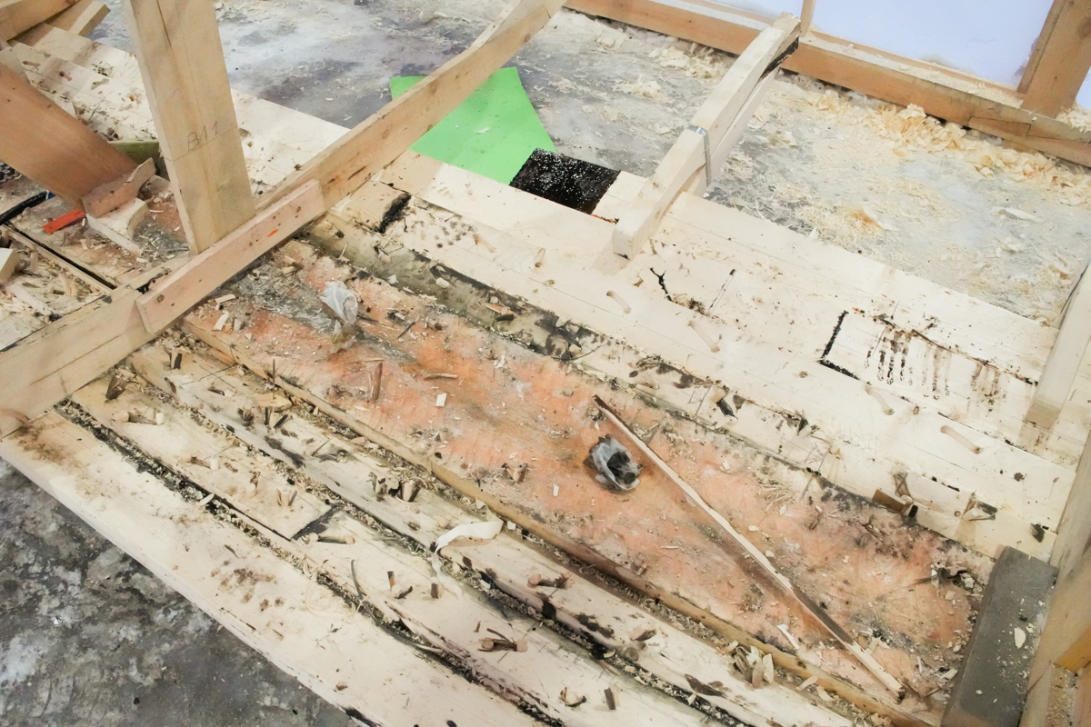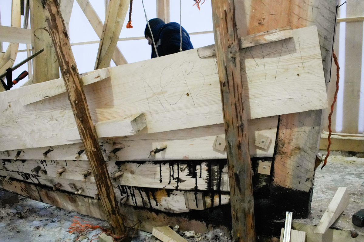 Сегодня вышли на четвёртый, поставили левую носовую доску на мох и смолу, аналогичную кормовую — на вытяжку.