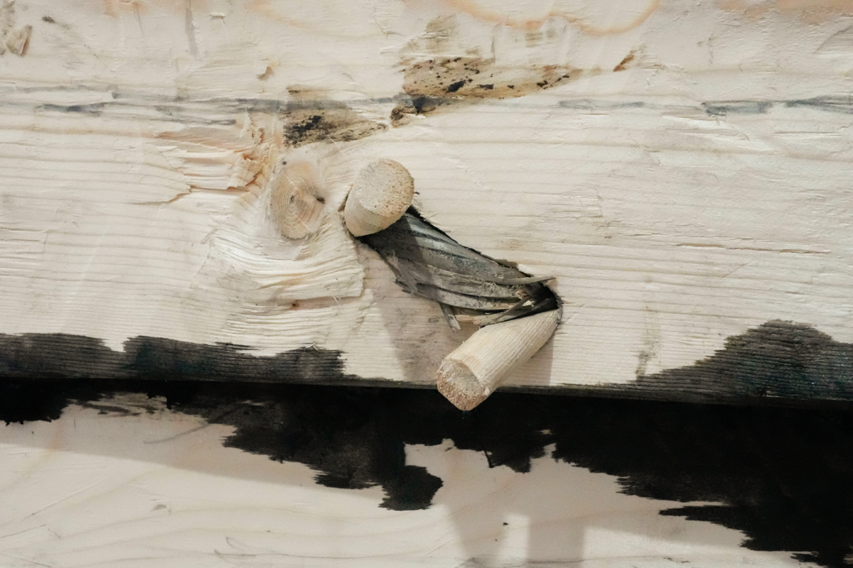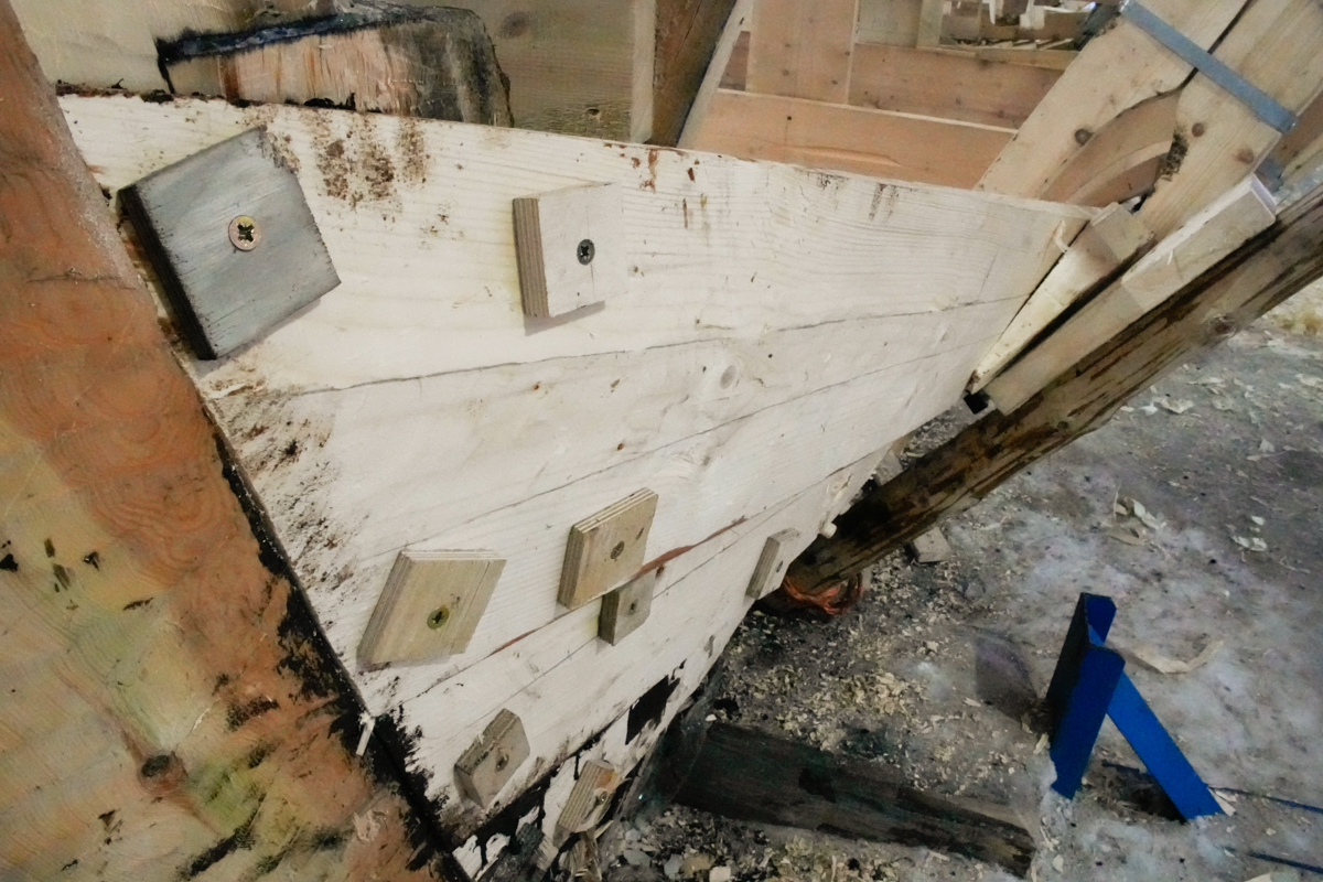 Ваня обдумывает, как сверлить отверстия под вицу в районе ахтерштевня коча. Этот участок представляет собой, что называется, задачу со звёздочкой. Во-первых, здесь одна вица будет проходить сразу через оба набоя и киль / штевень (ветка пройдёт изнутри в левую и правую доски и вернётся внутрь). Во-вторых, такая вица будет очень длинной и, следовательно, очень толстой — 2,5-3 см в диаметре. В третьих, нам нужно будет обойти пару медных гвоздей, заколоченных нами в особенно сложные места примыкания набоя к штевню.