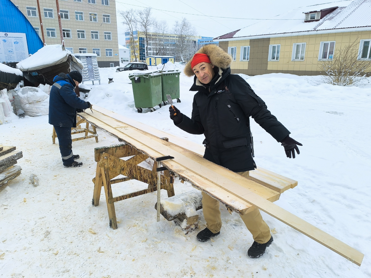 Егор бесперерывно поставляет новые тёсаные доски. Только щепки летят.