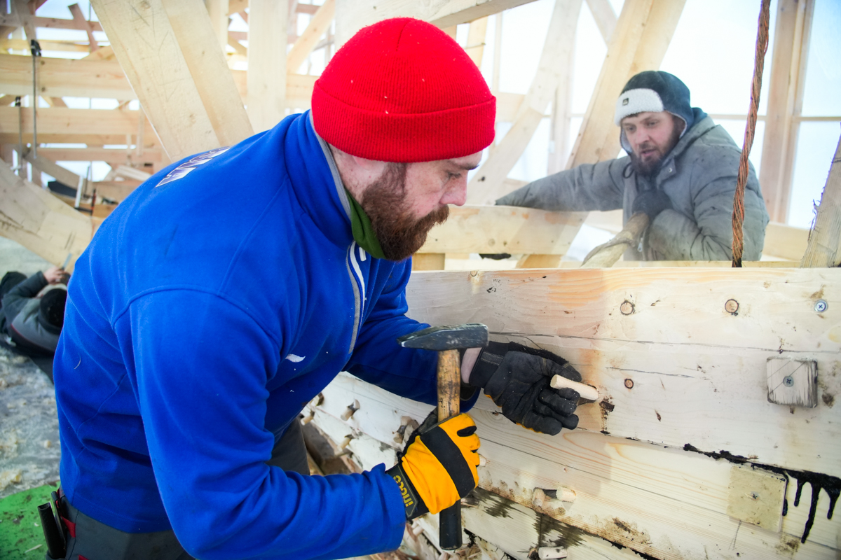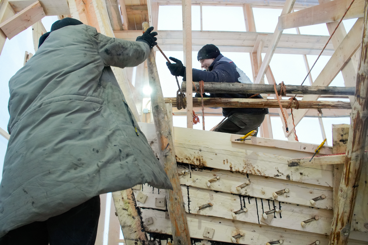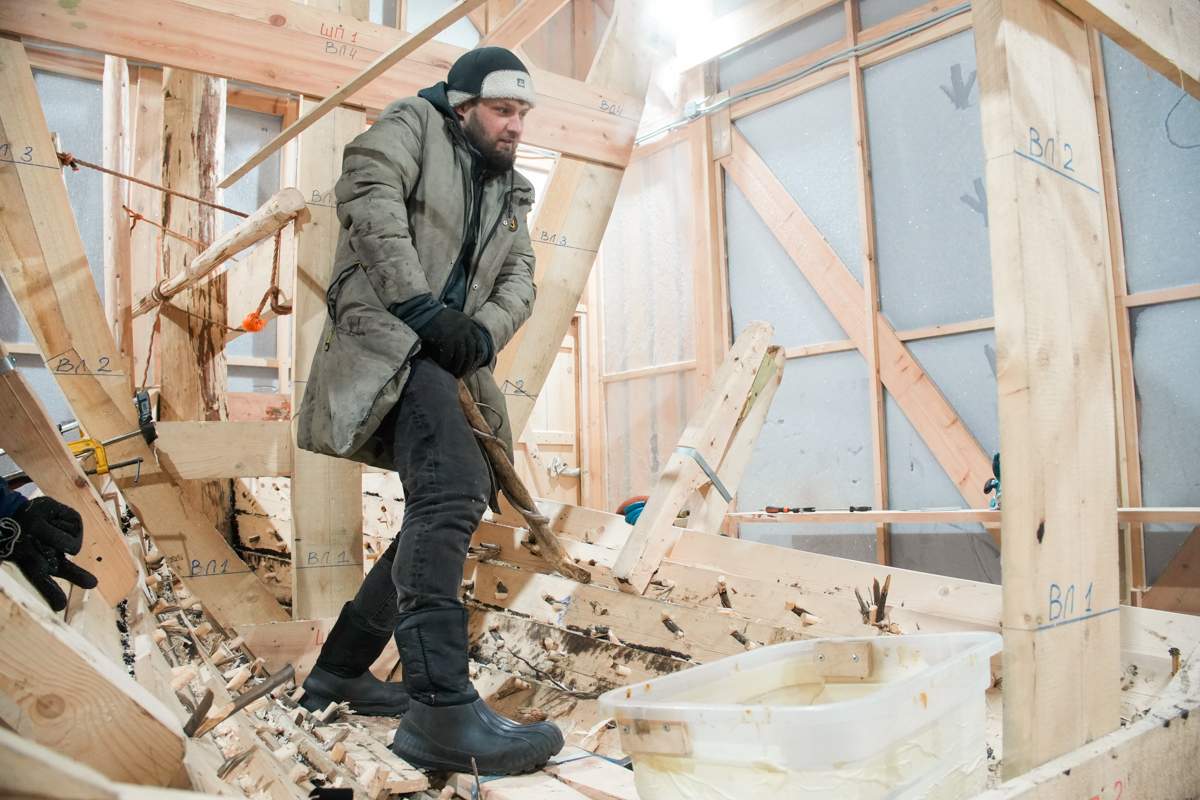 Днём поставили на мох и смолу левую и правую носовые доски шестого набоя.