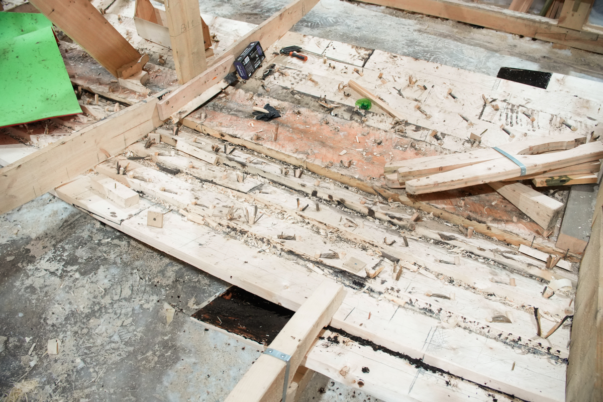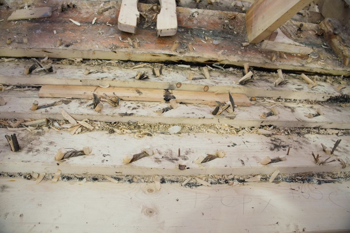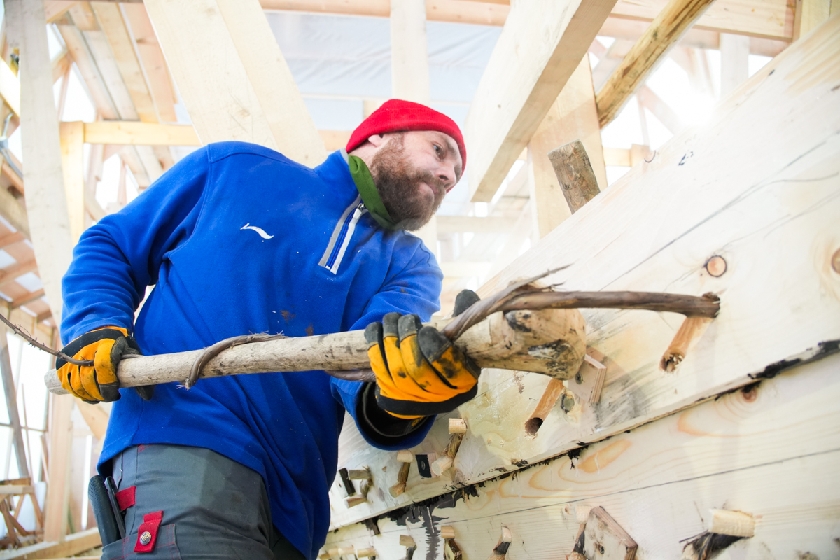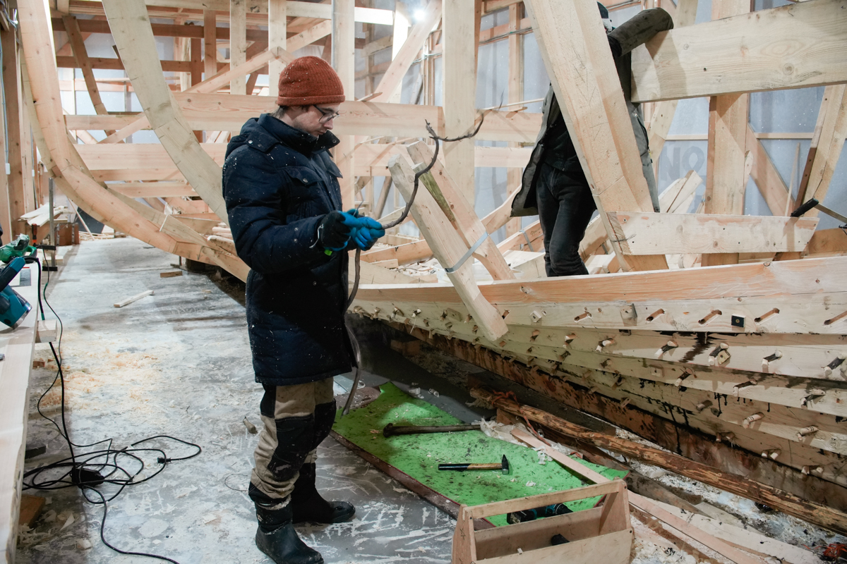 Днём поставили на мох и смолу левую и правую носовые доски шестого набоя.