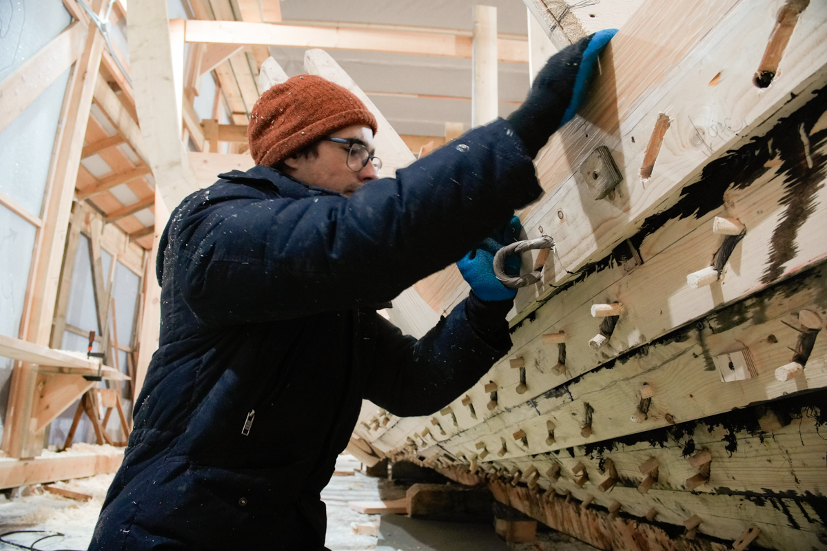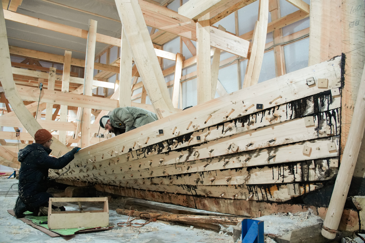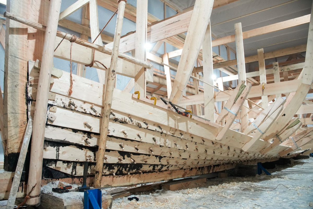 Поставили на мох и смолу правую и левую кормовые доски шестого набоя.